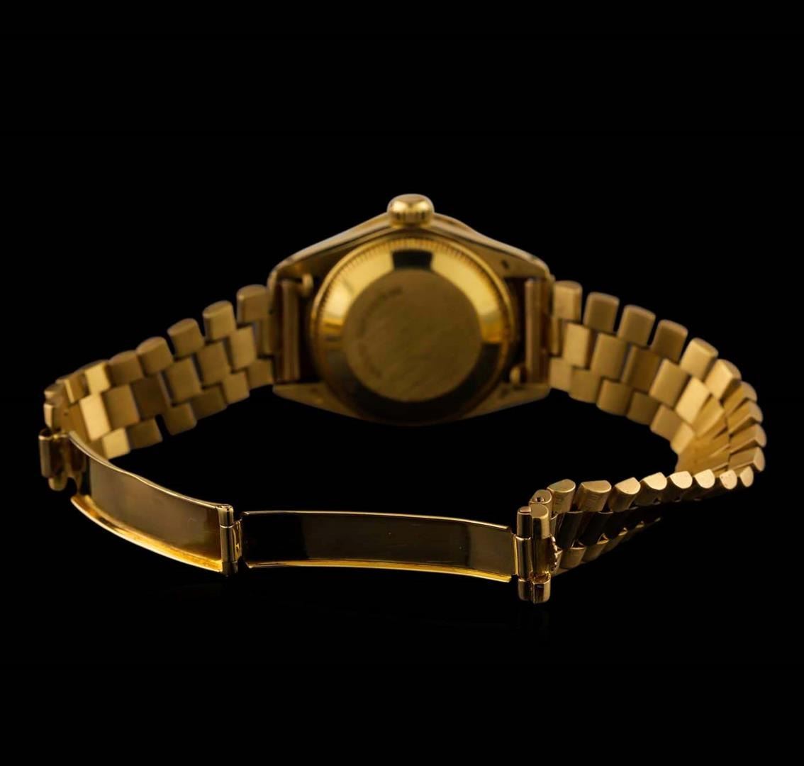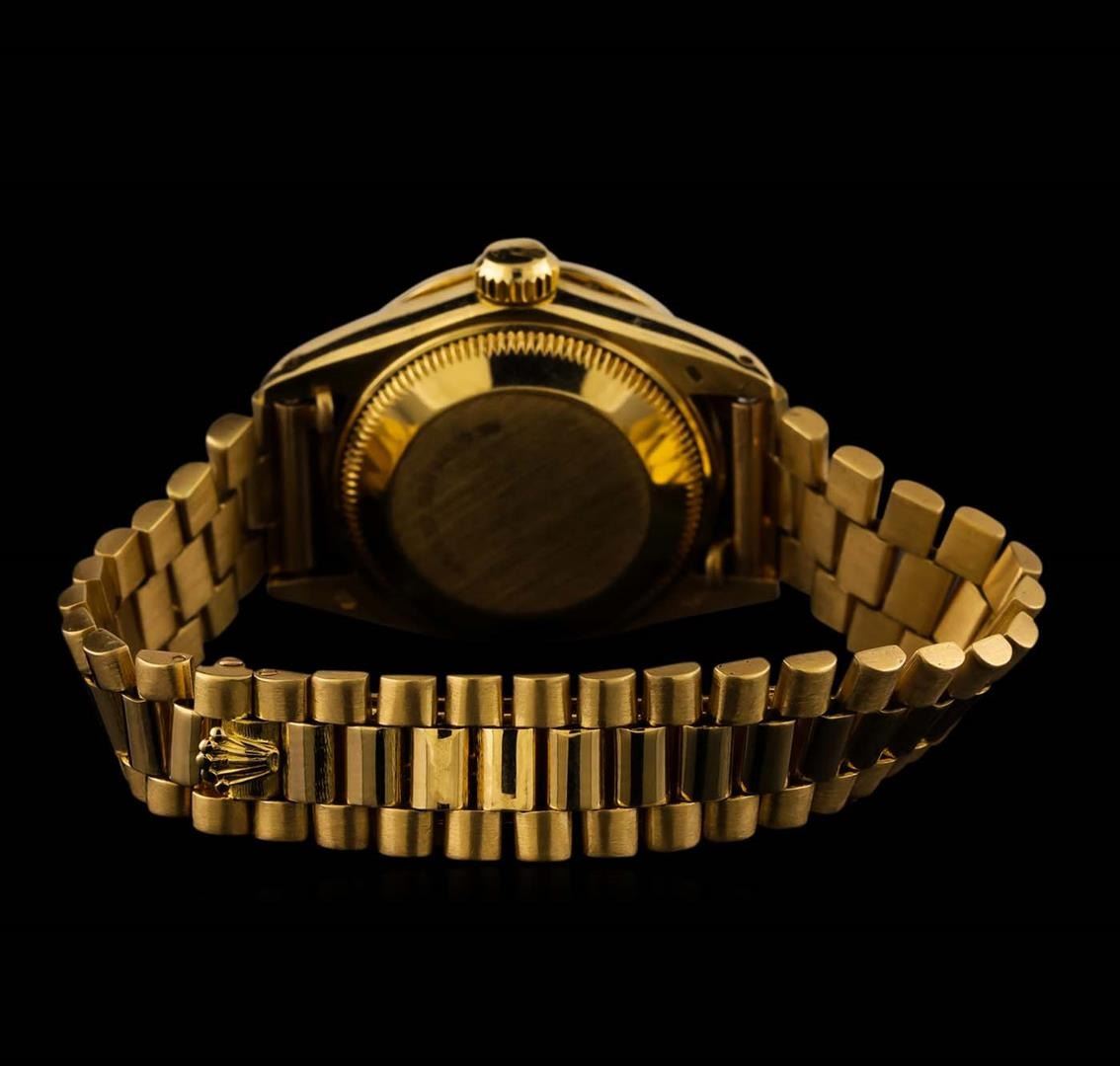 One ladies, hand crafted & machine milled Rolex DateJust model wristwatch electronically tested 18KT yellow gold, Circa: 1979, Case: 26mm oyster, Crown: twinlock with logo, Custom Bezel: diamond set, Custom Crystal: acrylic cyclops lens. The logo and markings in the bracelet clasp are Rolex factory stampings. In the past, Rolex has produced parts including clasps in locations other than Switzerland. That is why there are a variation to the look, feel, and weight of the Rolex parts that were made in different areas of the world. Today, however everything is produced in Switzerland. The stamping K18.D'A inside of a rectangular frame was created for the Rolex market in Argentina during the 1970's. Movement: superlative chronometer. Custom Dial: mother of pearl, with baton hands, & diamond markers, Date Display: 3 o'clock position, non-quick set, Bracelet: 18KT yellow gold, bright and satin finish. Condition: G-4 Average. Five and three quarter inch length. Concealed deployment clasp, with logo. Containing: Forty prong set round brilliant cut diamonds, measuring an average of 1.50mm in diameter, approximate total weight = 0.40ct. Set & graded in the bezel Clarity SI-1 to SI-2 Average. Color: G - H. Total Weight of Diamonds 0.40ct. Total Weight of Watch 61.31 grams. AIG Appraised at $16,550.00.
