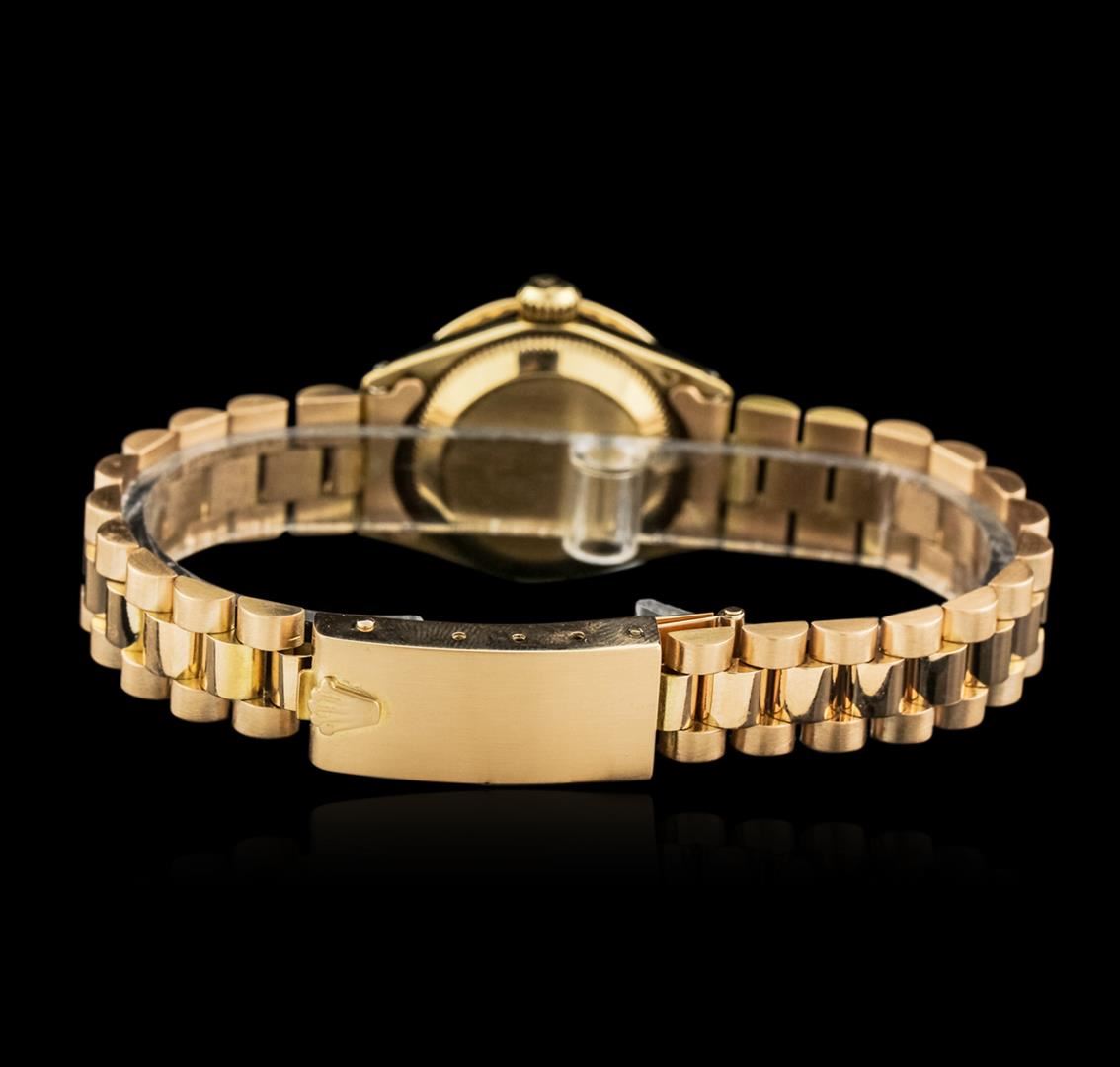 One ladies, hand crafted & machine milled Rolex DateJust model, wristwatch electronically tested 18KT yellow gold, Circa: 1962, Case: 25mm oyster, Crown: twinlock with logo, Custom Bezel: diamond set, Crystal: acrylic cyclops lens. Movement: superlative chronometer. Custom Dial: Champagne color; with baton hands, and diamond indices, Date Display: 3 o'clock position, non-quick set, Custom Bracelet: 18KT yellow gold Lady President style, Condition: G-4 Average. Bright & satin finish. Seven inch length. Custom clasp, with logo. Containing: Forty prong set round brilliant cut diamonds, measuring an average of 1.60mm in diameter, approximate total weight = 0.60ct. Set & graded in the bezel Clarity VS-2 to SI-2. Color: G -H. Total Weight of Diamonds 0.60ct. Total Weight of Watch 60.91 grams. AIG Appraised at $13,050.00.