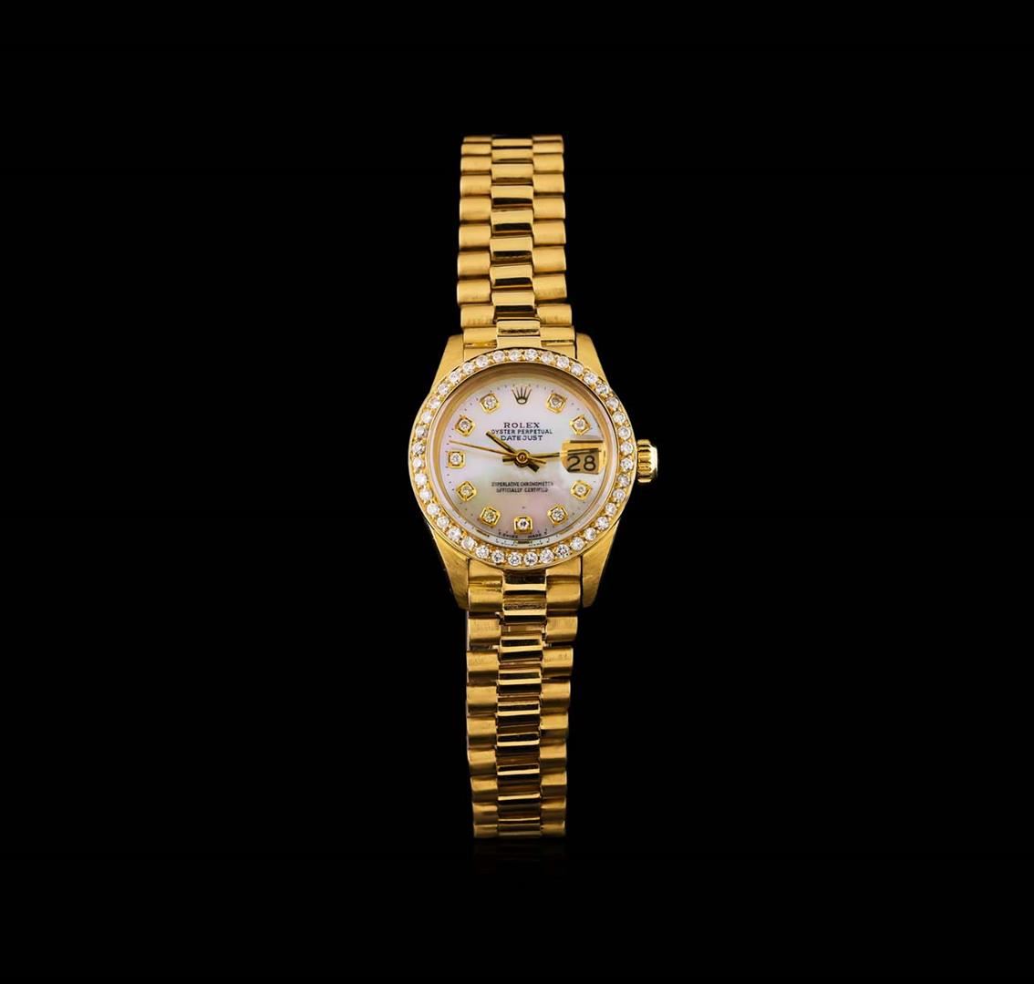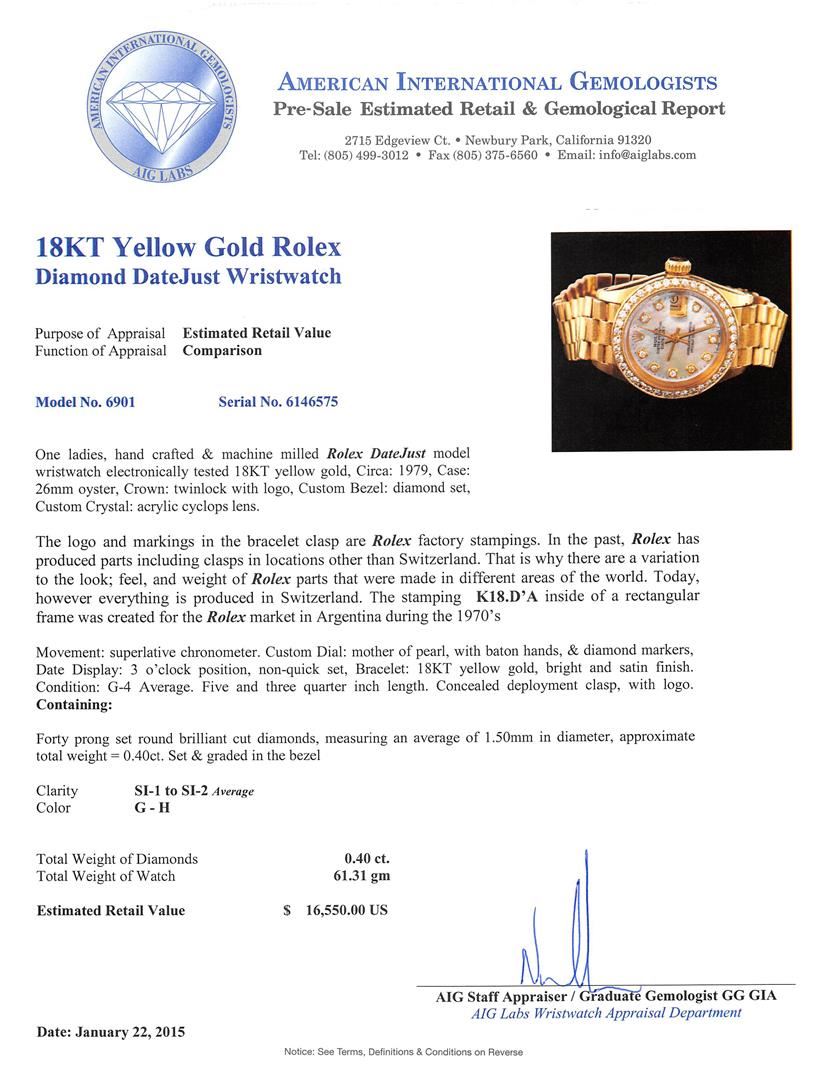 One ladies, hand crafted & machine milled Rolex DateJust model wristwatch electronically tested 18KT yellow gold, Circa: 1979, Case: 26mm oyster, Crown: twinlock with logo, Custom Bezel: diamond set, Custom Crystal: acrylic cyclops lens. The logo and markings in the bracelet clasp are Rolex factory stampings. In the past, Rolex has produced parts including clasps in locations other than Switzerland. That is why there are a variation to the look, feel, and weight of the Rolex parts that were made in different areas of the world. Today, however everything is produced in Switzerland. The stamping K18.D'A inside of a rectangular frame was created for the Rolex market in Argentina during the 1970's. Movement: superlative chronometer. Custom Dial: mother of pearl, with baton hands, & diamond markers, Date Display: 3 o'clock position, non-quick set, Bracelet: 18KT yellow gold, bright and satin finish. Condition: G-4 Average. Five and three quarter inch length. Concealed deployment clasp, with logo. Containing: Forty prong set round brilliant cut diamonds, measuring an average of 1.50mm in diameter, approximate total weight = 0.40ct. Set & graded in the bezel Clarity SI-1 to SI-2 Average. Color: G - H. Total Weight of Diamonds 0.40ct. Total Weight of Watch 61.31 grams. AIG Appraised at $16,550.00.