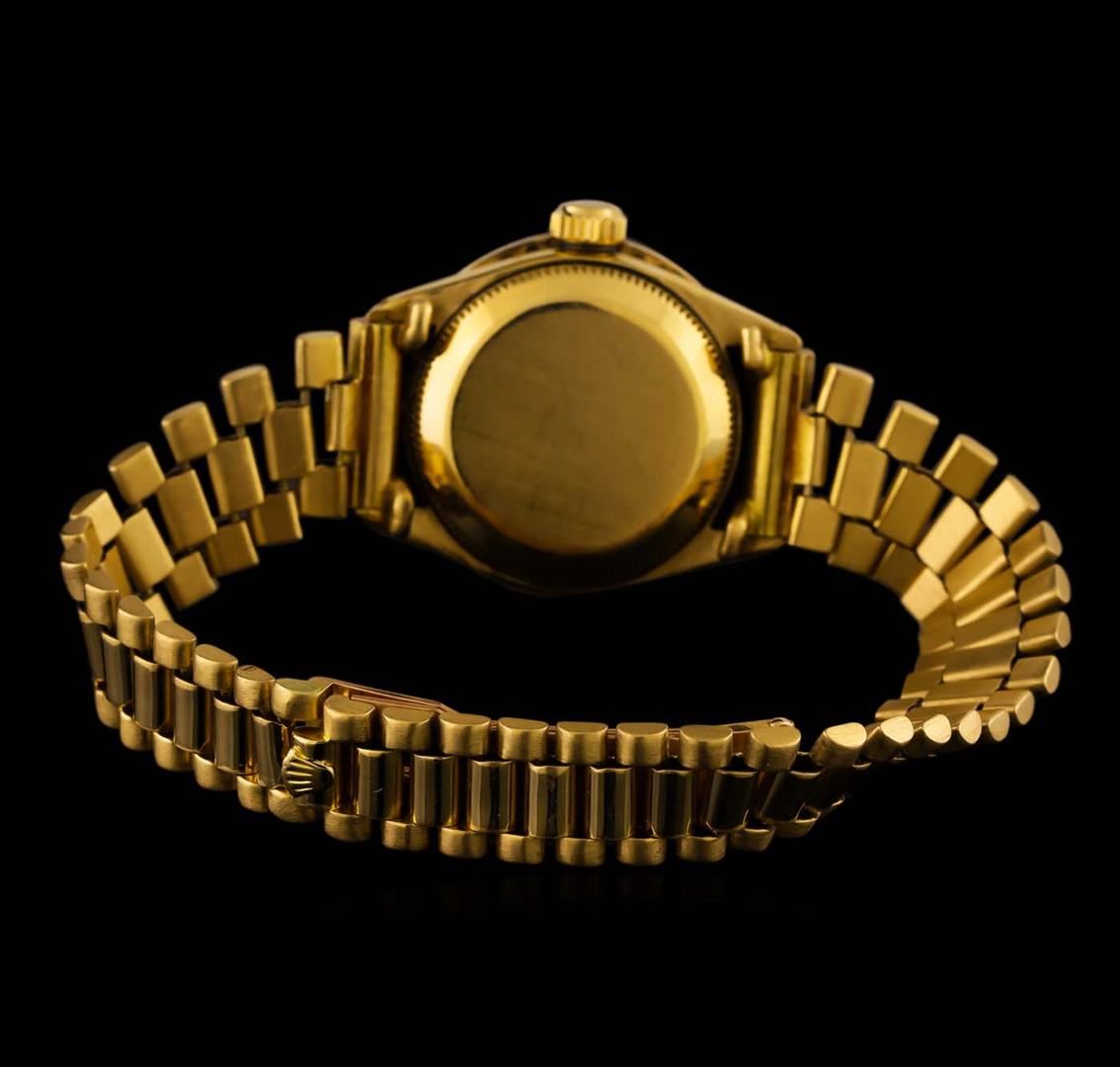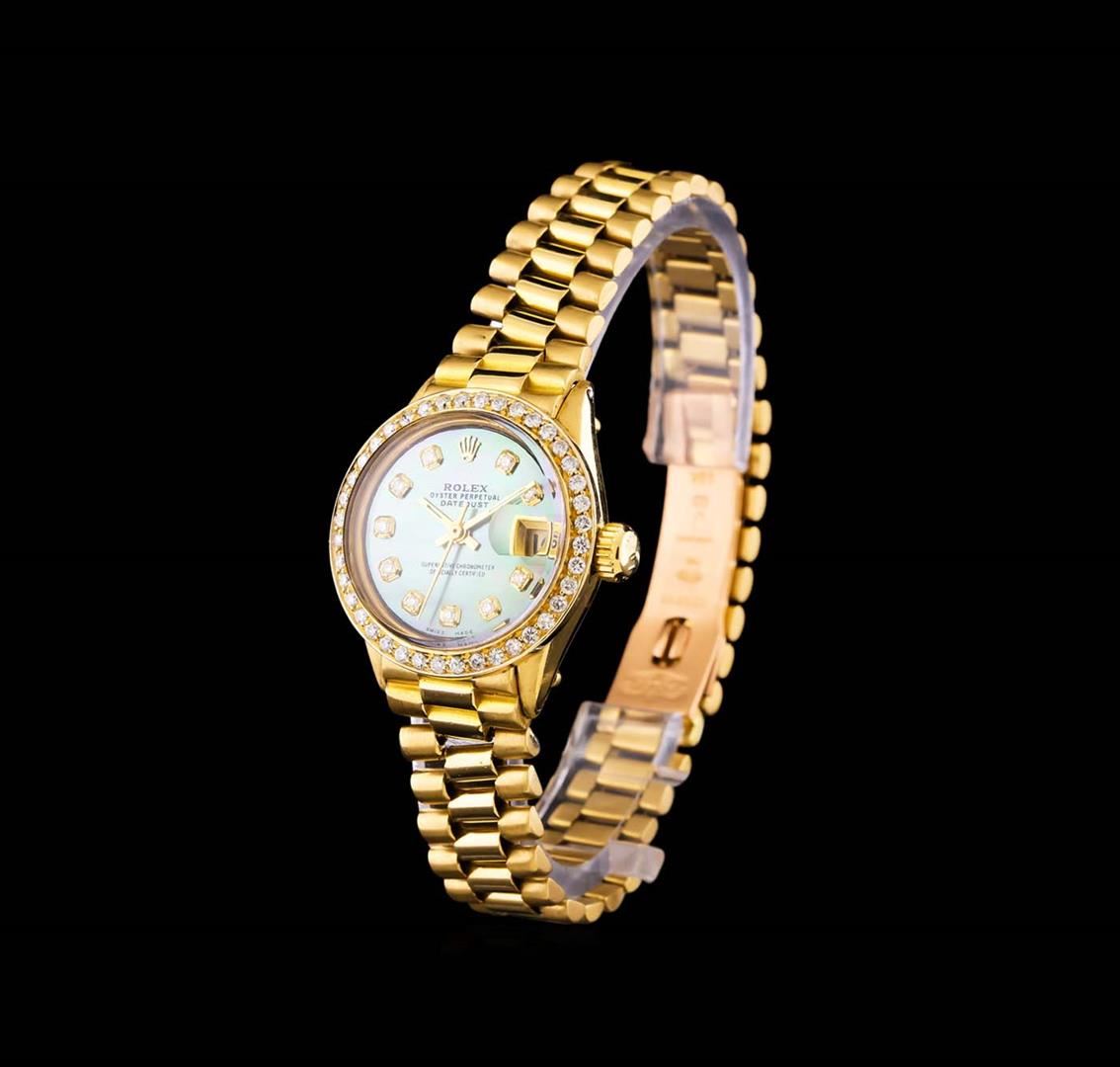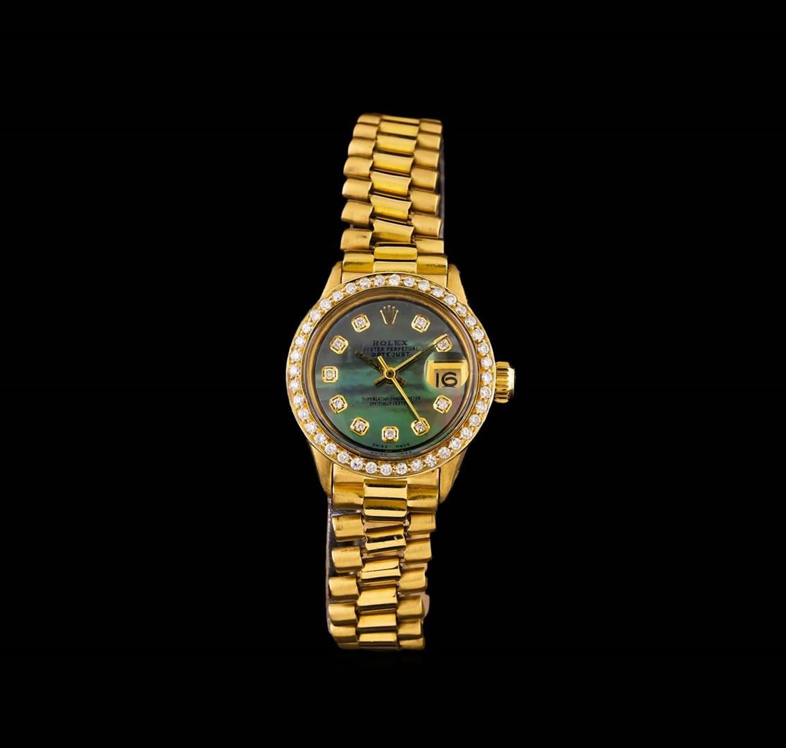 One ladies, hand crafted & machine milled Rolex DateJust model wristwatch electronically tested 18KT yellow gold, Circa: 1961, Case: 25mm oyster, Crown: twinlock with logo, Custom Bezel: diamond set, Custom Crystal: acrylic cyclops lens. Movement: superlative chronometer. Custom Dial: dark mother of pearl, with baton hands, & diamond markers, Date Display: 3 o'clock position, non-quick set, Bracelet: 18KT yellow gold, bright and satin finish. Condition: G-4 Average. Six and one half inch length. Concealed deployment clasp, with logo. Containing: Forty prong set round brilliant cut diamonds, measuring an average of 1.55mm in diameter, approximate total weight = 0.44ct. Set & graded in the bezel Clarity SI-1 to SI-2 Average. Color: G - H. Total Weight of Diamonds 0.44ct. Total Weight of Watch 60.00 grams. AIG Appraised at $17,050.00.