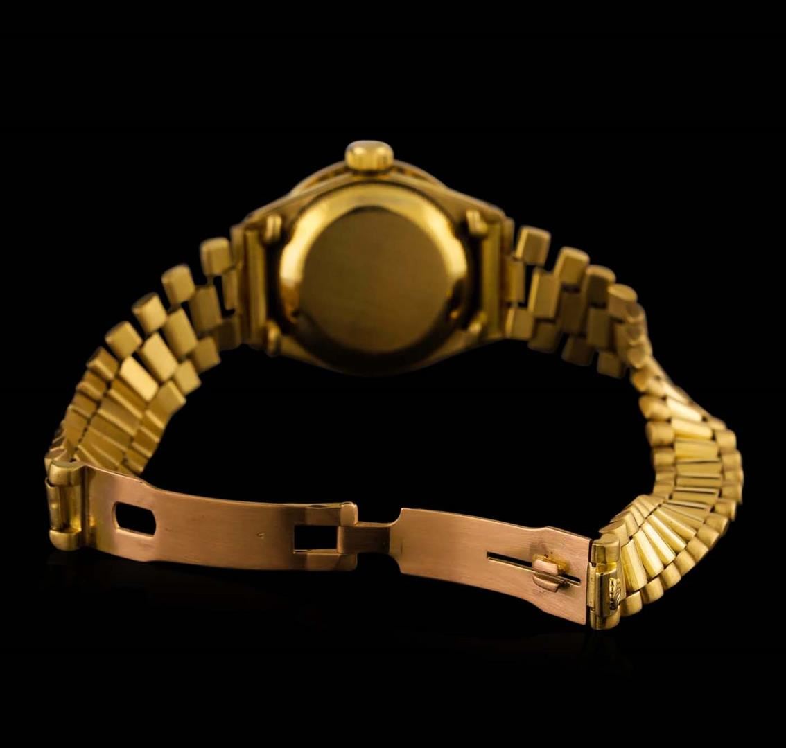 One ladies, hand crafted & machine milled Rolex DateJust model wristwatch electronically tested 18KT yellow gold, Circa: 1961, Case: 25mm oyster, Crown: twinlock with logo, Custom Bezel: diamond set, Custom Crystal: acrylic cyclops lens. Movement: superlative chronometer. Custom Dial: dark mother of pearl, with baton hands, & diamond markers, Date Display: 3 o'clock position, non-quick set, Bracelet: 18KT yellow gold, bright and satin finish. Condition: G-4 Average. Six and one half inch length. Concealed deployment clasp, with logo. Containing: Forty prong set round brilliant cut diamonds, measuring an average of 1.55mm in diameter, approximate total weight = 0.44ct. Set & graded in the bezel Clarity SI-1 to SI-2 Average. Color: G - H. Total Weight of Diamonds 0.44ct. Total Weight of Watch 60.00 grams. AIG Appraised at $17,050.00.