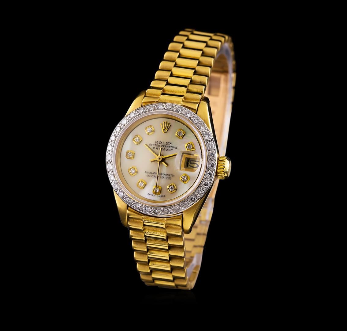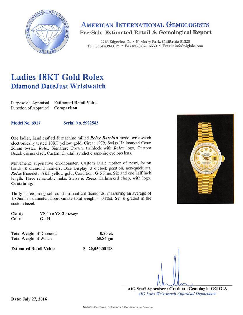 One ladies, hand crafted & machine milled Rolex DateJust model wristwatch electronically tested 18KT yellow gold, Circa: 1979, Swiss Hallmarked Case: 26mm oyster, Rolex Signature Crown: twinlock with Rolex logo, Custom Bezel: diamond set, Custom Crystal: synthetic sapphire cyclops lens. Movement: superlative chronometer, Custom Dial: mother of pearl, baton hands, & diamond markers, Date Display: 3 o'clock position, non-quick set, Rolex Bracelet: 18KT yellow gold, Condition: G-5 Fine. Six and one half inch length. Three removable links. Swiss & Rolex Hallmarked clasp, with logo. Containing: Thirty Three prong set round brilliant cut diamonds, measuring an average of 1.80mm in diameter, approximate total weight = 0.80ct. Set & graded in the custom bezel. Clarity VS-1 to VS-2 Average Color G - H. Total Weight of Diamonds 0.80ct. Total Weight of Watch 65.84gm. AIG Appraised at $20,050.00.