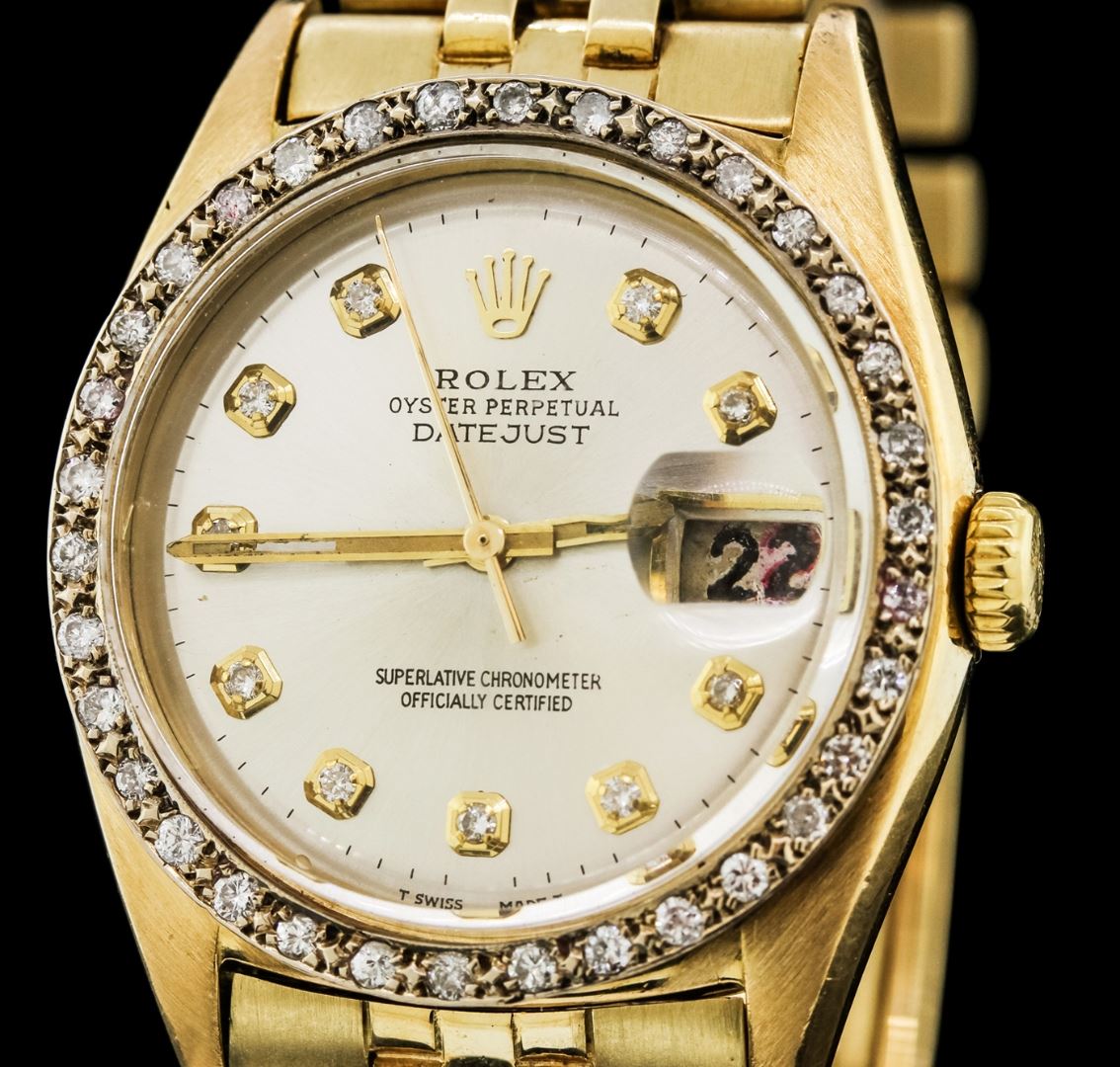 One gents, hand crafted & machine milled Rolex DateJust Model wristwatch electronically tested. 18KT yellow gold, Case: 35mm oyster, 18KT yellow gold Crown: twin lock with logo, Custom Bezel: diamond set, Crystal: acrylic cyclops lens. Movement: superlative chronometer, Custom Dial: Silvered, with baton hands & diamond markers, Date Window: 3 o'clock position non-quick set, Custom Date Wheel: Red numerals, Bracelet: 14KT yellow gold, bright & satin finish, Condition: G-4 Average. Seven and one half inch length. Standard clasp, with logo. Containing: Thirty Four prong set round brilliant cut diamonds, approximate total weight equals 0.80ct. Set & graded in the bezel. Clarity I-1 to I-2. Color G - I. Total Weight of Diamonds 0.80ct. Total Weight of Watch 107.03 grams. AIG appraised at $14,000.00. AIG Appraised at $14,000.00.