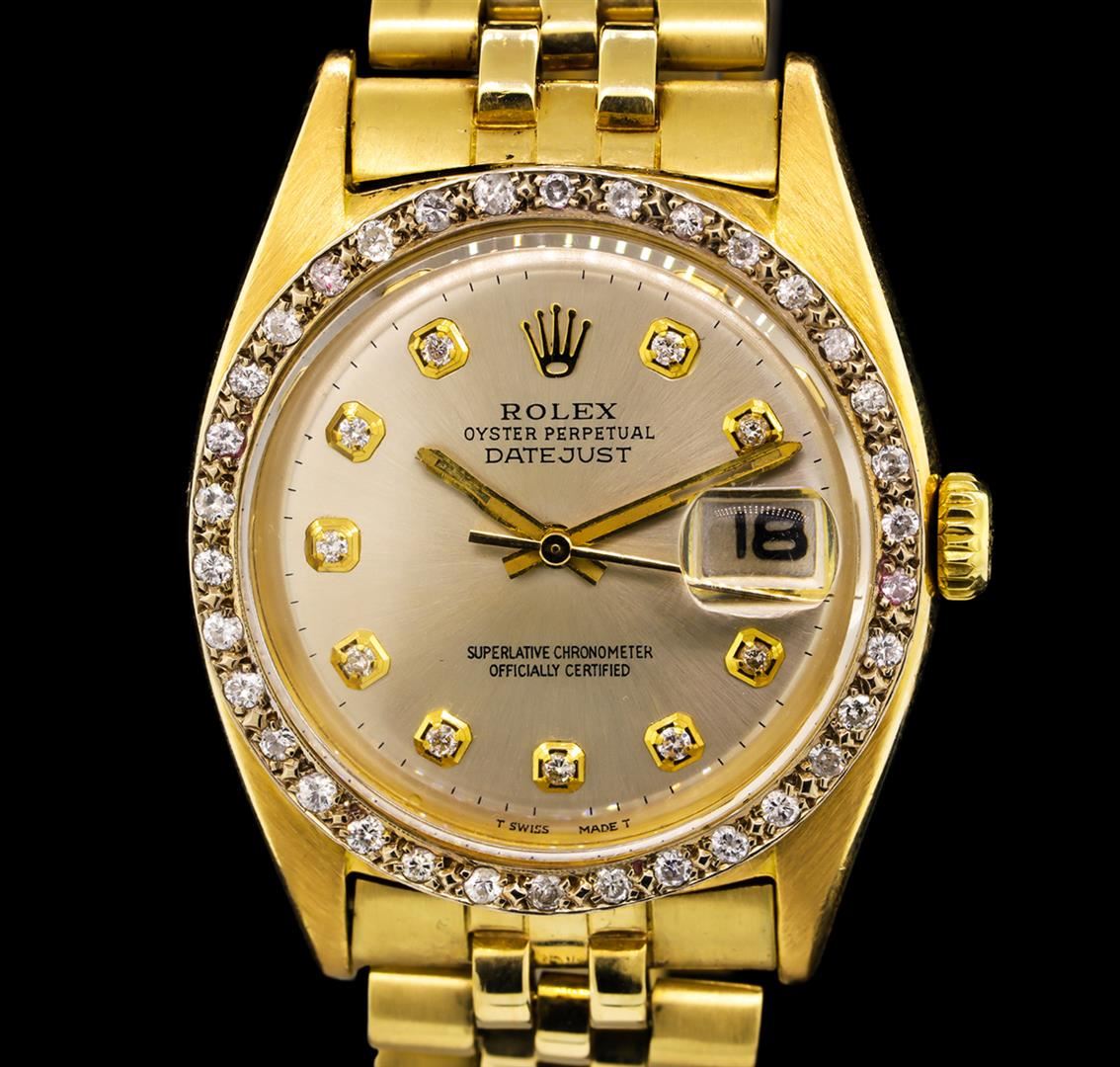 One gents, hand crafted & machine milled Rolex DateJust Model wristwatch electronically tested. 18KT yellow gold, Case: 35mm oyster, 18KT yellow gold Crown: twin lock with logo, Custom Bezel: diamond set, Crystal: acrylic cyclops lens. Movement: superlative chronometer, Custom Dial: Silvered, with baton hands & diamond markers, Date Window: 3 o'clock position non-quick set, Custom Date Wheel: Red numerals, Bracelet: 14KT yellow gold, bright & satin finish, Condition: G-4 Average. Seven and one half inch length. Standard clasp, with logo. Containing: Thirty Four prong set round brilliant cut diamonds, approximate total weight equals 0.80ct. Set & graded in the bezel. Clarity I-1 to I-2. Color G - I. Total Weight of Diamonds 0.80ct. Total Weight of Watch 107.03 grams. AIG Appraised at $14,000.00.