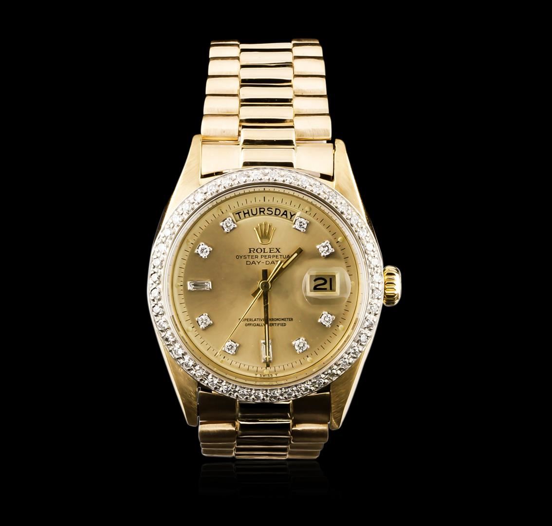 One gents, hand crafted & machine milled Rolex DayDate Model wristwatch electronically tested 18KT yellow gold, Case: 36mm oyster, Crown: twin lock with logo, Custom Bezel: diamond set, Custom Crystal: acrylic cyclops lens. Circa: 1966.Movement: superlative chronometer, Custom Dial: Champagne color, with baton hands, & diamond markers, Calendar: non-quick set, Custom Bracelet: 18KT yellow gold, bright polish & brushed finish, Condition: G-4 Average. Seven and one half inch length. Concealed deployment clasp, with logo Containing: Forty Four prong set round brilliant cut diamonds, approximate total weight equals 0.74ct. Set & graded in the bezel. Clarity: SI-2 to I-2. Color: H - I. Total Weight of Diamonds 0.74ct. Total Weight of Watch 111.68gm. AIG Appraised at $22,050.00.