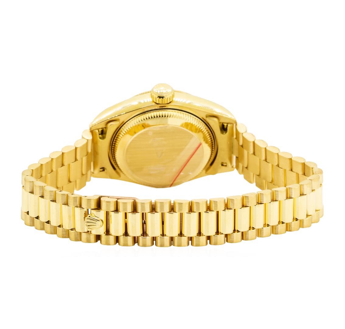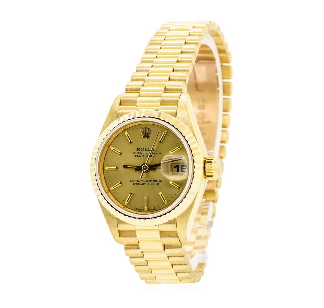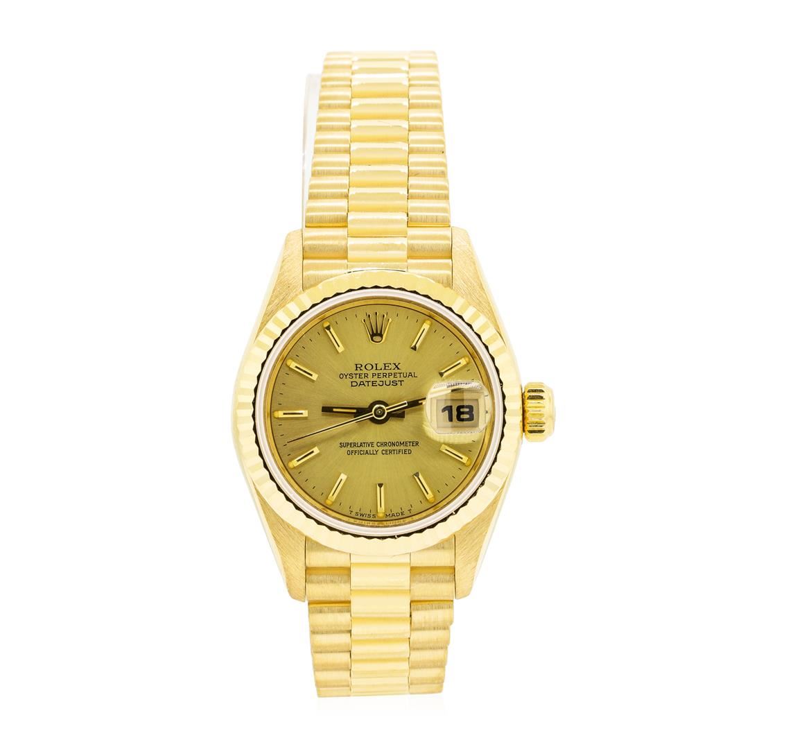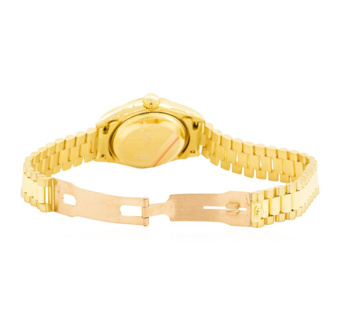 One Rolex President women's watch featuring: Case: 18KT yellow gold. Bezel: 18KT yellow gold. Crystal: Acrylic. Crown: Screw-down. Dial: Gold color; gold tone hour markers. Features: date window located at the 3 o'clock position. Bracelet: 18KT yellow gold.