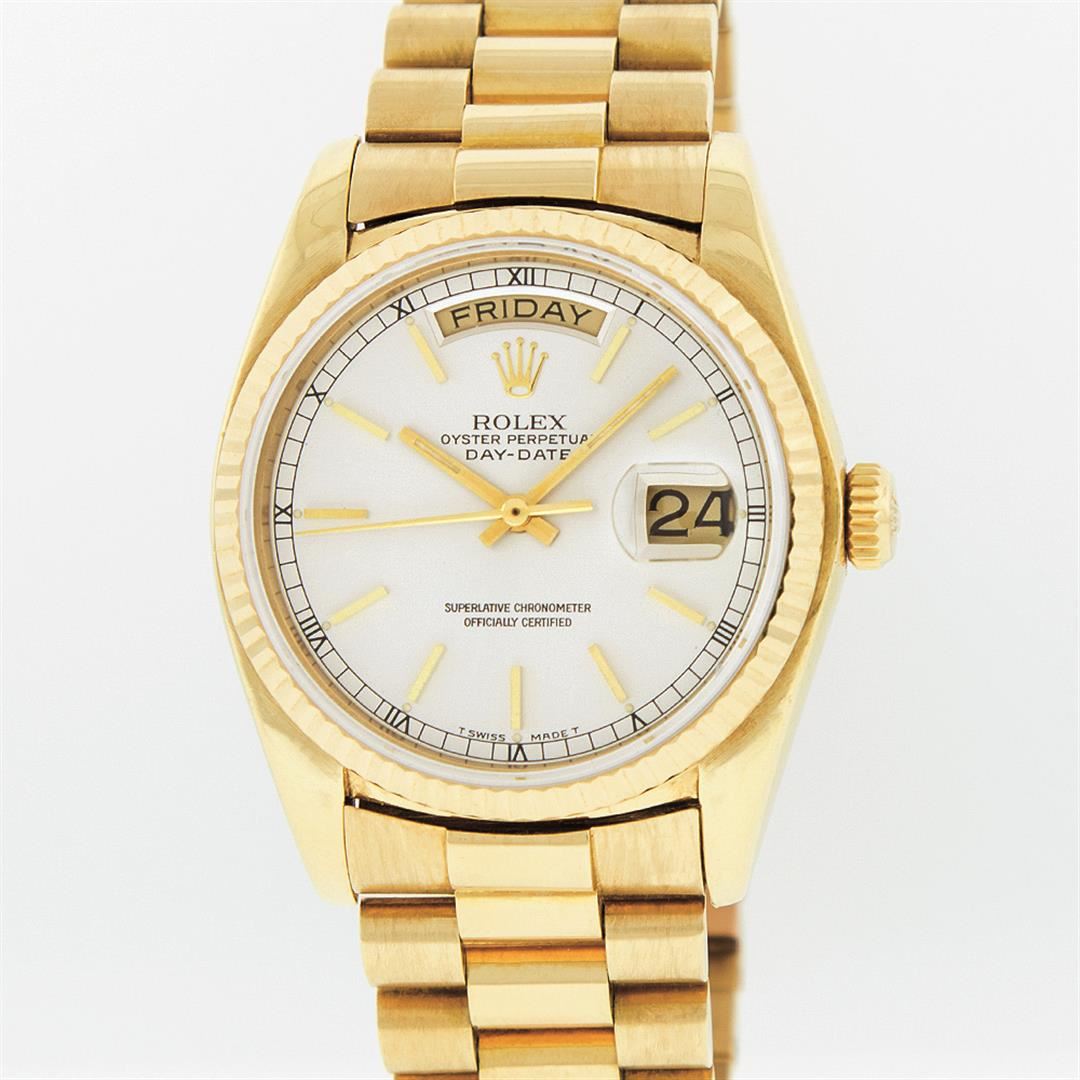 One Mens Rolex Day Date 18K President Polished, Serviced & Electronically Tested, Yellow Gold Case:36mm, 18K Yellow Gold Crown, Bezel: 18K Yellow Gold Fluted Bezel. Custom Crystal: Acrylic Cyclops Lens. Movement: Automatic Winding Movement Caliber 3055. Dial: White Index With Square Roman Dial. Date Window: 3 O'Clock Position, Day Display: 12 O'Clock Position, Single Quickset, Model: 18038 Condition: G-6 Extra Fine. Bracelet: 18K Yellow Gold President With Hidden Clasp, Bright & Satin Polish. 6.5 Inch Length, Standard President Clasp, With Rolex Logo. Comes with 6 month warranty.