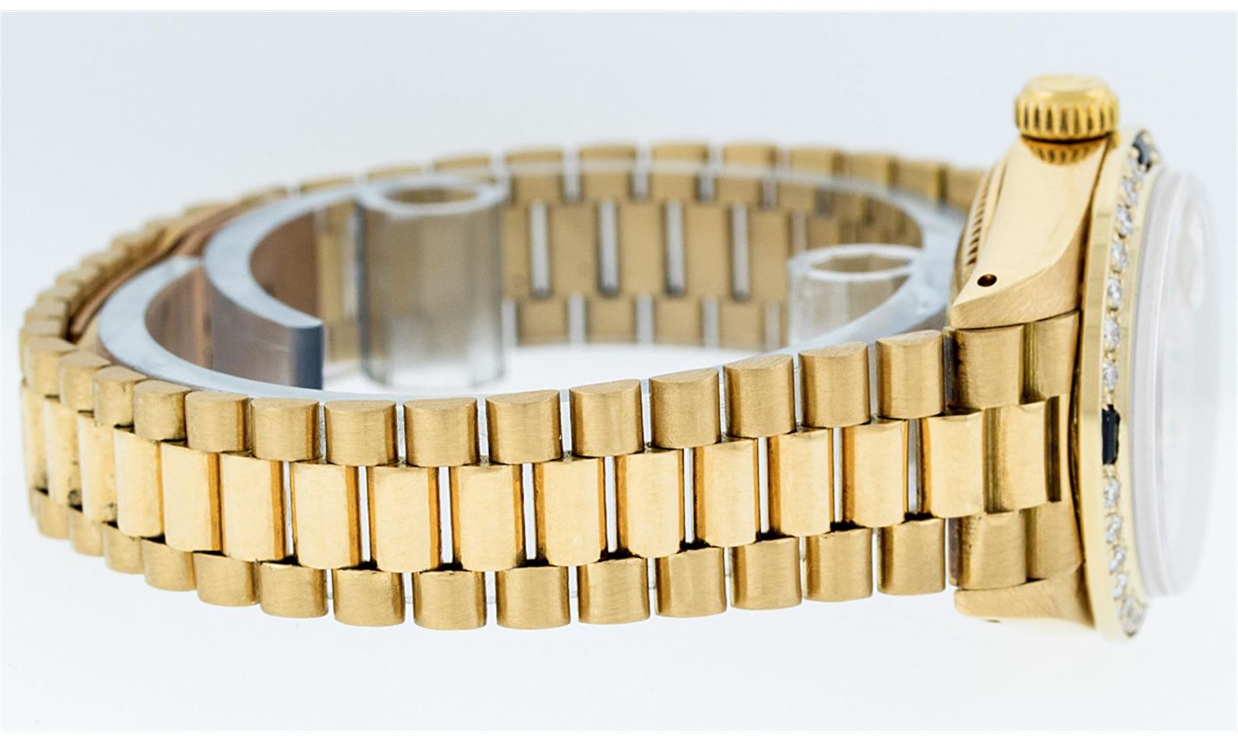 One Ladies 18K Rolex President Polished, Serviced & Electronically Tested, Yellow Gold Case: 26mm, 18K Yellow Gold Crown, Custom Bezel: 18K Yellow Gold Sapphire Bead Set Diamond Bezel, Diamond + Stone Count: 28 Diamonds + 4 Sapphires. Total Weight .70 Carat, Clarity: SI-VS, Color: G to H. Custom Crystal: Synthetic Sapphire Cyclops Lens. Movement: Automatic Winding Movement Caliber 2030. Custom Dial: Mother Of Pearl With Emeralds, Stone Count: 10 Emeralds In Dial. Date Window: 3 O'Clock Position, Model: Datejust, Condition: G-6 Extra Fine. Bracelet: 18K Yellow Gold President With Hidden Clasp, Bright & Satin Polish. 5.5 Inch Length, Standard President Clasp (Hidden Clasp), With Rolex Logo. Comes with 6 month warranty.