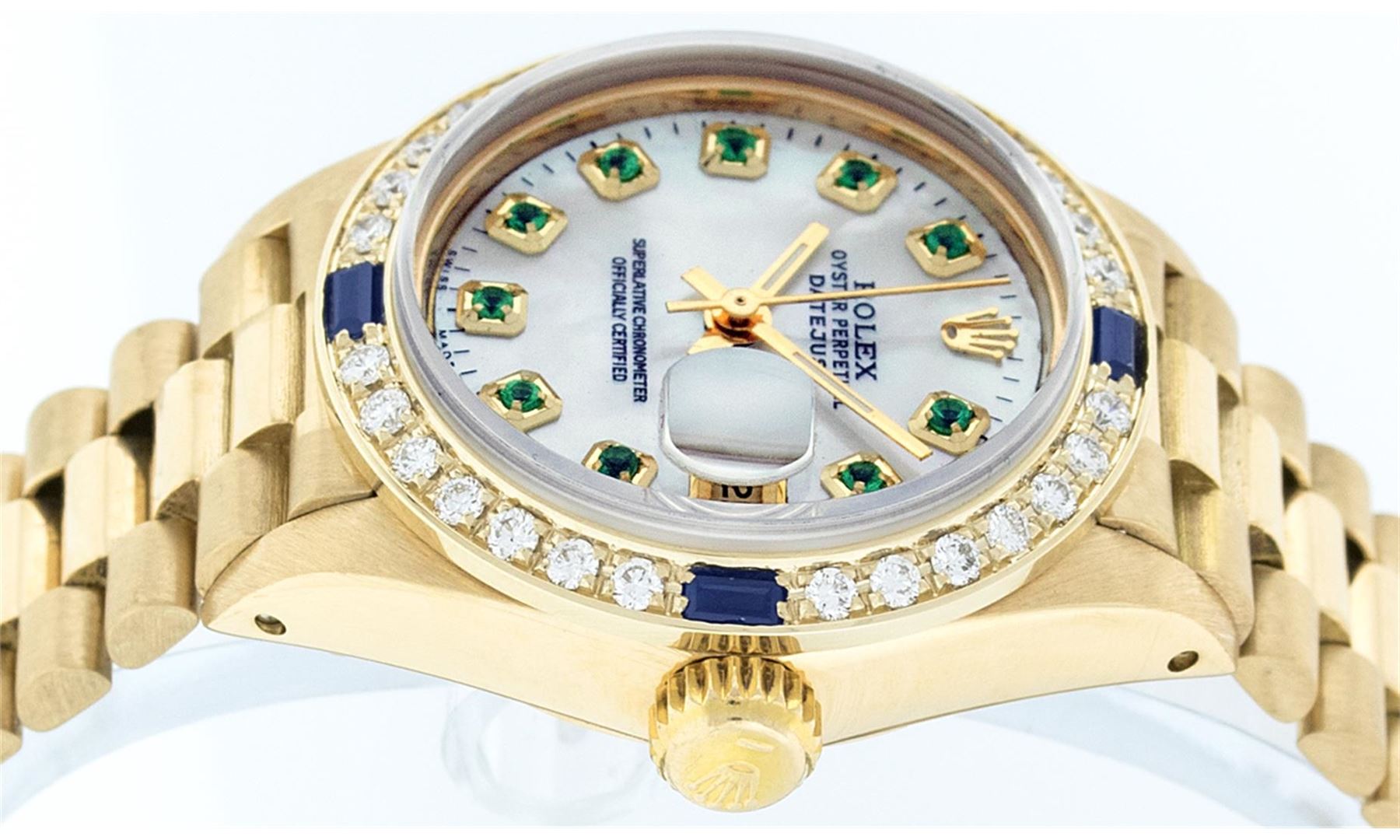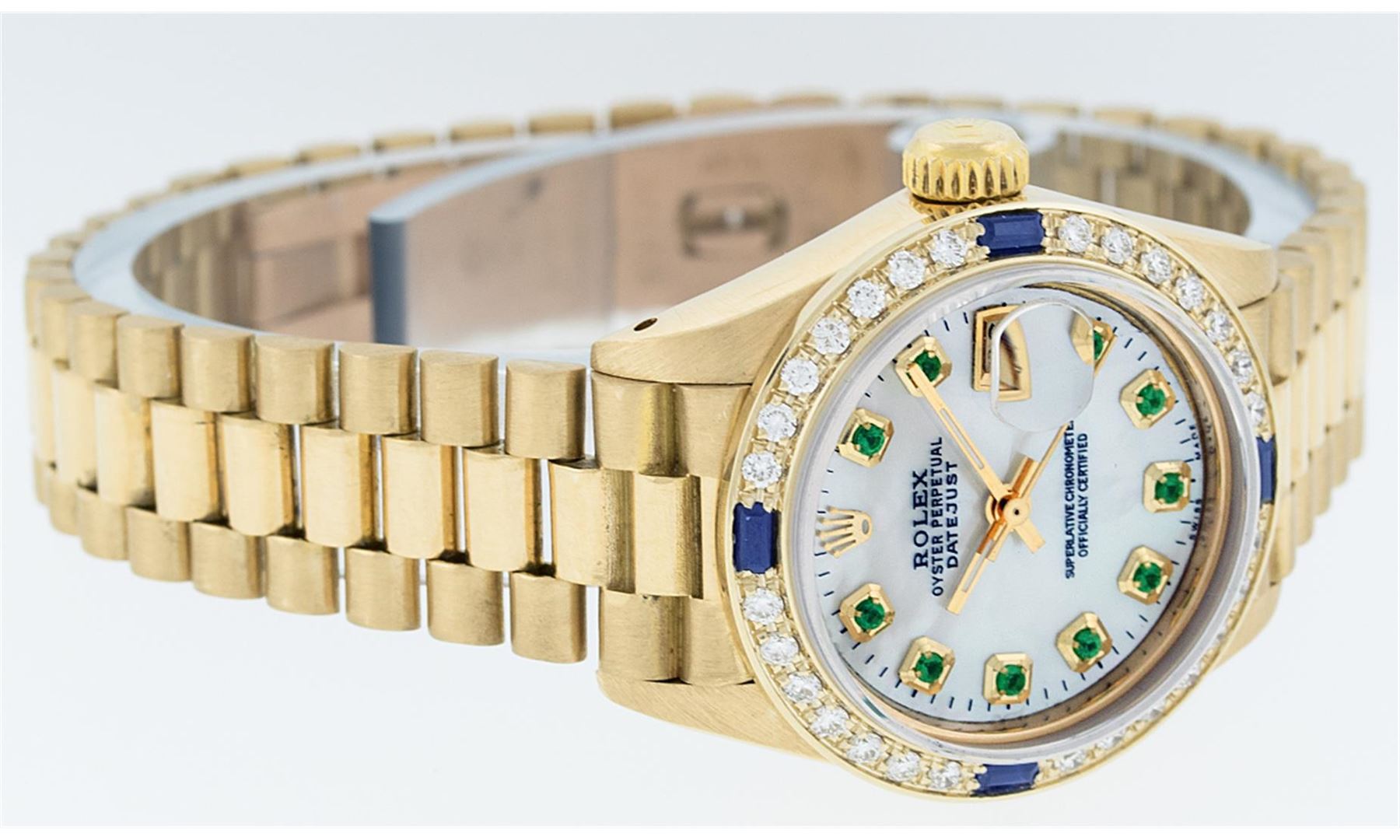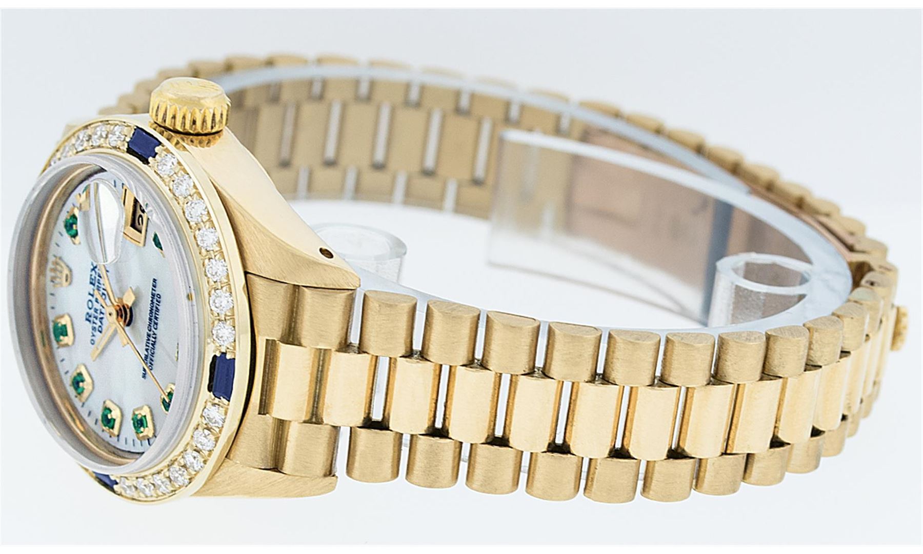 One Ladies 18K Rolex President Polished, Serviced & Electronically Tested, Yellow Gold Case: 26mm, 18K Yellow Gold Crown, Custom Bezel: 18K Yellow Gold Sapphire Bead Set Diamond Bezel, Diamond + Stone Count: 28 Diamonds + 4 Sapphires. Total Weight .70 Carat, Clarity: SI-VS, Color: G to H. Custom Crystal: Synthetic Sapphire Cyclops Lens. Movement: Automatic Winding Movement Caliber 2030. Custom Dial: Mother Of Pearl With Emeralds, Stone Count: 10 Emeralds In Dial. Date Window: 3 O'Clock Position, Model: Datejust, Condition: G-6 Extra Fine. Bracelet: 18K Yellow Gold President With Hidden Clasp, Bright & Satin Polish. 5.5 Inch Length, Standard President Clasp (Hidden Clasp), With Rolex Logo. Comes with 6 month warranty.