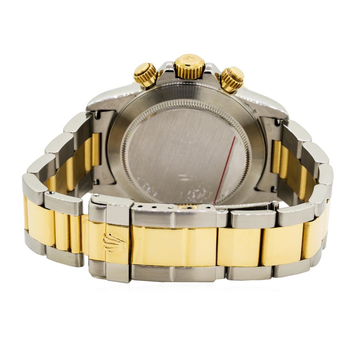 One Rolex Daytona men's watch featuring: Movement: Automatic. Case: Stainless steel and 18KT yellow gold. Bezel: 18KT yellow gold engraved tachymeter. Crystal: Scratch-resistant sapphire. Dial: Black color; gold hour markers; gold sub-dials. Features: Cosmograph; waterproof screw-down crown. Bracelet: Two-tone stainless steel and 18KT yellow gold with deployant clasp.