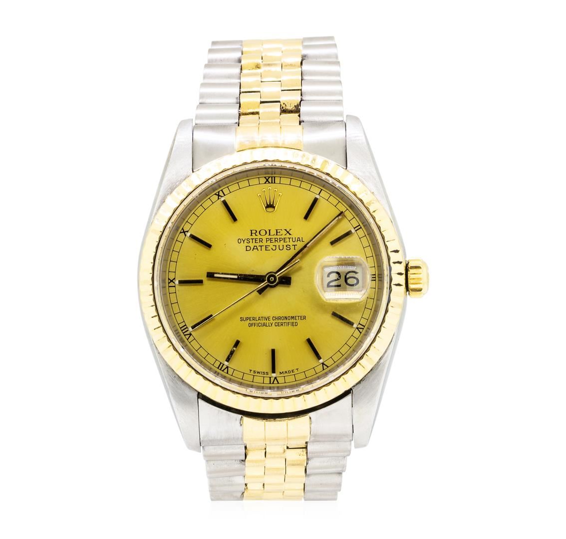 One 18KT yellow gold and stainless steel Rolex men's oyster perpetual datejust wristwatch with a jubilee bracelet and case measuring 36mm. The watch is a quickset and has a yellow gold fluted bezel with a gold satin dial, gold baton type hands and stick marker numerals. The crystal is sapphire with a cyclops date window at 3 o'clock. Serial Number L812404.