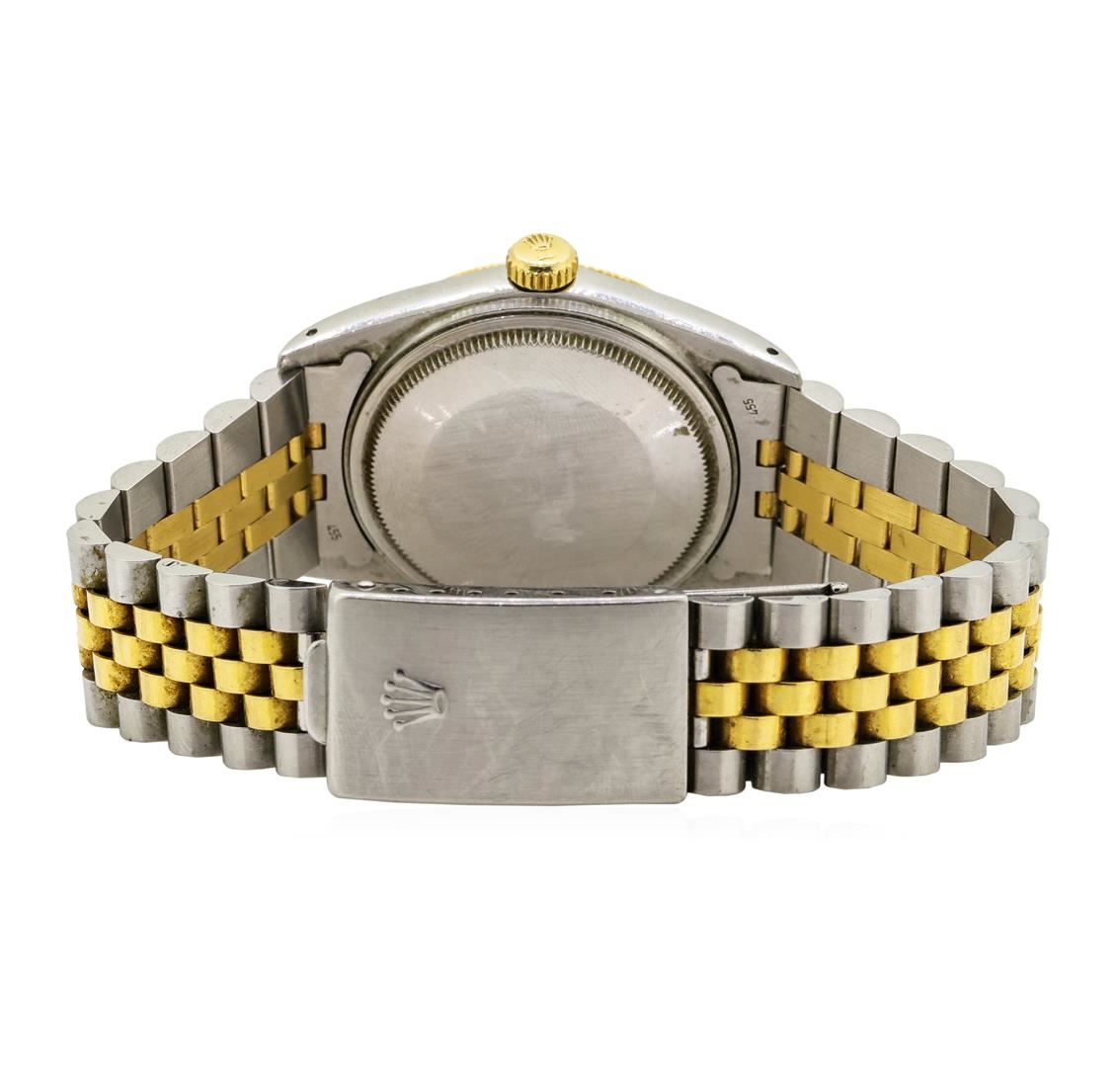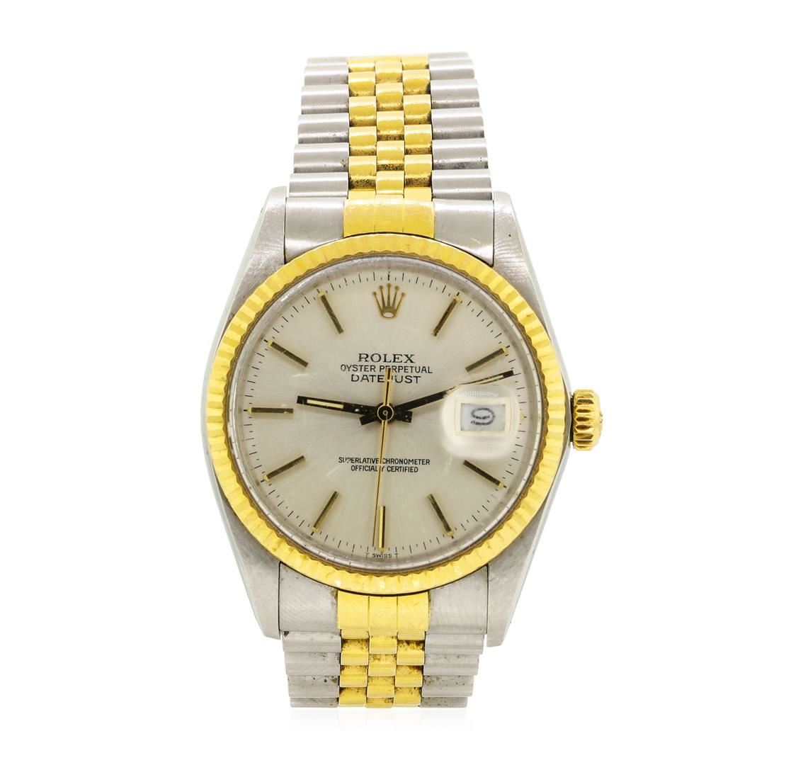 One Rolex men's wristwatch featuring: Movement: Automatic. Case: Stainless steel and 18KT yellow gold. Bezel: 18KT yellow gold. Crystal: Scratch-resistant sapphire. Dial: White/silver color; gold hour markers; Features: date window at 3 o'clock, waterproof screw-down crown. Bracelet: Two-tone stainless steel and 18KT yellow gold with deployant clasp.