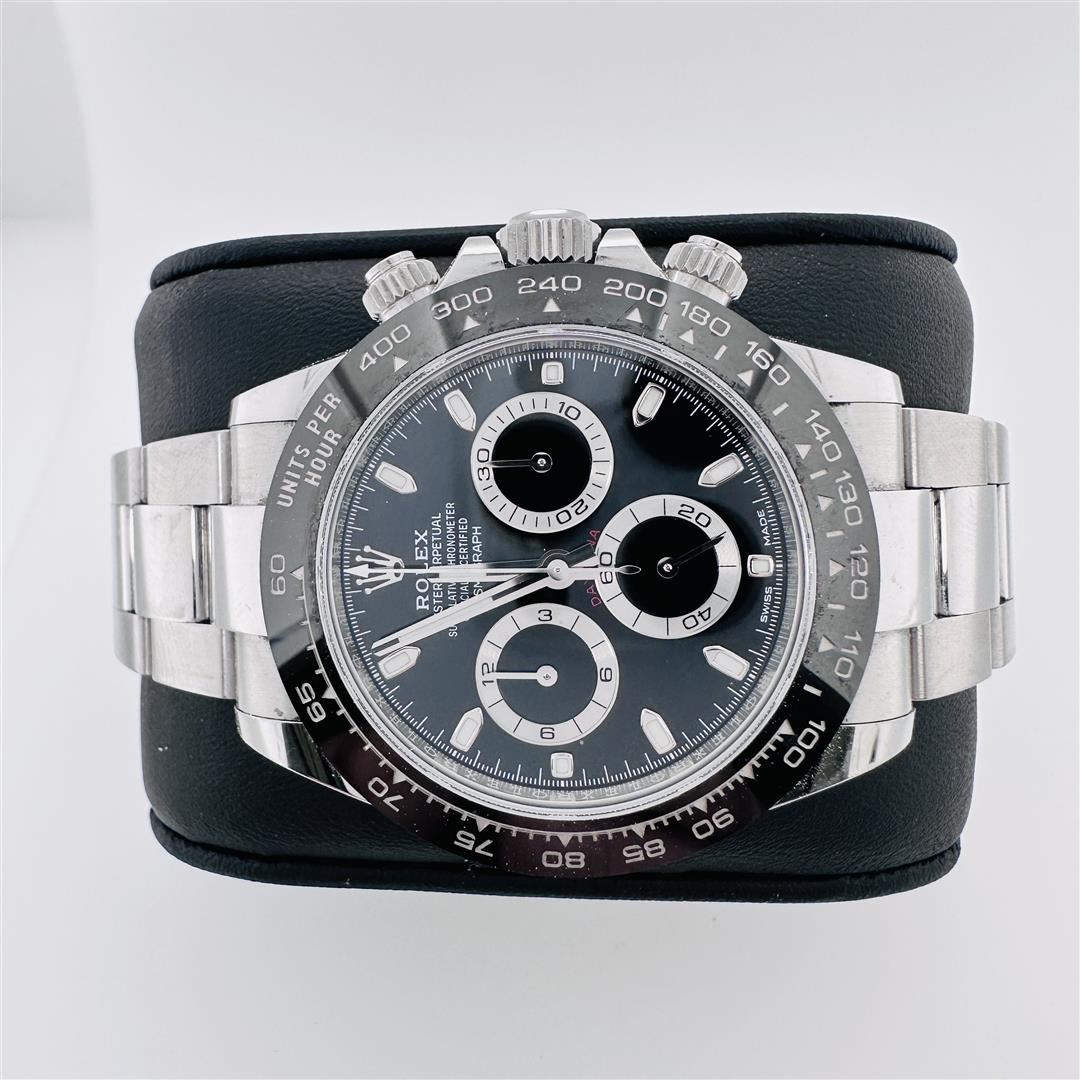 One Rolex Daytona Cosmograph Black ceramic 116500LN Stainless Steel. With its stainless steel build and sleek design, the Rolex Cosmograph Daytona 116500LN is a timepiece that's both elegant and practical. Since its introduction in 1963, the Daytona has been a favorite among professional racing drivers and watch enthusiasts alike. The watch's tachymeter bezel allows for accurate speed measurements, while the self-winding chronograph movement ensures precise timekeeping. The 116500LN also features a scratch-resistant sapphire crystal and a waterproof Oyster case, making it a durable and reliable choice for any occasion. This watch is in excellent condition and comes with complete box and papers. The watch photographed is the actual watch.