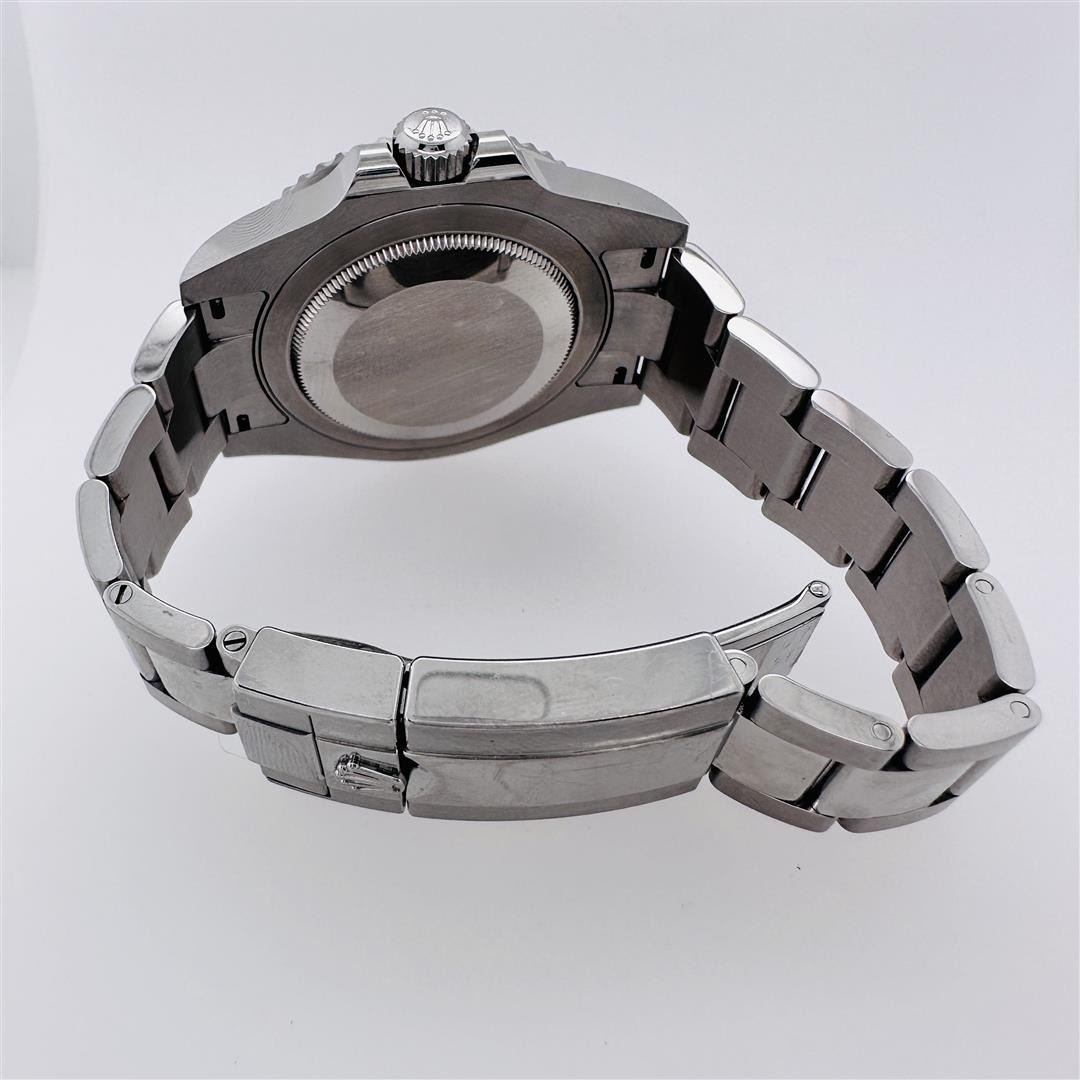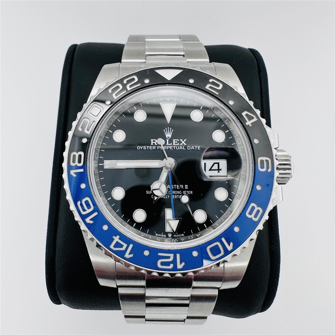 One Rolex 2022 GMT-Master II Batman Stainless Steel Oyster Bracelet. Rolex-GMT-Master II comes with warranty card. This full set includes box and papers. Stainless steel case with a stainless steel Oyster bracelet. Bi-directional rotating stainless steel bezel with a black and blue ring showing 24 hour markers. Black dial with luminous silver-tone hands and dot hour markers. Minute markers around the outer rim. Luminescent hands and markers. Date display at the 3 o'clock position. Rolex caliber 3285 automatic movement with a 70-hour power reserve. Scratch resistant sapphire crystal. Screw down crown. Solid case back. Round case shape. Case size: 40 mm. Folding Oysterlock clasp. Water resistant at 100 meters / 330 feet. Functions-date, hour, minute, second, 24 hours GMT movement. The photo shown is of the actual piece, this watch is in excellent condition!