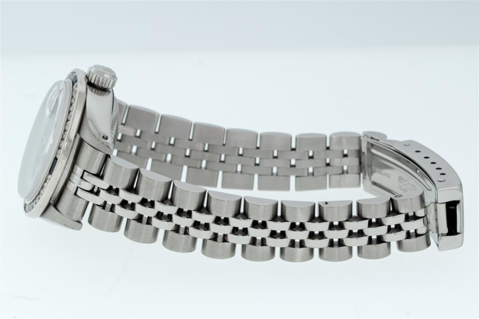 One Ladies Stainless Steel Rolex Polished Bright with Satin Finish, Serviced & Electronically Tested, Rolex Stainless Steel Case: 26mm, Rolex Stainless Steel Crown, Custom Bezel: New 18K White Gold Sapphire Channel Set Diamond Bezel, Diamond + Gem Count: 36 Diamonds + 4 Sapphires, Clarity: SI-VS, Color: G to H. Custom Crystal: New Sapphire With Magnified Date Window. Custom Hands: New Luminescent Hands. Rolex Movement: Automatic Winding Rolex Movement. Rolex Dial: Blue Factory Roman Dial With Square Track. Date Window: 3 O'Clock Position Date Display, Model: Datejust. Condition: G-6 Extra Fine. Rolex Bracelet: Stainless Steel Jubilee Band. Bright Polish & Satin Finish. 6.0 Inch Length, Adjustable. Standard Clasp, With Rolex Logo. This Pre Owned Watch Has Been Serviced Time Tested And Is In Excellent Condition It Is Free Of All Scratches And Dents.