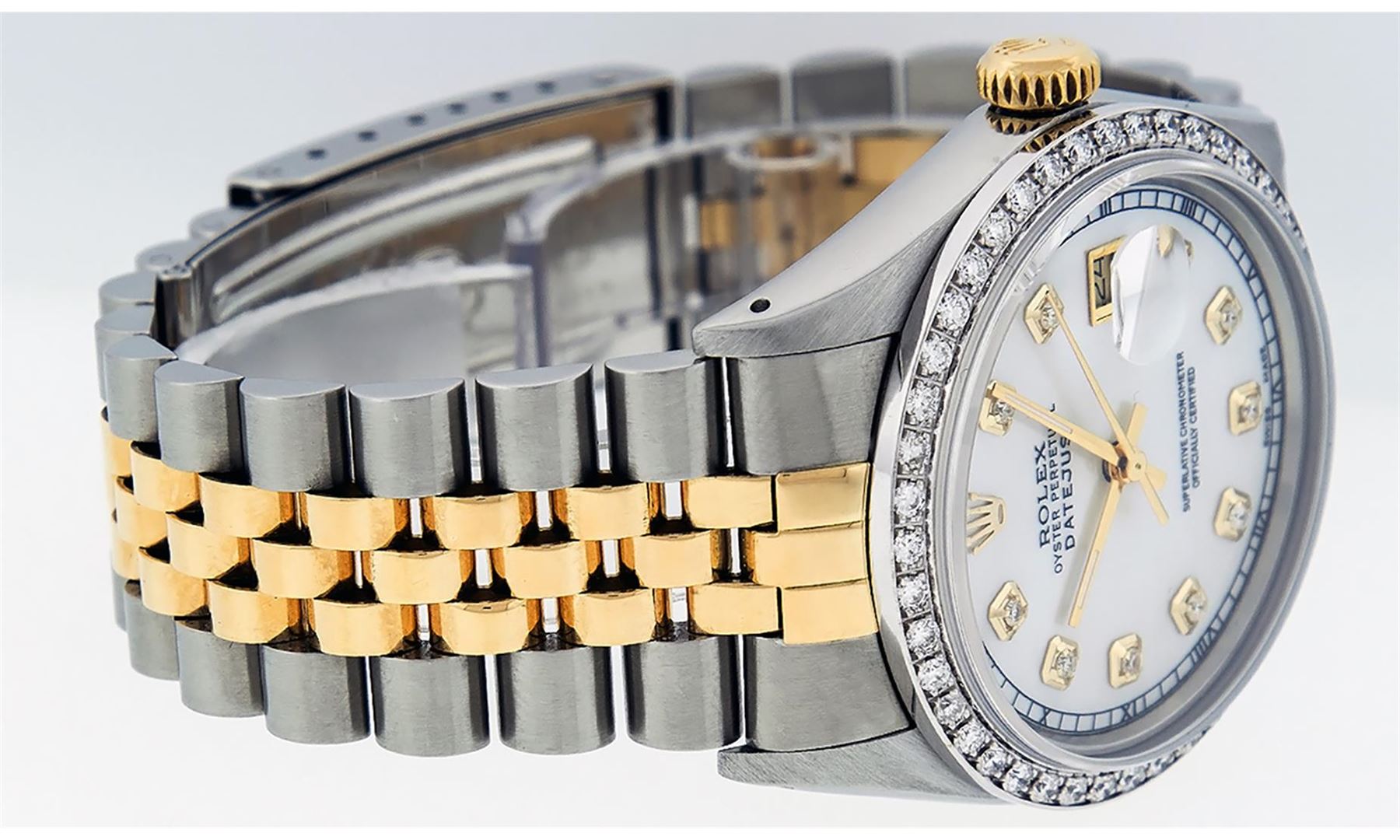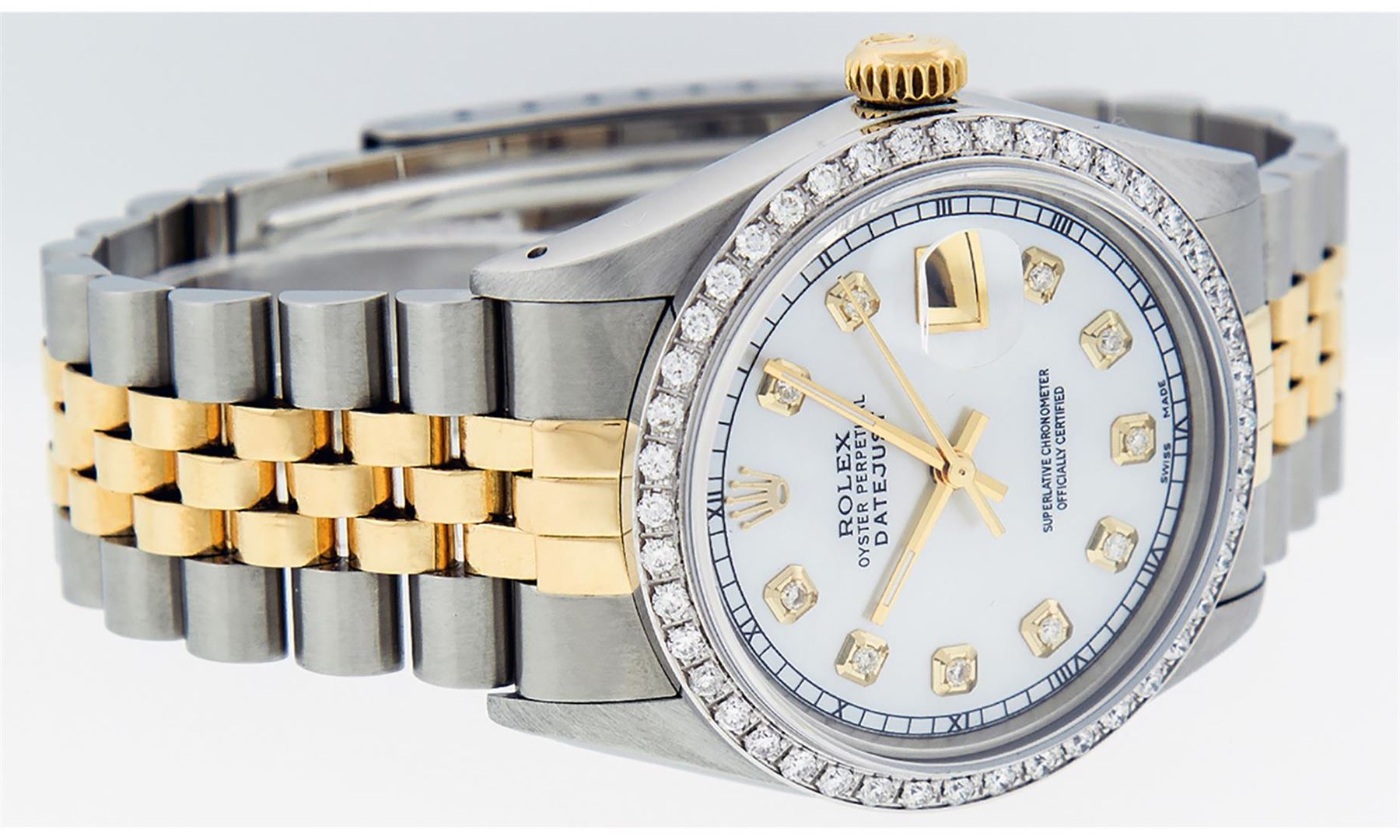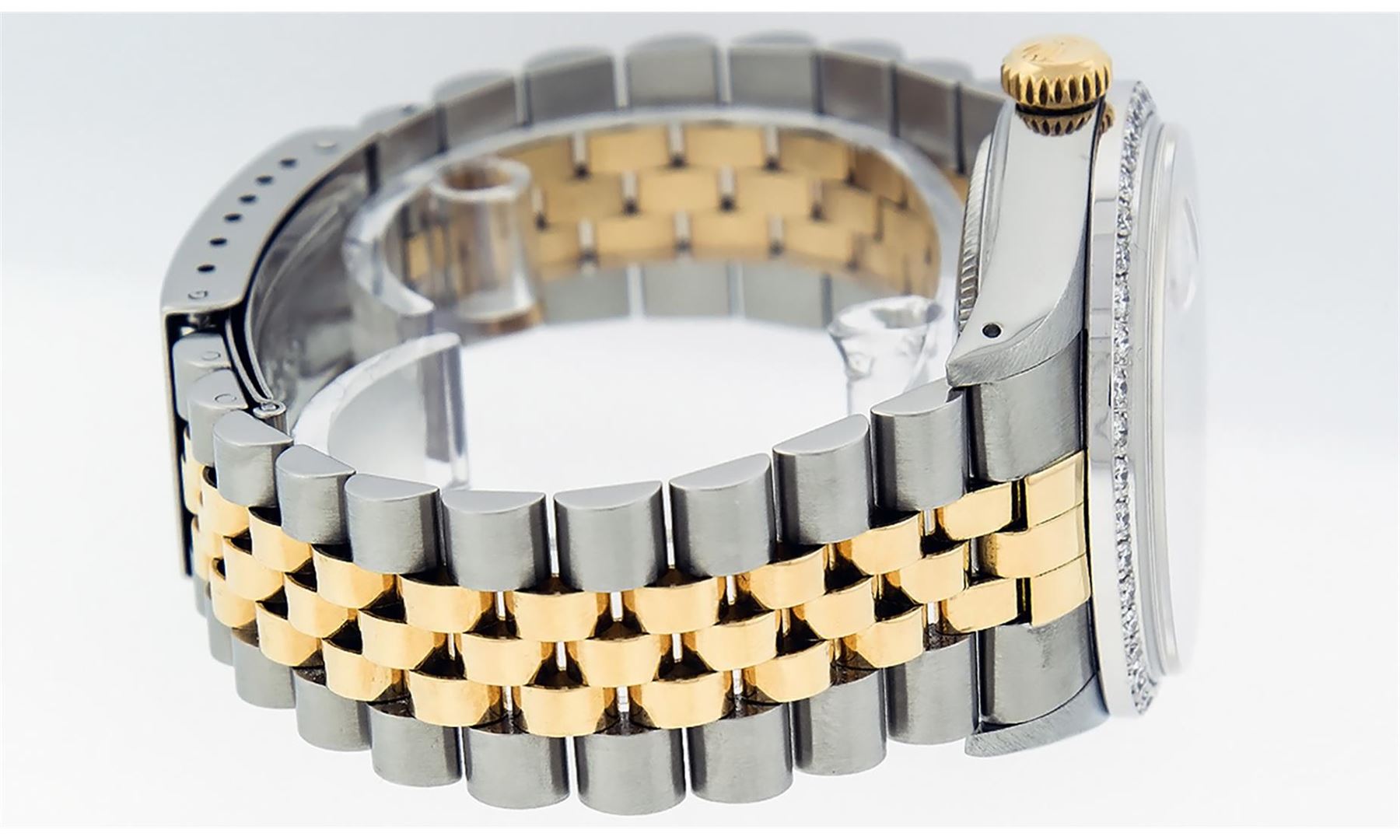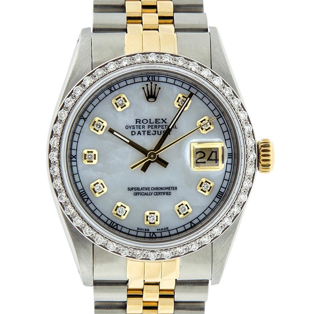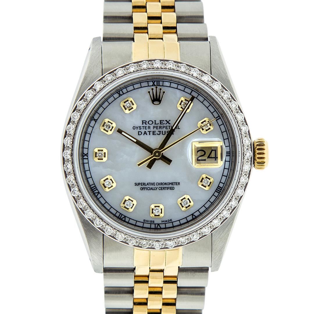 One Mens Pre Owned Yellow Gold Two Tone Rolex Datejust Polished, Serviced & Electronically Tested, Rolex Yellow Gold & Stainless Steel Case: 36mm, Rolex Yellow Gold Crown, Custom Bezel: New 18K White Gold Bead set Diamond Bezel, Diamond Count: 44 Diamonds