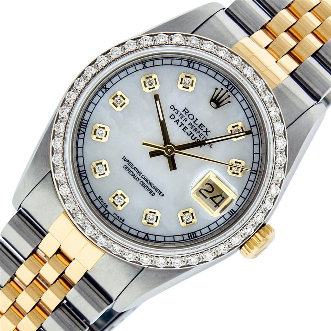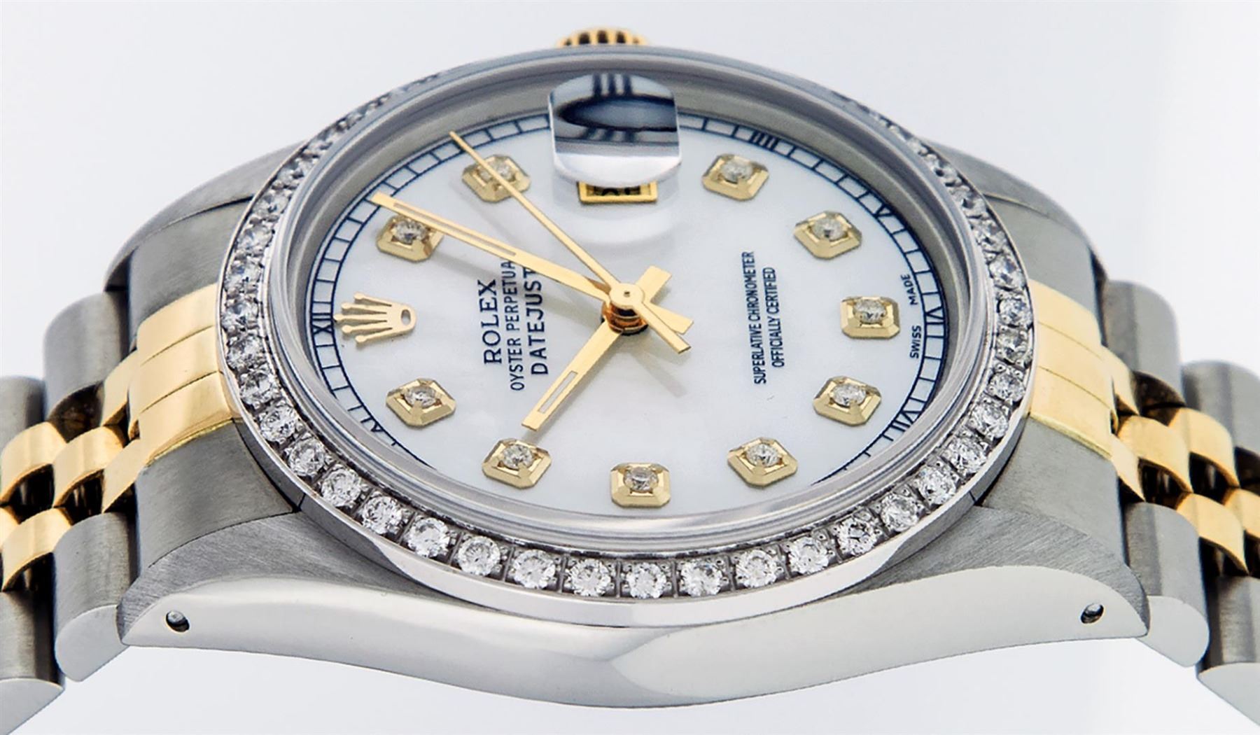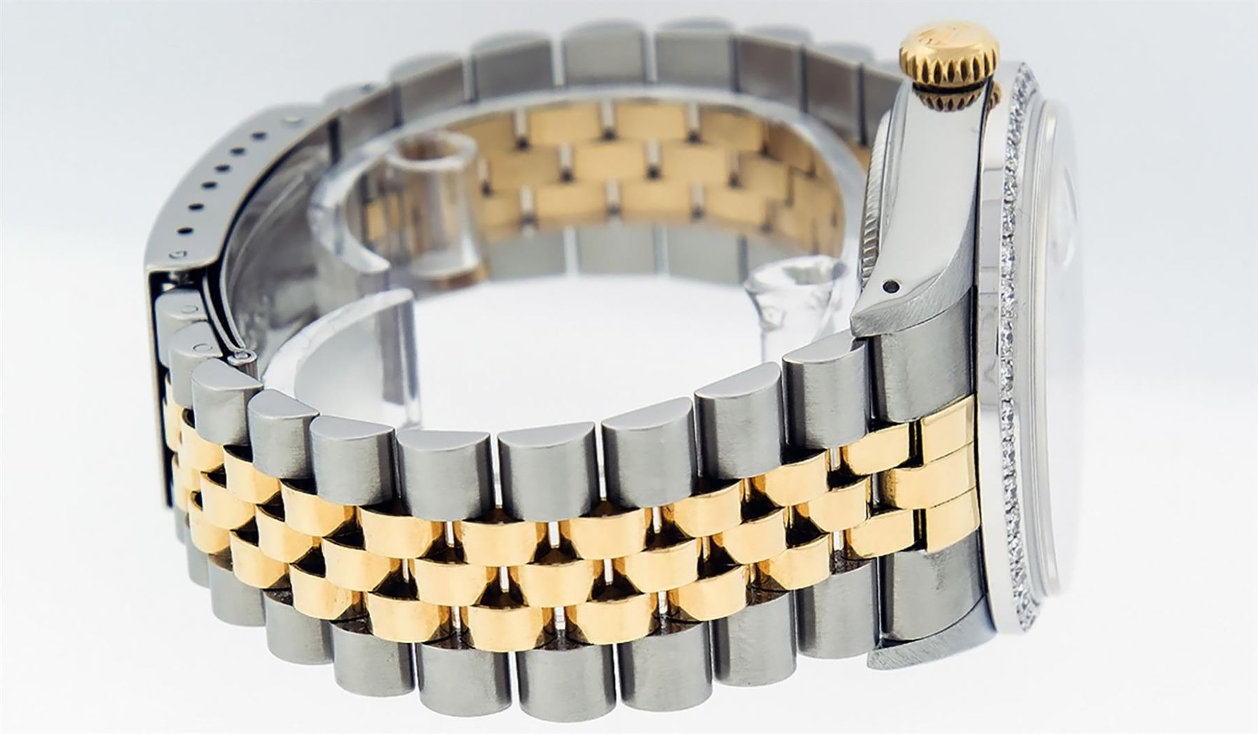 One Mens Pre Owned Yellow Gold Two Tone Rolex Datejust Polished, Serviced & Electronically Tested, Rolex Yellow Gold & Stainless Steel Case: 36mm, Rolex Yellow Gold Crown, Custom Bezel: New 18K White Gold Bead set Diamond Bezel, Diamond Count: 44 Diamonds