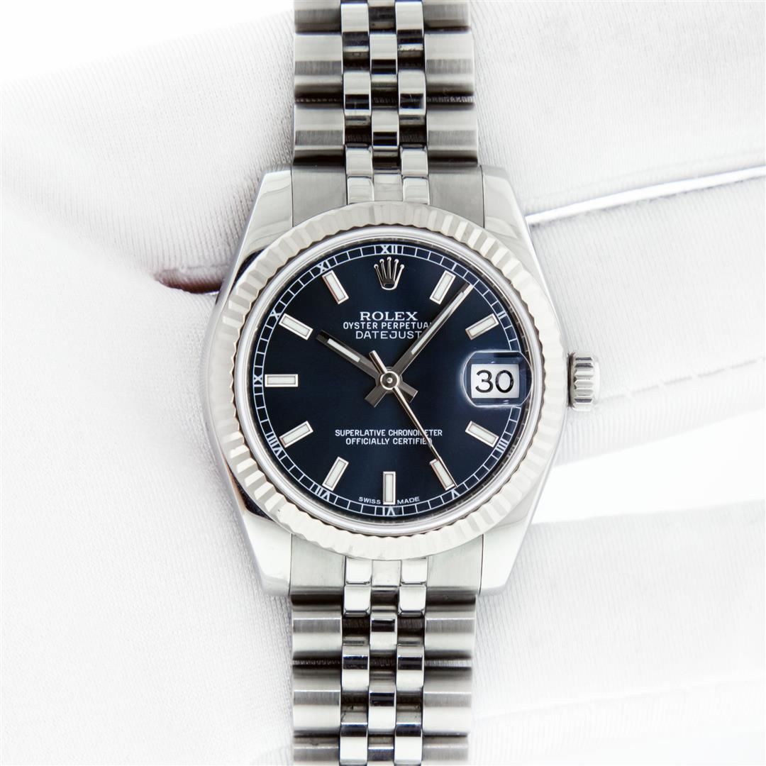 One Women's Pre Owned Midsize 31MM Stainless Steel Rolex Datejust Polished, Serviced & Electronically Tested, Rolex Stainless Steel Case Case: 31mm, Rolex Stainless Steel Crown, Rolex Bezel: 18K White Gold Fluted Bezel, Crystal: Sapphire With Cyclops Lens. Hands: Lumi Hands. Rolex Movement: Automatic Winding Movement 2235. Rolex Dial: Blue Index With Square Roman Track. Date Window: 3 O'Clock Position Date Display, Quickset, Model: Midsize Datejust. Condition: G-6 Extra Fine. Rolex Bracelet: Stainless Steel Jubilee Band. Bright Polish. 6.0 Inch Length, Adjustable. Hidden Clasp, With Rolex Logo. This Watch Has Been Serviced Time Tested And Is In Excellent Condition It Is Free Of All Scratches And Dents. This Watch Comes With A Rolex Box.