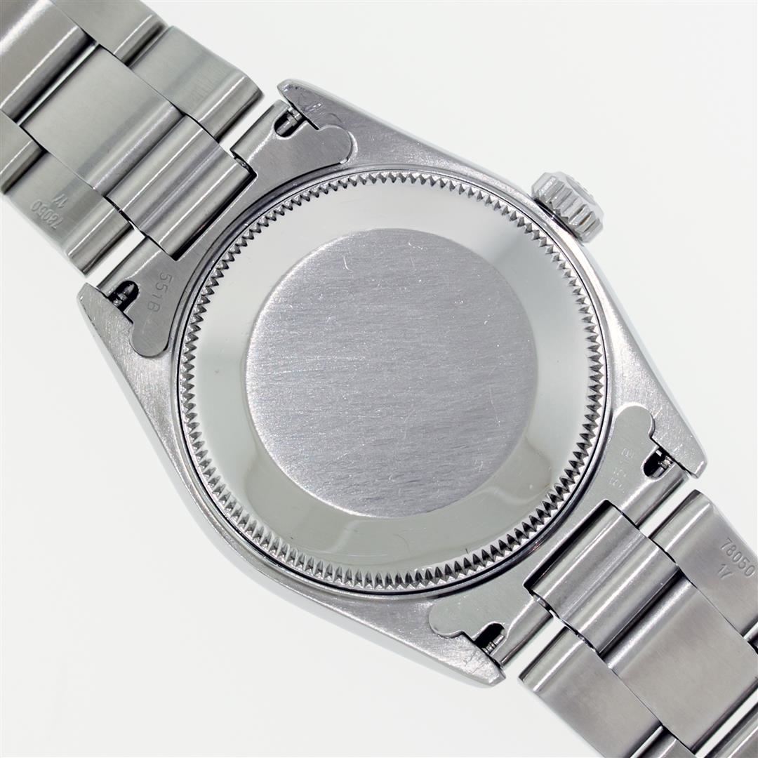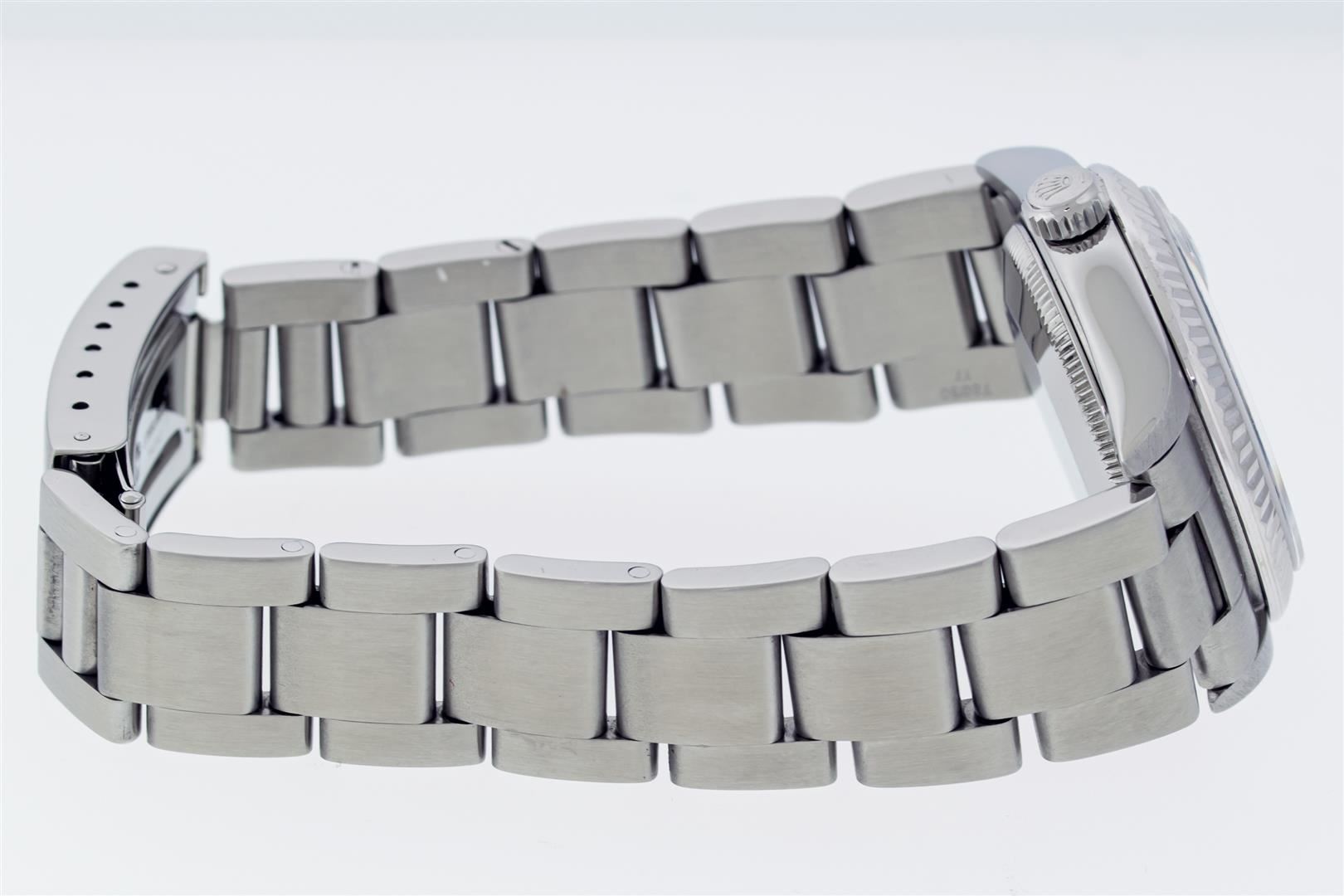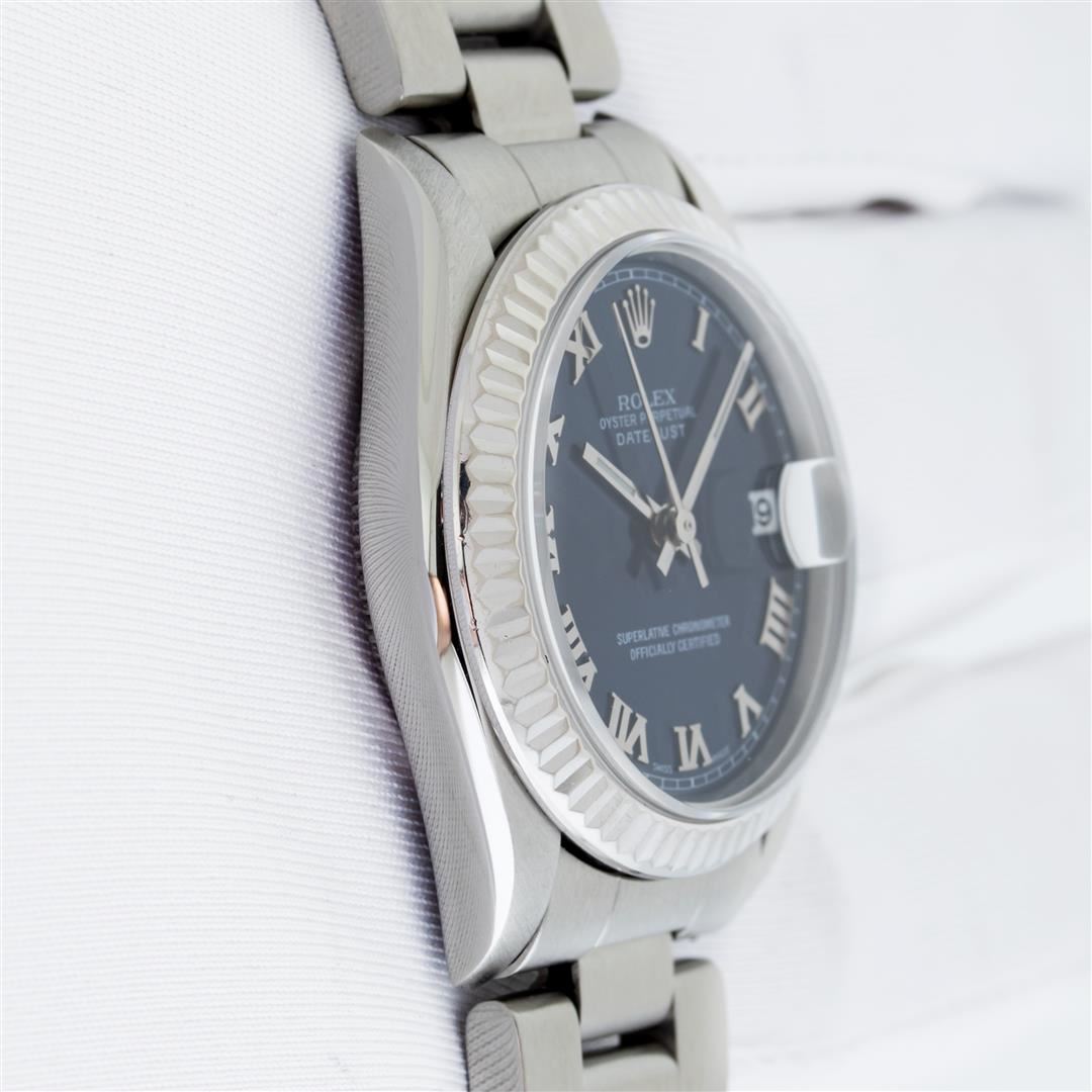 One Women's Pre Owned Midsize 31MM Stainless Steel Rolex Datejust Polished, Serviced & Electronically Tested, Rolex Stainless Steel Case Case: 31mm, Rolex Stainless Steel Crown, Rolex Bezel: 18K White Gold Fluted Bezel, Crystal: Sapphire With Cyclops Lens. Hands: Lumi Hands. Rolex Movement: Automatic Winding Movement 2235. Rolex Dial: Blue With Roman Hour Markers. Date Window: 3 O'Clock Position Date Display, Quickset, Model: Midsize Datejust. Condition: G-6 Extra Fine. Rolex Bracelet: Stainless Steel Oyster Band. Bright Polish. 6.0 Inch Length, Adjustable. Standard Clasp, With Rolex Logo. This Watch Has Been Serviced Time Tested And Is In Excellent Condition It Is Free Of All Scratches And Dents.