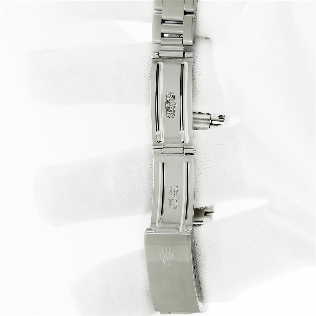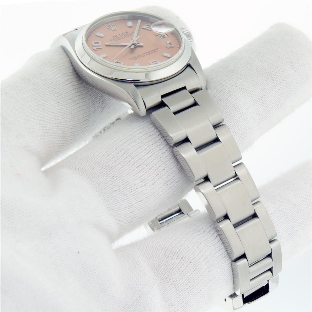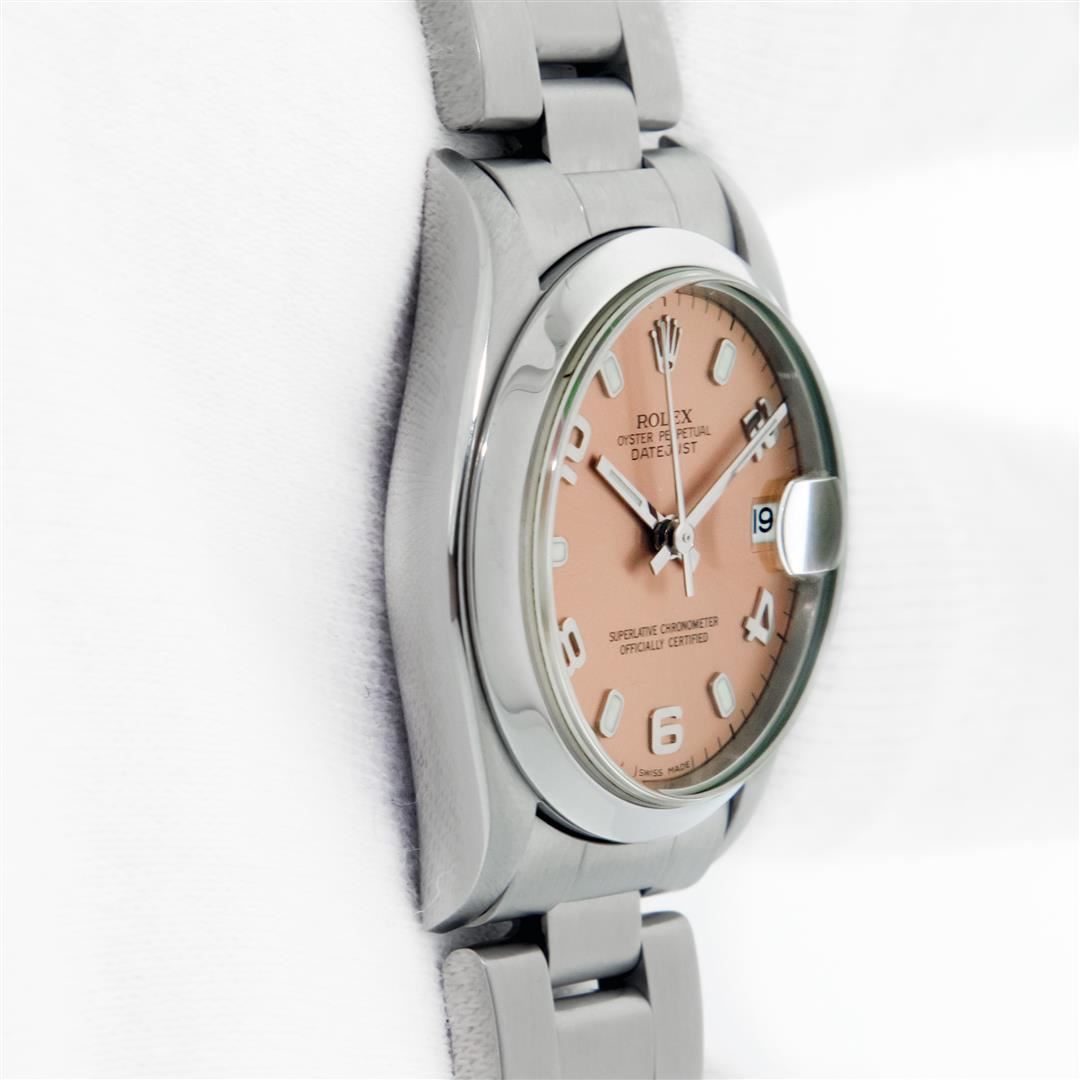 One Women's Pre Owned Midsize Stainless Steel Rolex Datejust Polished, Serviced & Electronically Tested, Rolex Stainless Steel Case Case: 31mm, Rolex Stainless Steel Crown, Rolex Bezel: 18K White Gold Fluted Bezel, Crystal: Sapphire With Cyclops Lens. Hands: Lumi Hands. Rolex Movement: Automatic Winding Movement. Rolex Dial: Factory Salmon Arabic Dial With Index Hour Markers. Date Window: 3 O'Clock Position Date Display, Quickset, Model: Midsize Datejust. Condition: G-6 Extra Fine. Rolex Bracelet: Stainless Steel Oyster Band. Bright Polish. 6.0 Inch Length, Adjustable. Standard Clasp, With Rolex Logo. This Watch Has Been Serviced Time Tested And Is In Excellent Condition It Is Free Of All Scratches And Dents.