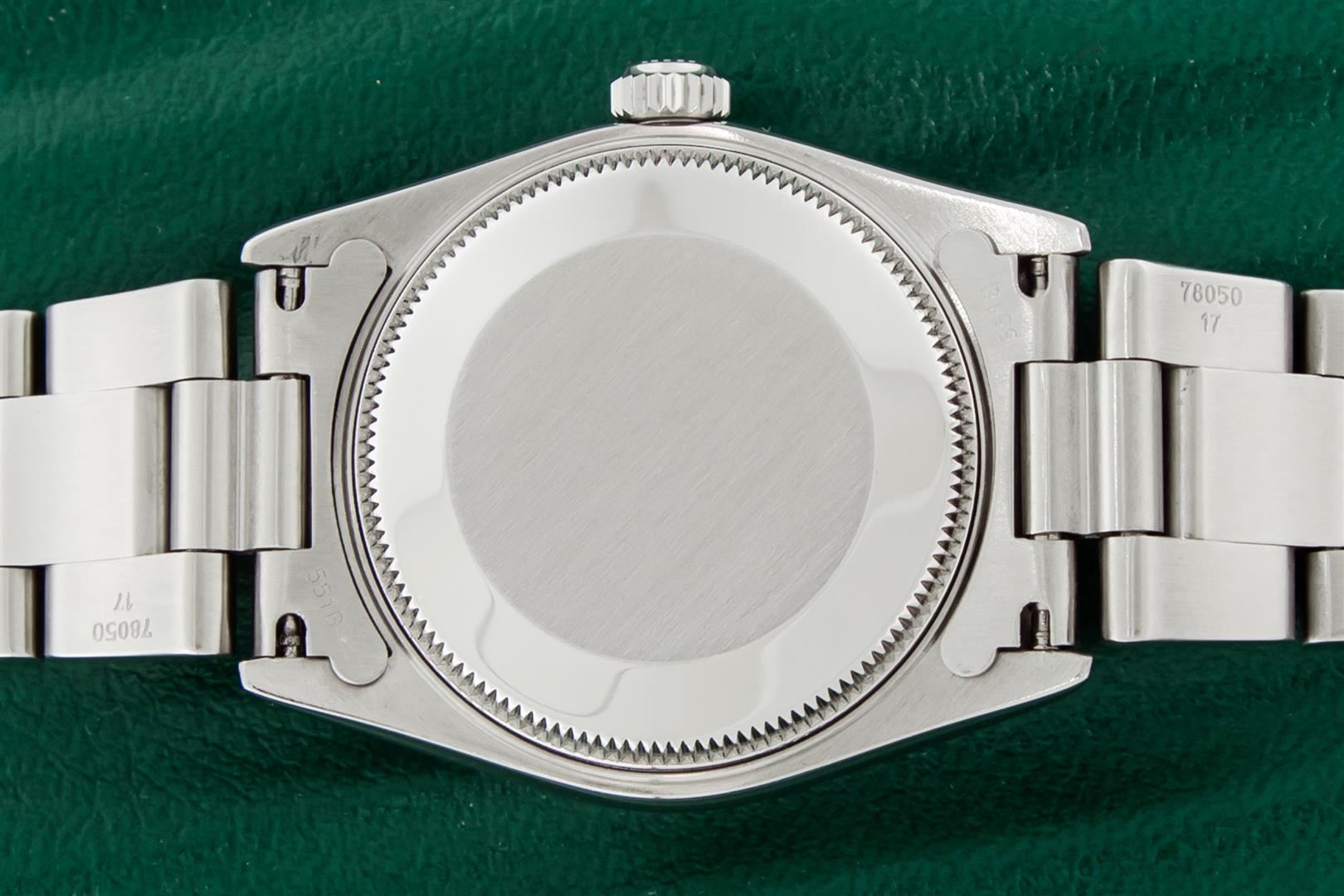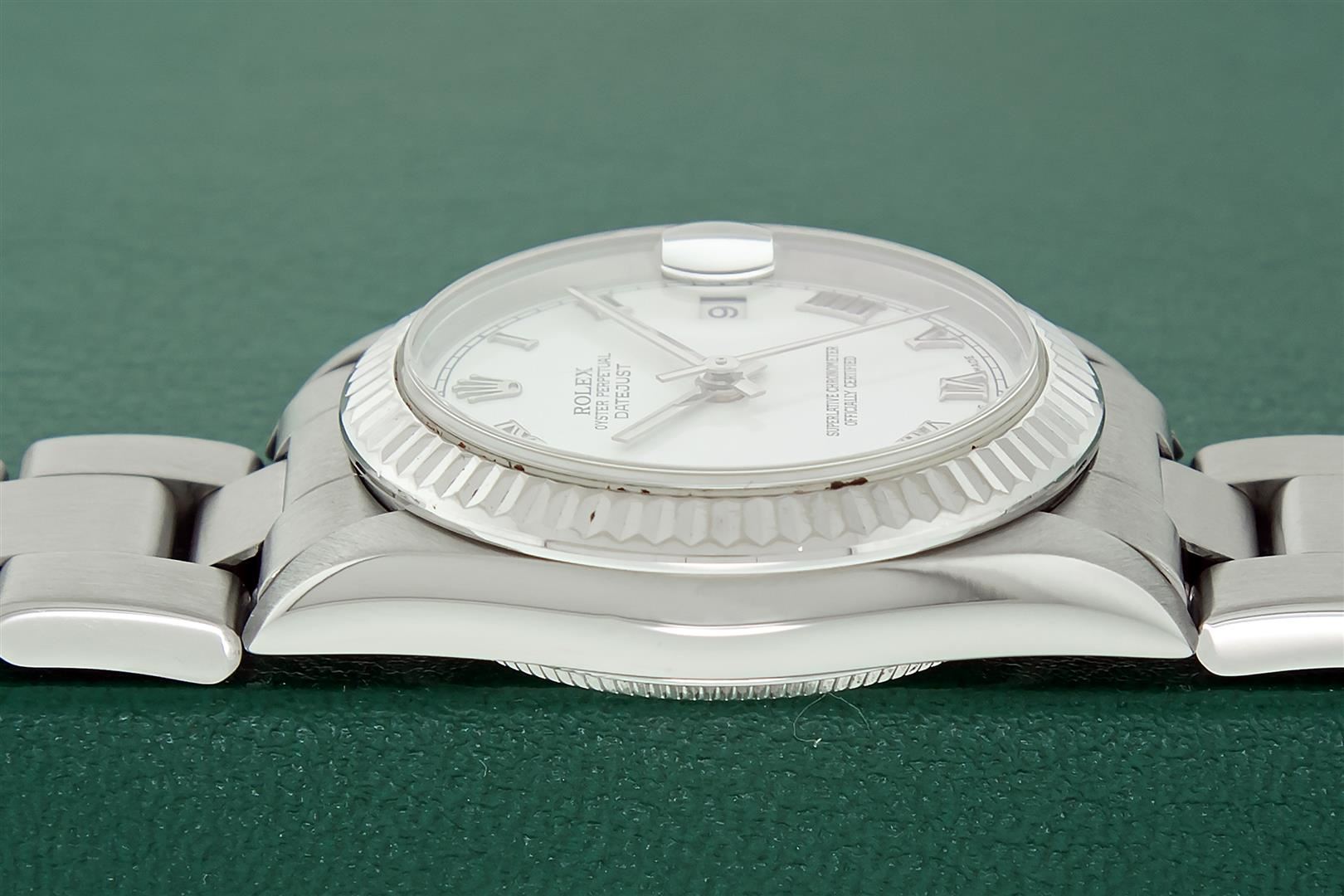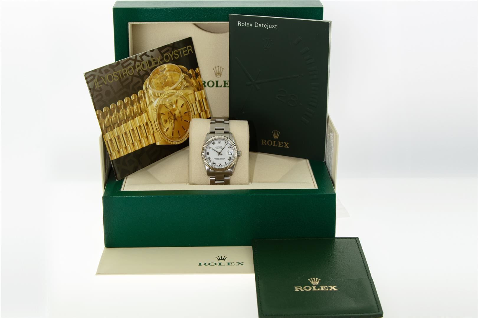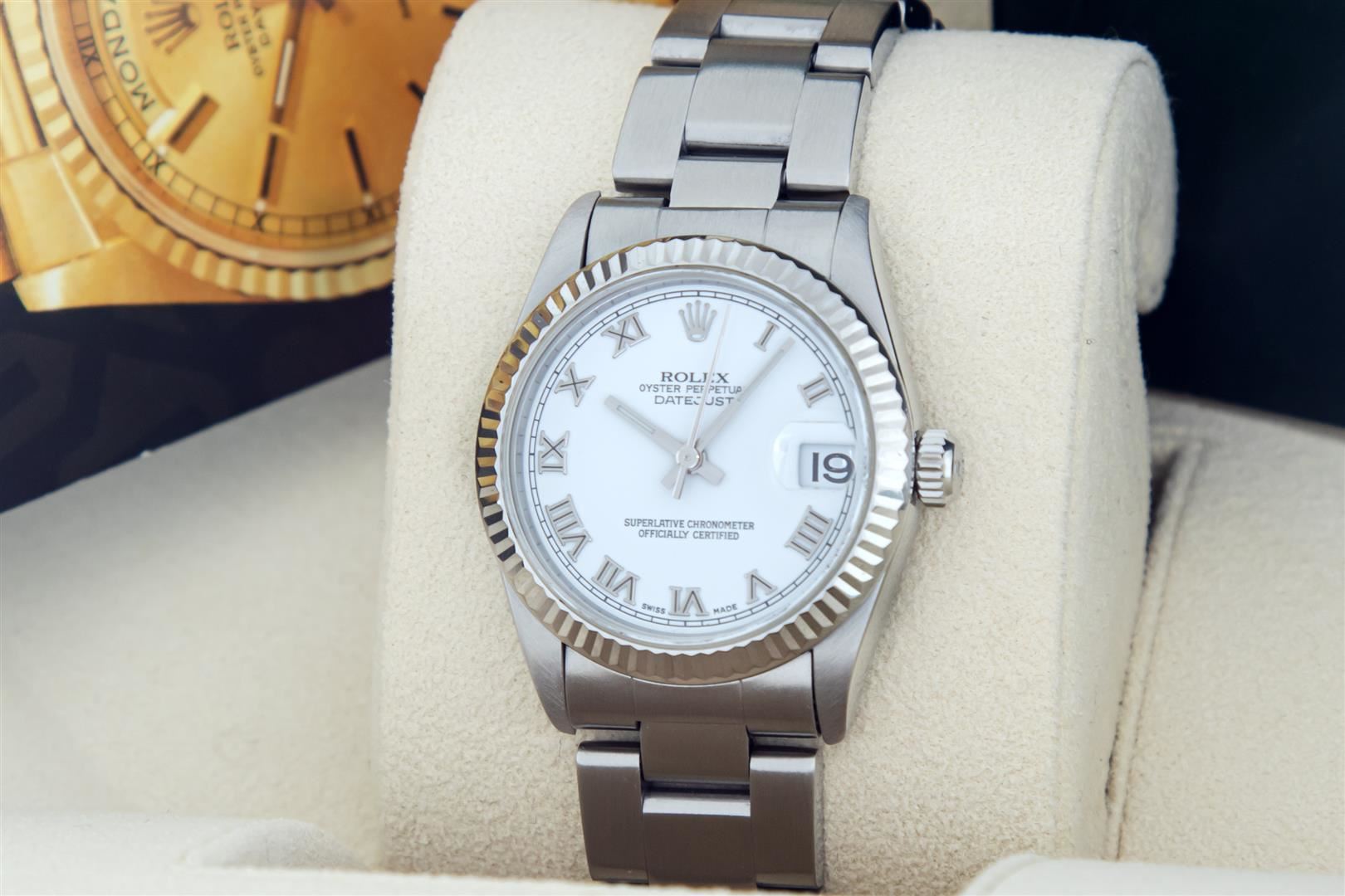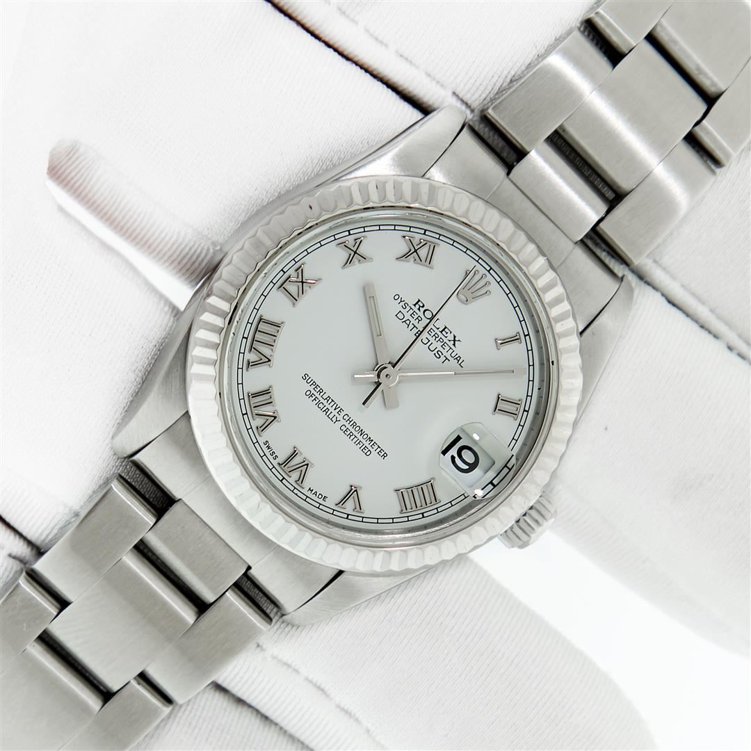 One Women's Pre Owned Midsize Stainless Steel Rolex Datejust Polished, Serviced & Electronically Tested, Rolex Stainless Steel Case Case: 31mm, Rolex Stainless Steel Crown, Rolex Bezel: 18K White Gold Fluted Bezel, Crystal: Sapphire With Cyclops Lens. Hands: Lumi Hands. Rolex Movement: Automatic Winding Movement. Rolex Dial: Factory White Roman With Index Hour Markers. Date Window: 3 O'Clock Position Date Display, Quickset, Model: Midsize Datejust. Condition: G-6 Extra Fine. Rolex Bracelet: Stainless Steel Oyster Band. Bright Polish. 6.0 Inch Length, Adjustable. Standard Clasp, With Rolex Logo. This Watch Has Been Serviced Time Tested And Is In Excellent Condition It Is Free Of All Scratches And Dents.
