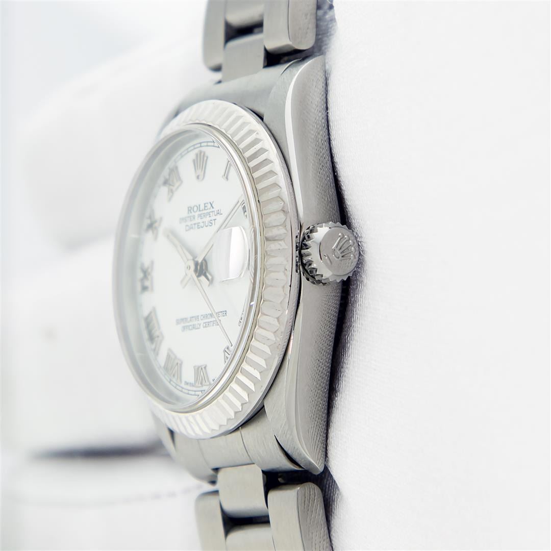 One Women's Pre Owned Midsize 31MM Stainless Steel Rolex Datejust Polished, Serviced & Electronically Tested, Rolex Stainless Steel Case Case: 31mm, Rolex Stainless Steel Crown, Rolex Bezel: 18K White Gold Fluted Bezel, Crystal: Sapphire With Cyclops Lens. Hands: Lumi Hands. Rolex Movement: Automatic Winding Movement 2235. Rolex Dial: White Roman With Index Hour Markers. Date Window: 3 O'Clock Position Date Display, Quickset, Model: Midsize Datejust. Condition: G-6 Extra Fine. Rolex Bracelet: Stainless Steel Oyster Band. Bright Polish. 6.0 Inch Length, Adjustable. Standard Clasp, With Rolex Logo. This Watch Has Been Serviced Time Tested And Is In Excellent Condition It Is Free Of All Scratches And Dents. This Watch Comes With A Rolex Box, Wallet, & Booklet.