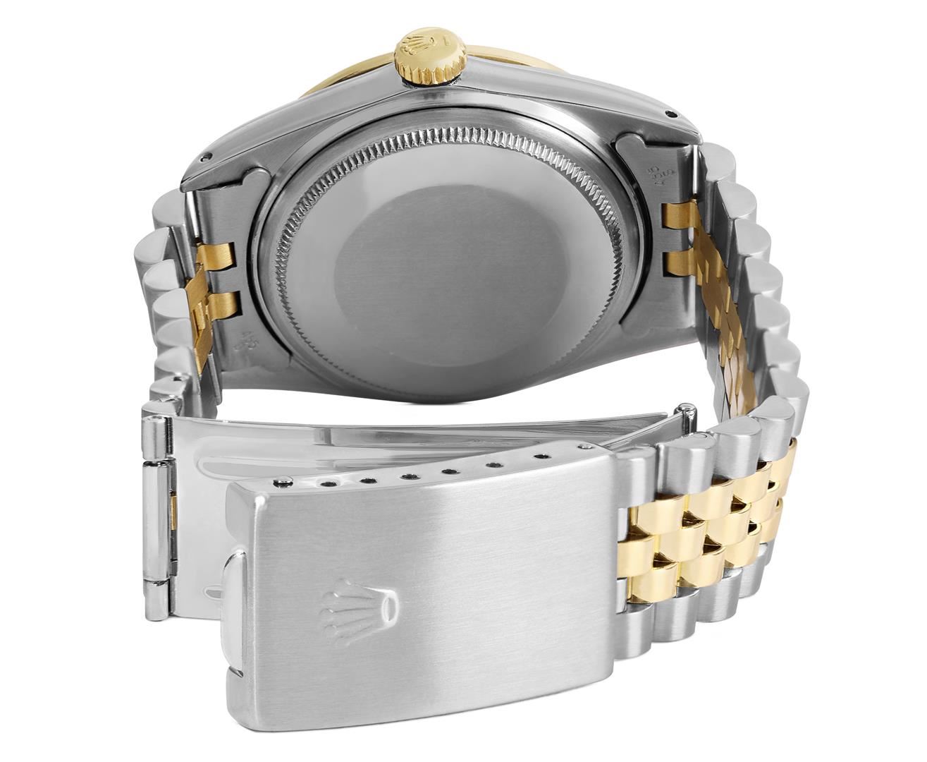 One Mens Pre Owned Yellow Gold And Steel Two Tone Rolex Datejust Polished, Serviced & Electronically Tested, Rolex Yellow Gold & Stainless Steel Case: 36mm, Rolex Yellow Gold Crown, Custom Bezel: New 18K Yellow Gold Beadset Diamond Bezel, Diamond Count: 44 Diamonds, Clarity: SI-VS, Color: G to H. Custom Crystal: New Sapphire With Magnified Date Window. Custom Hands: New Luminecent Hands. Rolex Movement: Automatic Winding Movement 3035. Rolex Dial: Champagne Dial With Index Hour Markers and Dash Track With Lumi Dots. Date Window: 3 O'Clock Position Date Display, Quickset, Model: Quickset Datejust. Condition: G-6 Extra Fine. Rolex Bracelet: Two Tone Yellow Gold & Stainless Steel Jubilee Band. Bright Polish. 7.0 Inch Length, Adjustable. Fold Clasp, With Rolex Logo. This Watch Has Been Serviced Time Tested And Is In Excellent Condition It Is Free Of All Scratches And Dents.