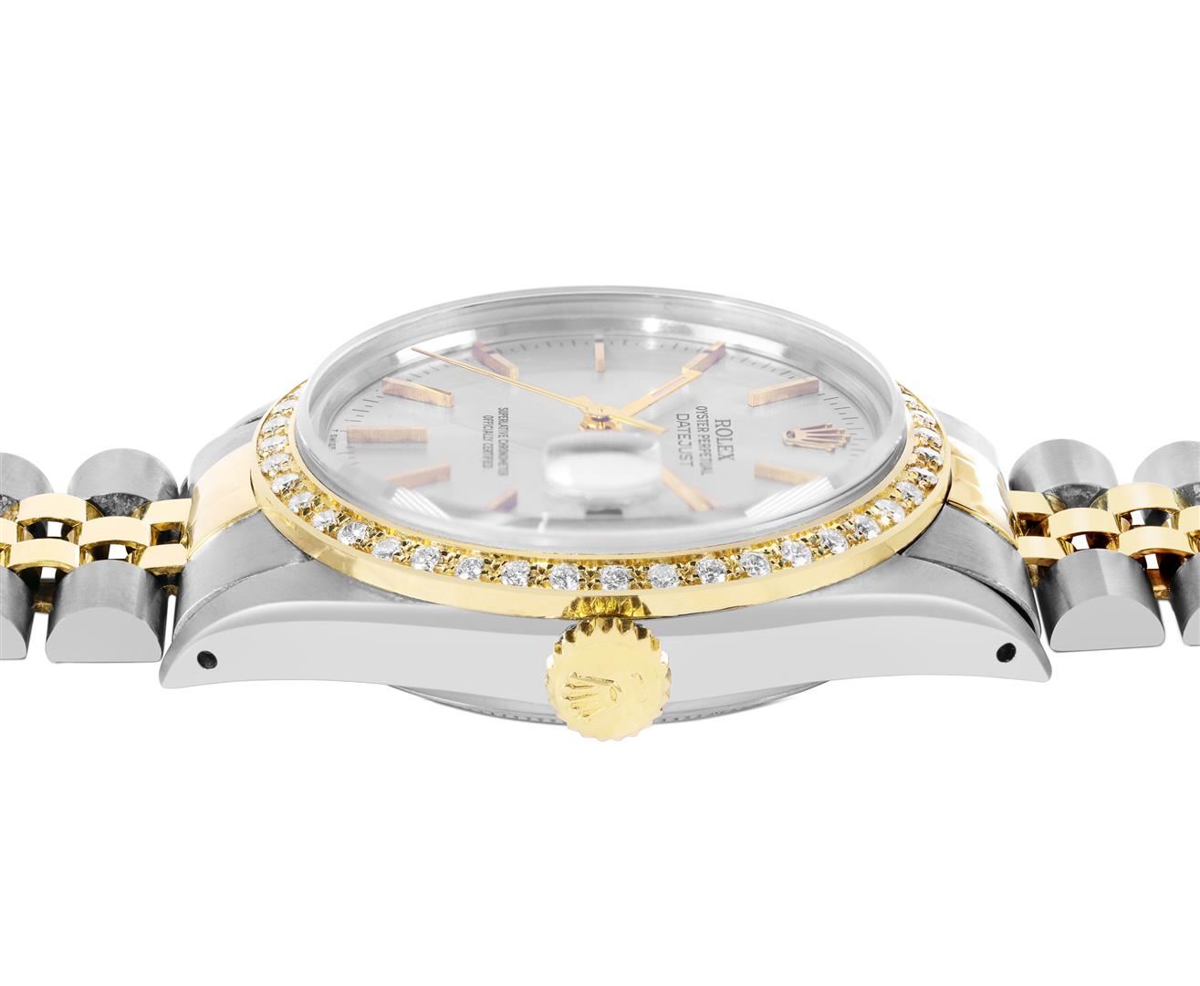 One Mens Pre Owned Yellow Gold Two Tone And Steel Rolex Datejust Polished, Serviced & Electronically Tested, Rolex Yellow Gold & Stainless Steel Case: 36mm, Rolex Yellow Gold Crown, Custom Bezel: New 18K Yellow Gold Beadset Diamond Bezel, Diamond Count: 44 Diamonds, Clarity: SI-VS, Color: G to H. Custom Crystal: New Sapphire With Magnified Date Window. Custom Hands: New Luminecent Hands. Rolex Movement: Automatic Winding Movement 3035. Rolex Dial: Silver Dial With Index Hour Markers and Dash Track With Lumi Dots. Date Window: 3 O'Clock Position Date Display, Quickset, Model: Quickset Datejust. Condition: G-6 Extra Fine. Rolex Bracelet: Two Tone Yellow Gold & Stainless Steel Jubilee Band. Bright Polish. 7.0 Inch Length, Adjustable. Standard Clasp, With Rolex Logo. This Watch Has Been Serviced Time Tested And Is In Excellent Condition It Is Free Of All Scratches And Dents. This Watch Comes With A Rolex Box.