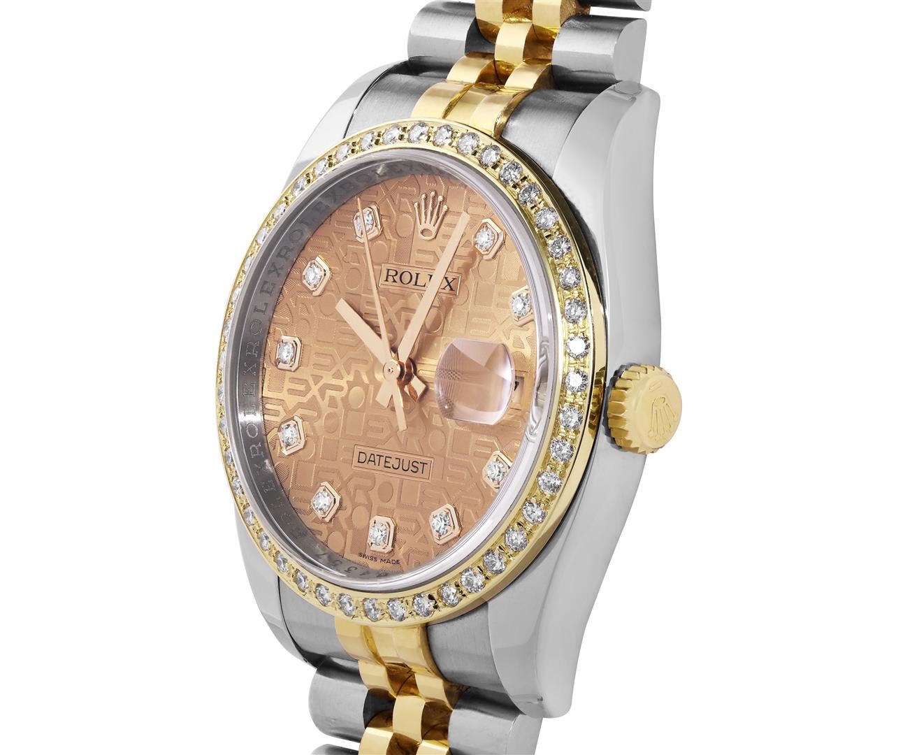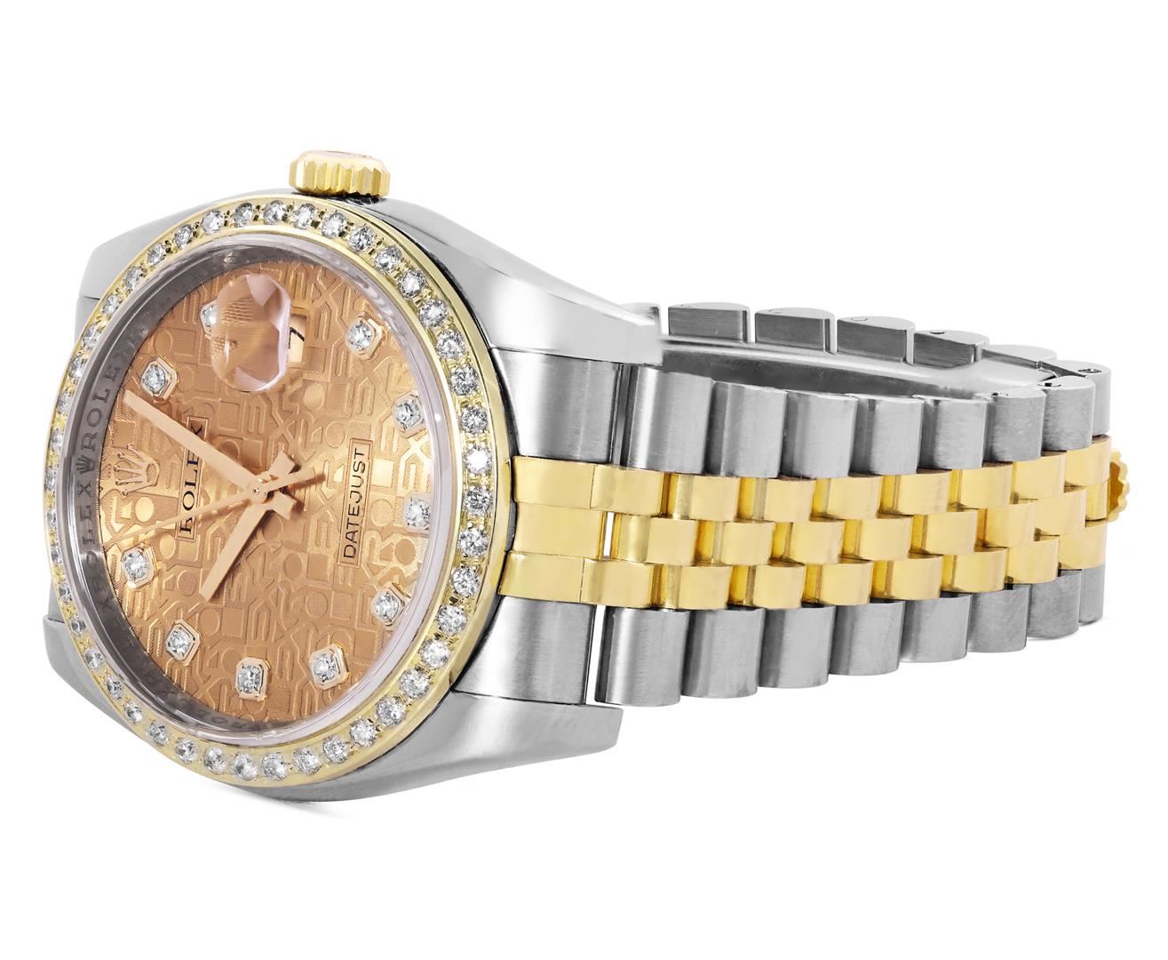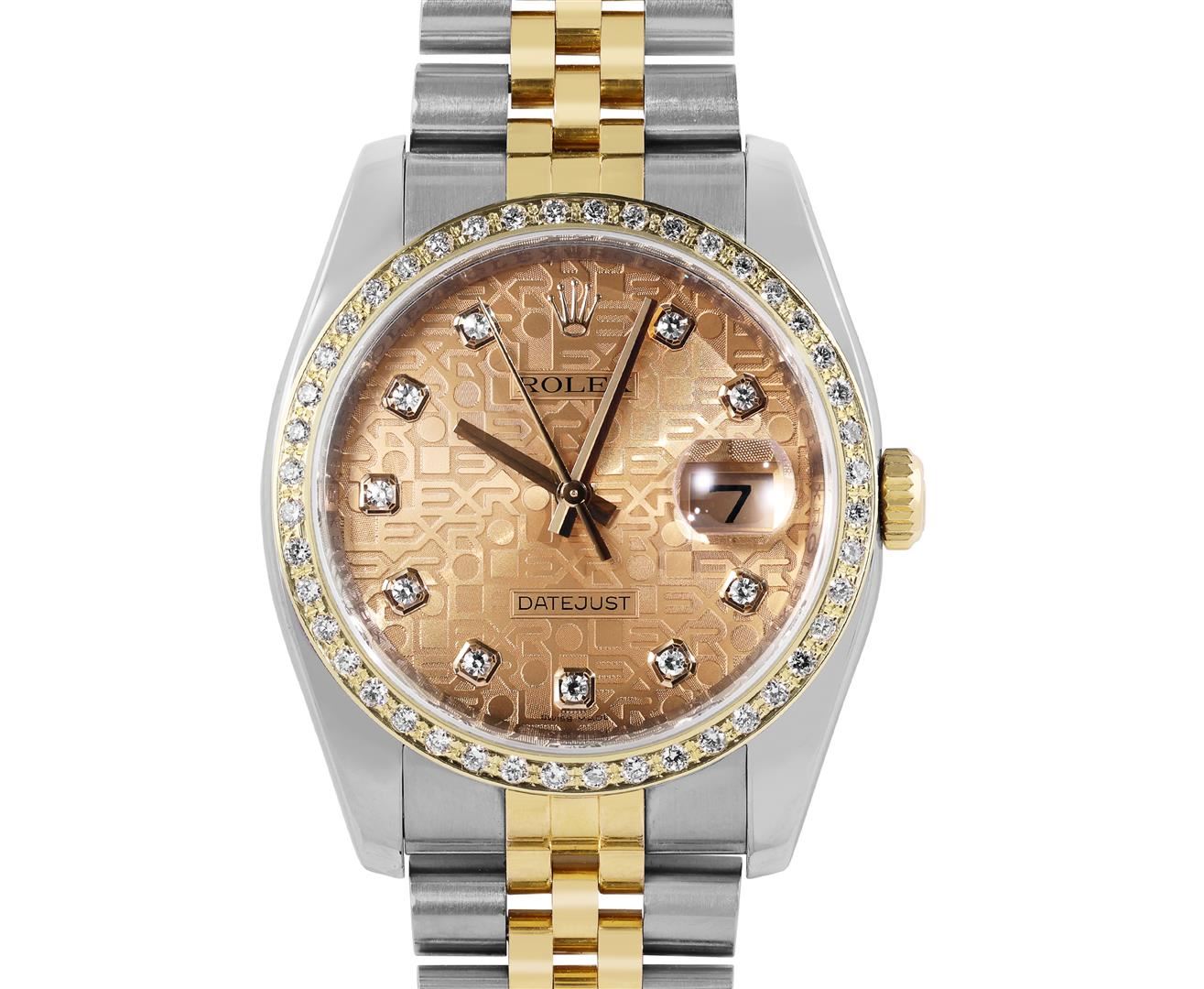 One Mens Pre Owned 18K Yellow Gold & Stainless Steel Rolex Datejust 36MM Polished, Serviced & Electronically Tested, Rolex Yellow Gold & Stainless Steel Case: 36mm, Rolex Yellow Gold Crown, Custom Bezel: New 18K Yellow Gold Beadset Diamond Bezel, Diamond Count: 44 Diamonds, Clarity: SI-VS, Color: G to H. Crystal: Sapphire With Magnified Date Window. Hands: Solid Hands. Rolex Movement: Automatic Winding Movement 3135. Rolex Dial: Factory Champagne Jubilee Diamond Dial Diamond Count: 10 Diamonds On Dial, Clarity: VVS. Date Window: 3 O'Clock Position Date Display, Quickset, Model: 116233 Datejust. Condition: G-6 Extra Fine. Rolex Bracelet: Two Tone 18K Yellow Gold & Stainless Steel Jubilee Band. Bright Polish. 7.0 Inch Length, Adjustable. Hidden Clasp, With Rolex Logo. This Watch Has Been Serviced And Polished It Is Free Of All Scratches And Dents.