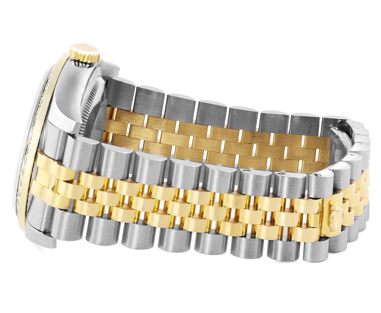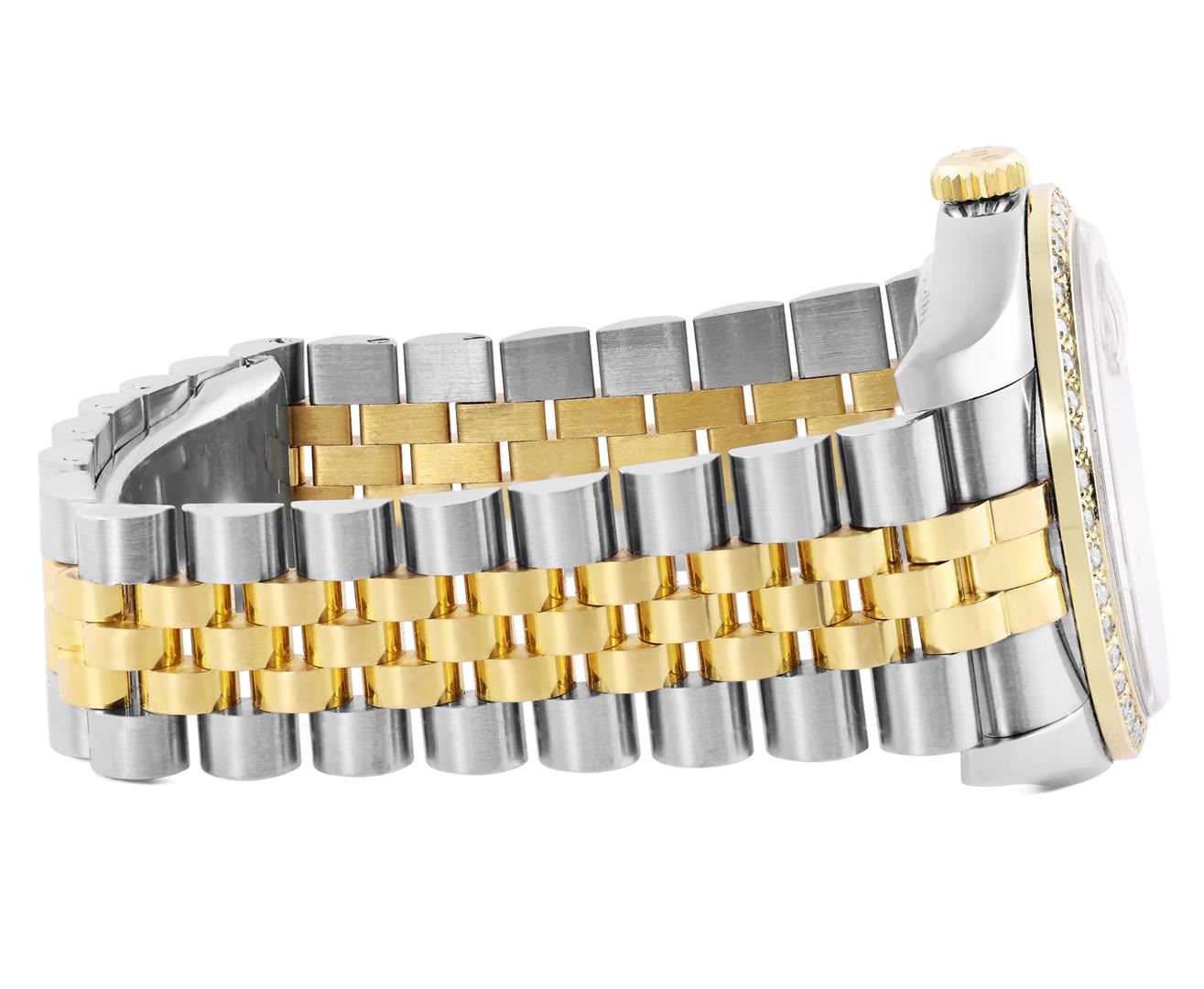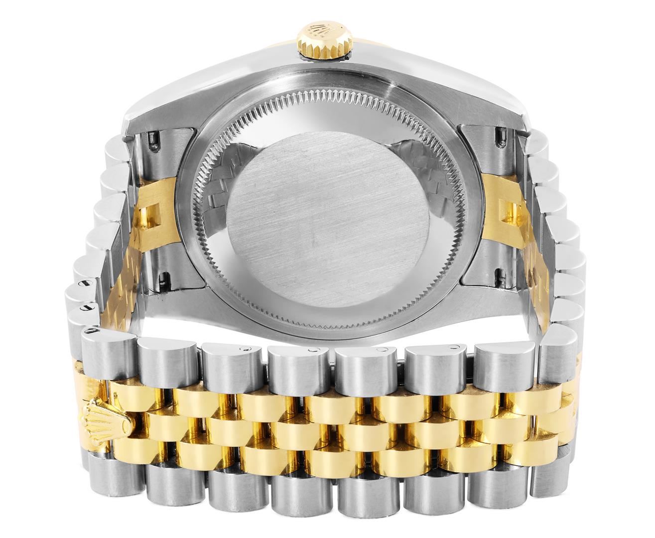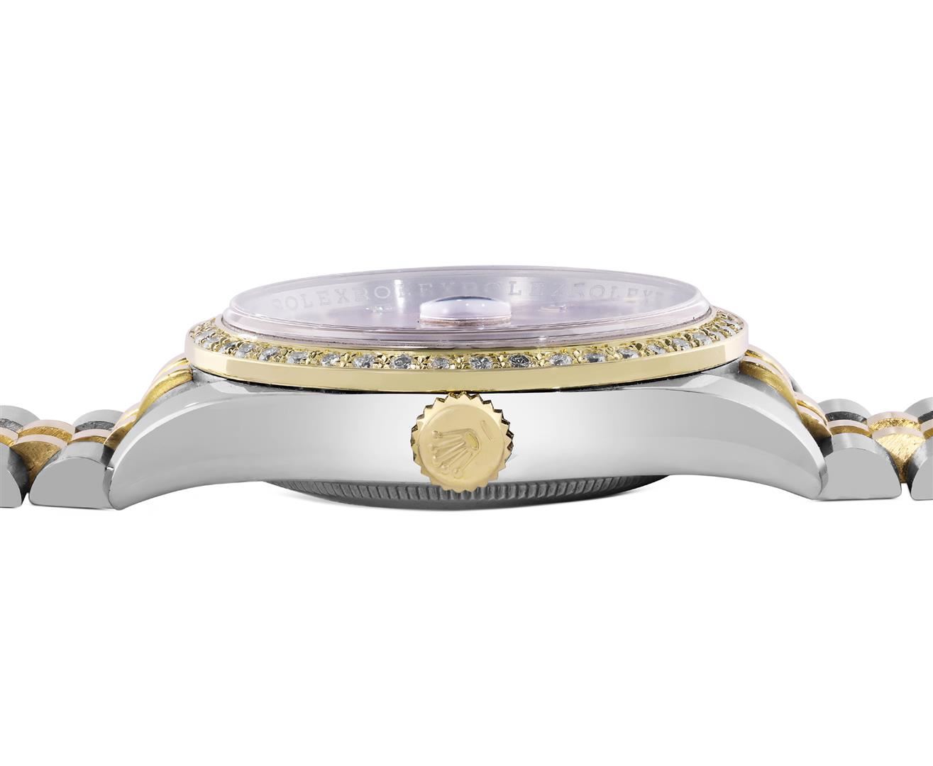 One Mens Pre Owned 18K Yellow Gold & Stainless Steel Rolex Datejust 36MM Polished, Serviced & Electronically Tested, Rolex Yellow Gold & Stainless Steel Case: 36mm, Rolex Yellow Gold Crown, Custom Bezel: New 18K Yellow Gold Beadset Diamond Bezel, Diamond Count: 44 Diamonds, Clarity: SI-VS, Color: G to H. Crystal: Sapphire With Magnified Date Window. Hands: Solid Hands. Rolex Movement: Automatic Winding Movement 3135. Rolex Dial: Factory Champagne Jubilee Diamond Dial Diamond Count: 10 Diamonds On Dial, Clarity: VVS. Date Window: 3 O'Clock Position Date Display, Quickset, Model: 116233 Datejust. Condition: G-6 Extra Fine. Rolex Bracelet: Two Tone 18K Yellow Gold & Stainless Steel Jubilee Band. Bright Polish. 7.0 Inch Length, Adjustable. Hidden Clasp, With Rolex Logo. This Watch Has Been Serviced And Polished It Is Free Of All Scratches And Dents.
