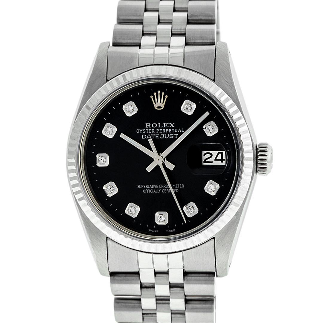 One Rolex Stainless Steel 36MM Datejust Polished Bright with Satin Finish, This Watch Has Been Serviced & Electronically Tested, Stainless Steel Case: 36mm, Stainless Steel Crown, Rolex Bezel: White Gold Fluted Bezel, Custom Crystal: New Sapphire With Magnified Date Window. Custom Hands: New Luminescent Hands. Rolex Movement: Automatic Winding Movement 3035. Custom Dial: Custom Black Diamond Dial With Added Diamond Hour Makers, Diamond Count: 10 Diamonds On Dial. Date Window: 3 O'Clock Position Date Display, Quickset, Model: Datejust. Condition: G-6 Extra Fine. Rolex Bracelet: Stainless Steel Jubilee Band. Bright Polish & Satin Finish. 7.0 Inch Length, Adjustable. Standard Clasp, With Rolex Logo. This Watch Has Been Serviced Time Tested And Is In Excellent Condition It Is Free Of All Scratches And Dents.