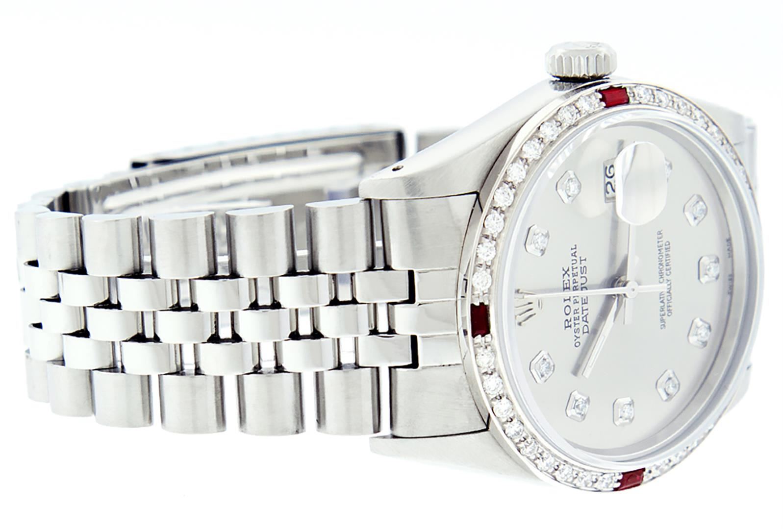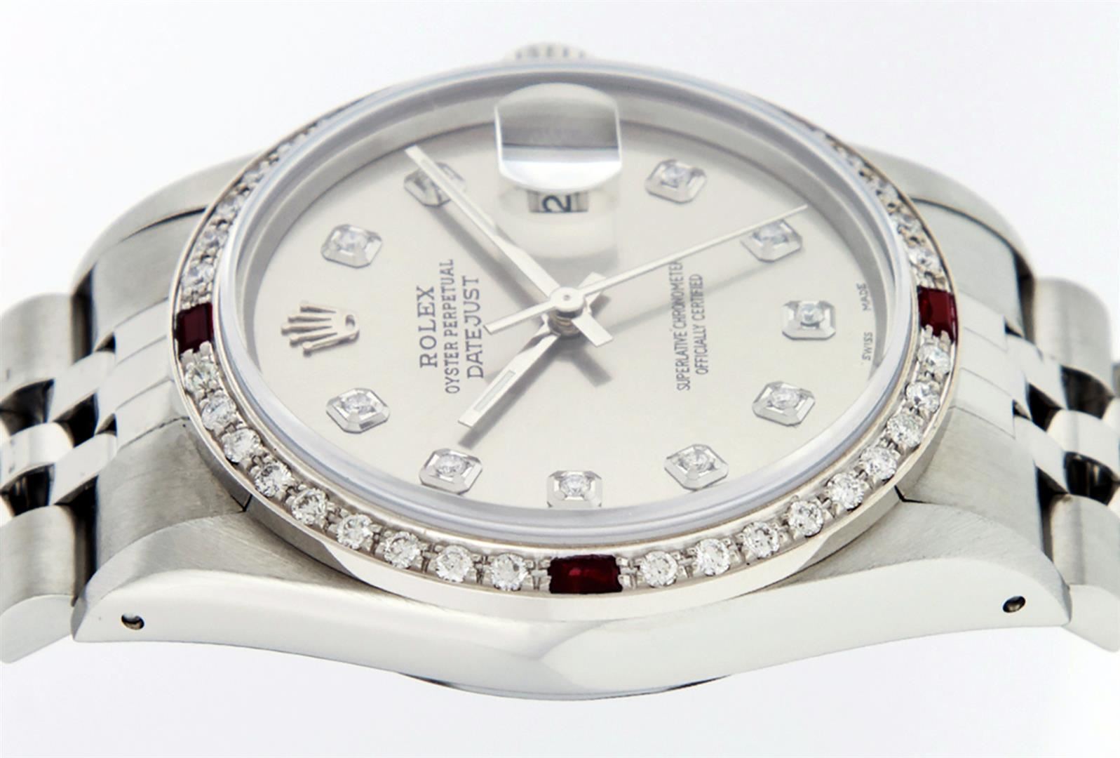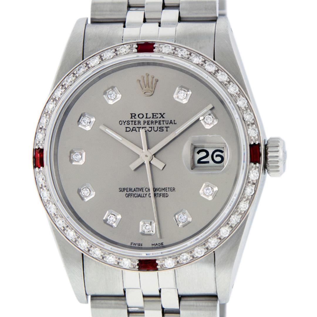One Pre Owned Stainless Steel Rolex Datejust 36MM Polished Bright with Satin Finish, This Watch Has Been Serviced & Electronically Tested, Rolex Stainless Steel Case: 36mm, Rolex Stainless Steel Crown, Custom Bezel: New 18K White Gold Ruby Beadset Diamond Bezel, Diamond + Gem Count: 36 Diamonds + 4 Rubies. Custom Crystal: New Sapphire With Date Window. Custom Hands: New Luminescent Hands. Rolex Movement: Automatic Winding Movement 3035. Custom Dial: Custom Slate Grey Dial With Added Diamond Hour Markers, Diamond Count: 10 Diamonds in Dial. Date Window: 3 O'Clock Position Date Display, Quickset, Model: Datejust, Condition: G-6 Extra Fine. Rolex Bracelet: Stainless Steel Jubilee Band. Bracelet: 7.0 Inch Length, Adjustable. Standard Clasp, With Rolex Logo. This Watch Has Been Serviced Time Tested And Is In Excellent Condition It Is Free Of All Scratches And Dents.
