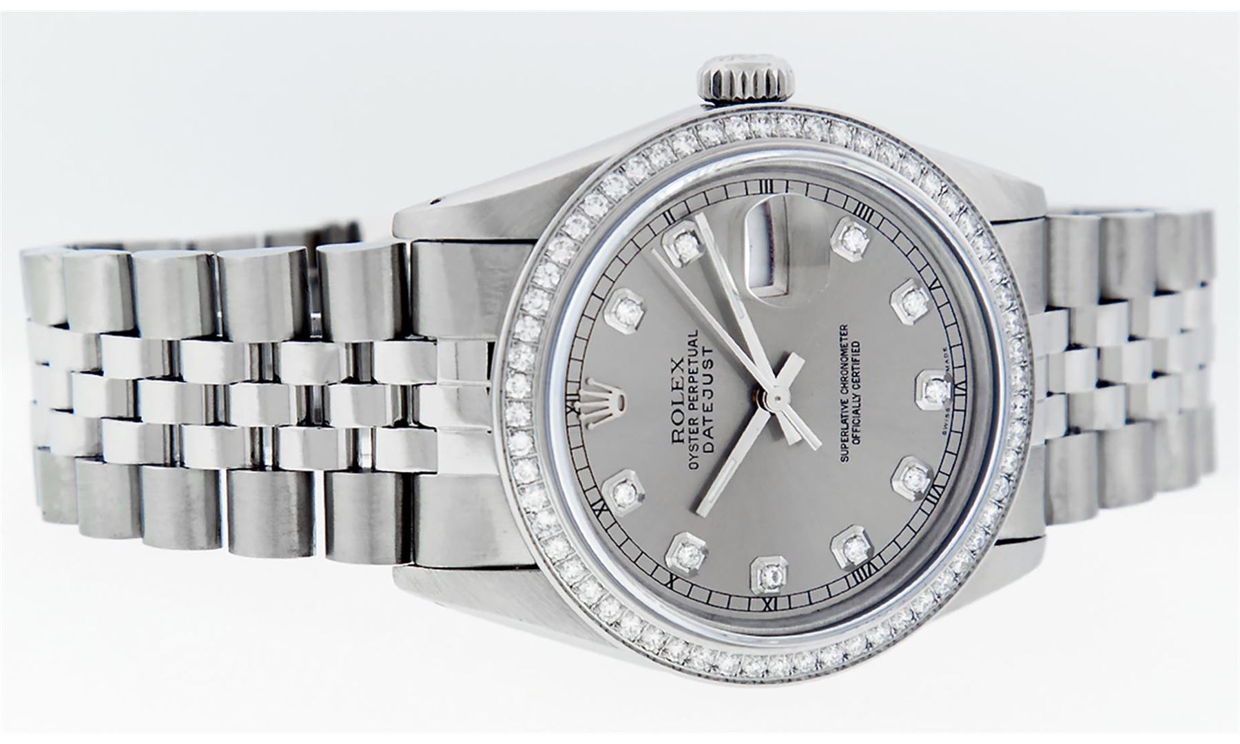 One Pre Owned Rolex Stainless Steel Datejust Polished Bright with Satin Finish, This Watch Has Been Serviced & Electronically Tested, Stainless Steel Case: 36mm, Stainless Steel Crown, Custom Bezel: New Stainless Steel Beadset Diamond Bezel, Diamond Count: 54 Diamonds. Custom Crystal: New Sapphire With Magnified Date Window. Custom Hands: New Luminescent Hands. Movement: Automatic Winding Movement 3035. Custom Dial: Custom Slate Grey Dial With Added Diamond Hour Markers, Diamond Count: 10 Diamonds In Dial. Date Window: 3 O'Clock Position Date Display, Quickset, Model: Datejust. Condition: G-6 Extra Fine. Rolex Bracelet: Stainless Steel Jubilee Band. Bright Polish & Satin Finish. 7.0 Inch Length, Adjustable. Fold Clasp, With Rolex Logo. This Watch Has Been Serviced Time Tested And Is In Excellent Condition It Is Free Of All Scratches And Dents.