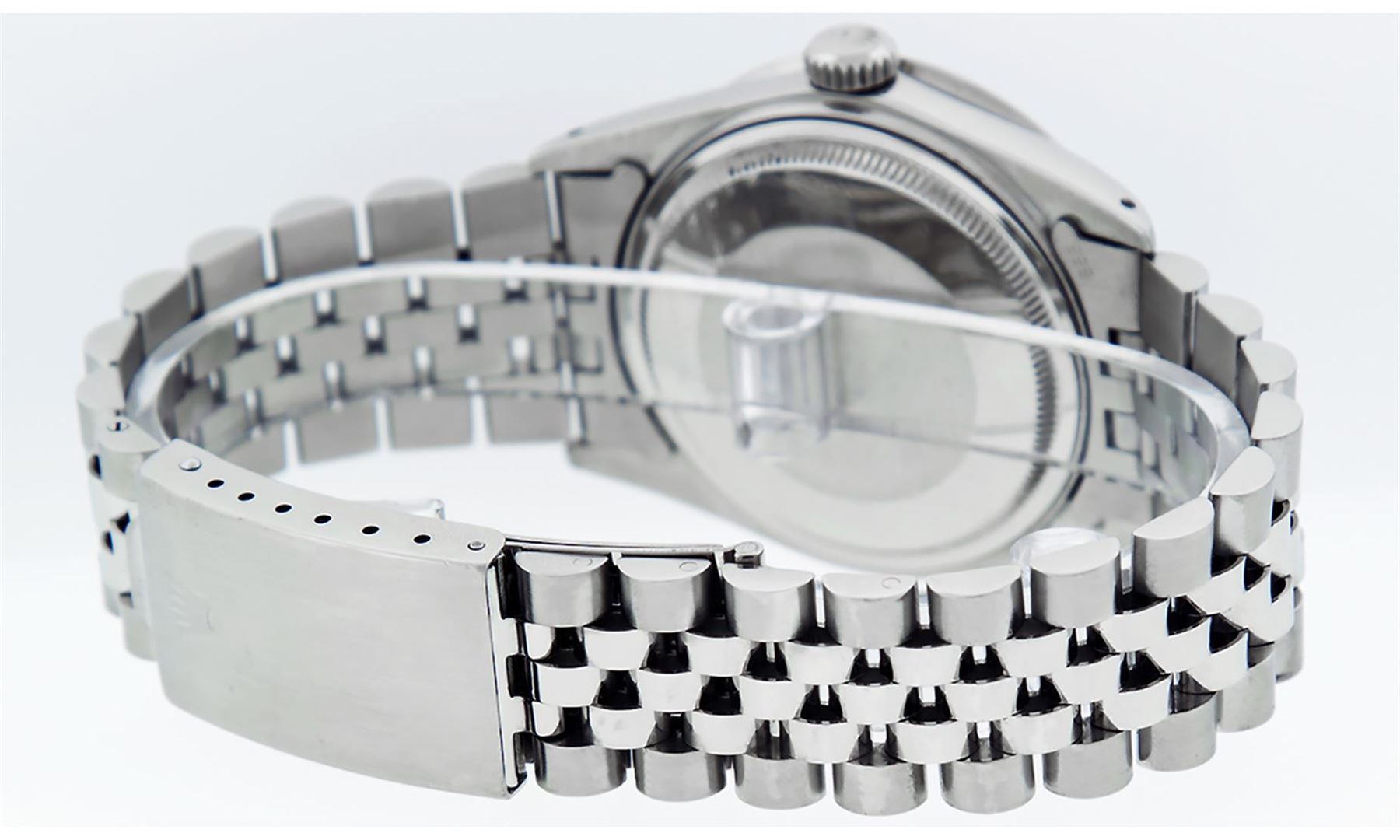 One Pre Owned Rolex Stainless Steel Datejust Polished Bright with Satin Finish, This Watch Has Been Serviced & Electronically Tested, Stainless Steel Case: 36mm, Stainless Steel Crown, Custom Bezel: New Stainless Steel Beadset Diamond Bezel, Diamond Count: 54 Diamonds. Custom Crystal: New Sapphire With Magnified Date Window. Custom Hands: New Luminescent Hands. Movement: Automatic Winding Movement 3035. Custom Dial: Custom Slate Grey Dial With Added Diamond Hour Markers, Diamond Count: 10 Diamonds In Dial. Date Window: 3 O'Clock Position Date Display, Quickset, Model: Datejust. Condition: G-6 Extra Fine. Rolex Bracelet: Stainless Steel Jubilee Band. Bright Polish & Satin Finish. 7.0 Inch Length, Adjustable. Fold Clasp, With Rolex Logo. This Watch Has Been Serviced Time Tested And Is In Excellent Condition It Is Free Of All Scratches And Dents.