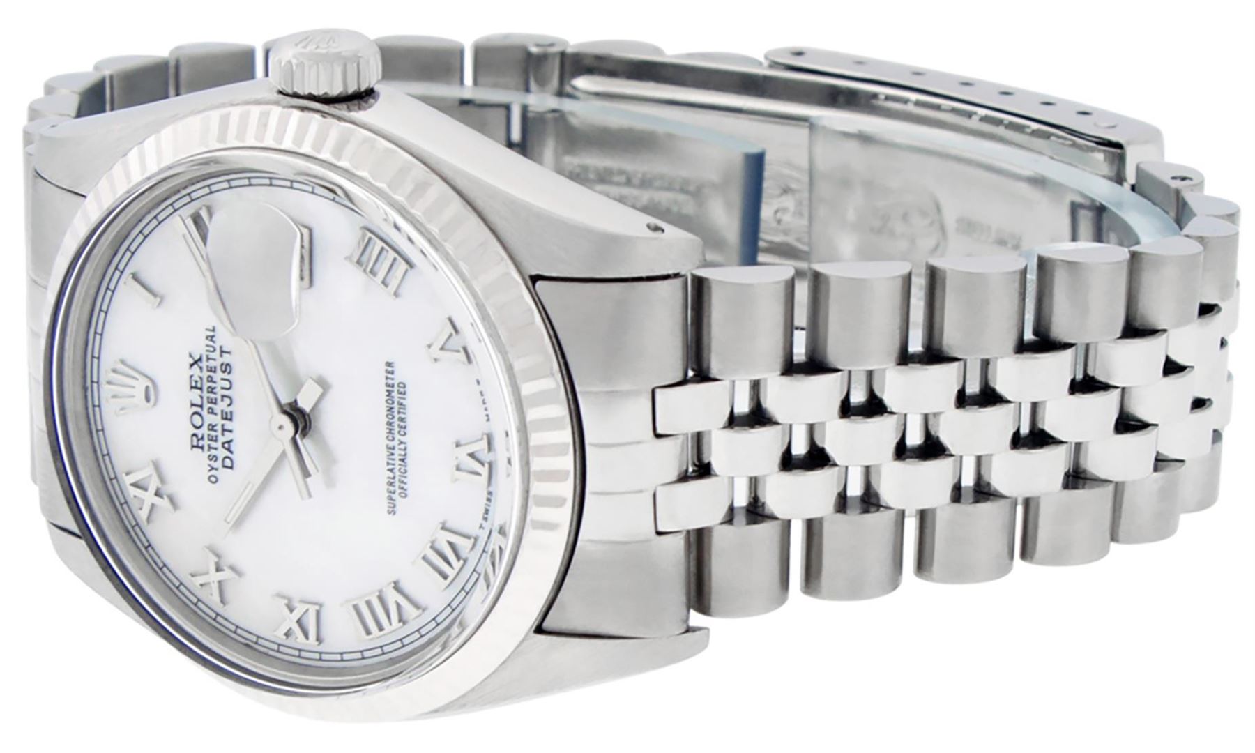 One Pre Owned Stainless Steel Rolex Datejust Polished Bright with Satin Finish, Serviced & Electronically Tested, Rolex Stainless Steel Case: 36mm, Rolex Stainless Steel Crown, Rolex Bezel: 14K White Gold Fluted Bezel. Custom Crystal: New Plexiglass With Magnified Date Window. Custom Hands: New Luminecent Hands. Rolex Movement: Automatic Winding Movement 3035. Custom Dial: Custom White Roman Dial With Square Track. Date Window: 3 O'Clock Position Date Display, Quickset, Model: Datejust, Condition: G-6 Extra Fine. Rolex Bracelet: Stainless Steel Jubilee Band. Bright Polish & Satin Finish. 7.0 Inch Length, Adjustable. Fold Clasp, With Rolex Logo. This Watch Has Been Serviced And Polished It Is Free Of All Scratches And Dents.