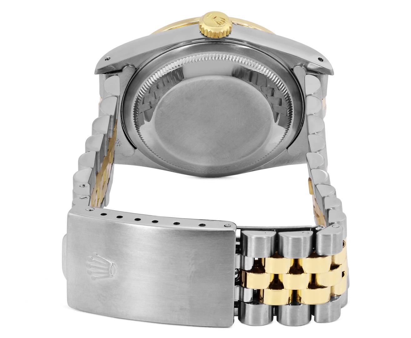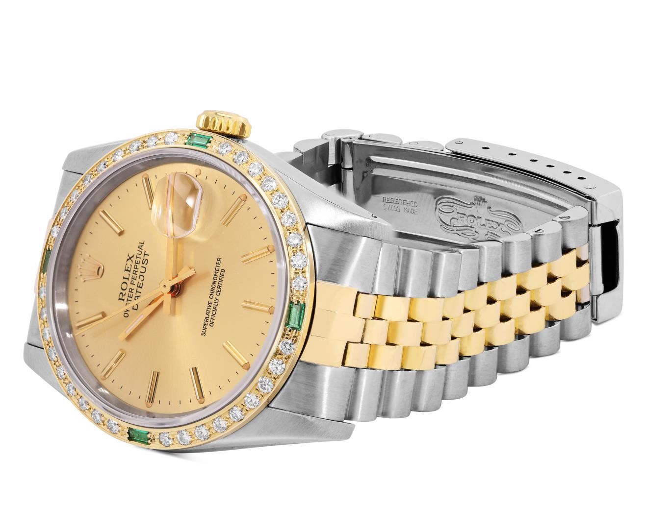 One Mens Pre Owned Quickset Sapphire Two Tone 18K Yellow Gold And Stainless Steel Rolex Datejust Polished, Serviced and Electronically Tested, Yellow Gold And Stainless Steel Case: 36mm, Rolex Yellow Gold Crown, Custom Bezel: New 18K Yellow Gold Emerald Beadset Diamond Bezel, Diamond Count: 36 Diamonds + 4 Emeralds. Custom Crystal: New Sapphire With Magnified Date Window. Custom Hands: New Lumi Hands. Rolex Movement: Automatic Winding Movement 3135. Rolex Factory Dial: Champagne Index Dial With Dash Track And Lumi Dots. Date Window: 3 O'Clock Position Date Display, Quickset, Model: Quickset Datejust. Condition: G-6 Extra Fine. Rolex Bracelet: Two Tone Yellow Gold And Stainless Steel Jubilee Band. Bright Polish. 7.0 Inch Length, Adjustable. Fold Clasp, With Rolex Logo. This Watch Has Been Serviced Time Tested And Is In Excellent Condition It Is Free Of All Scratches And Dents. This Watch Comes With A Rolex Box.