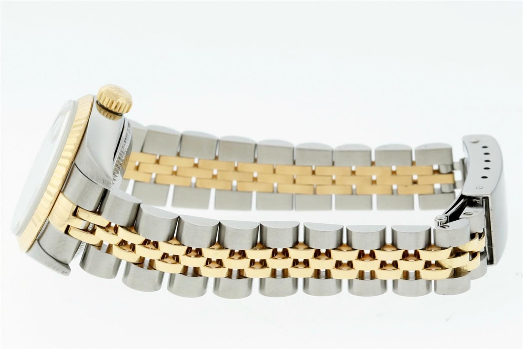 Rolex Ladies Sapphire Quickset 18K Yellow Gold and Stainless Steel Two Tone Oyster Perpetual Datejust Polished Bright with Satin Finish, Serviced & Electronically Tested, Stainless Steel Case: 26mm, 18K Yellow Gold Crown, Bezel: Original Rolex 18K Yellow Gold Fluted Bezel. Custom Crystal: New Scratch Resistant Sapphire Cyclops Lens. Custom Hands: New luminous hands. Movement: Automatic Quickset Winding Movement 2135. Original Dial: Rare Rolex White Diamond Dial With Romans, Diamond Count: 10 Diamonds In Dial, Clarity: VVS, Date Window: 3 O'Clock Position Date Display, Model: Quickset Datejust Quickset Sapphire 69173, Condition: G-6 Extra Fine. Bracelet: Stainless Steel and 18K Yellow Gold Jubilee Band. Bright Polish & Satin Finish. 6.0 Inch Length, Adjustable. Standard Clasp, With Rolex Logo. This Watch Has Been Serviced Time Tested And Is In Excellent Condition It Is Free Of All Scratches And Dents. This Rolex Complete Set Comes With The Following Accessories: Rolex Box, Rolex Booklets, Rolex Hang Tag, Rolex Papers. The Papers For This Watch Are Extremely Rare As They Do Not Have Anyones Name On Them!