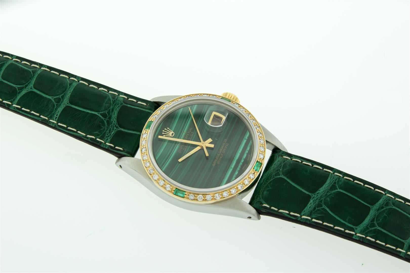 One Mens Yellow Gold Two Tone Rolex Datejust Polished, Serviced & Electronically Tested, Yellow Gold & Stainless Steel Case: 36mm, Yellow Gold Crown, Custom Bezel: 18K Yellow Gold Emerald Beadset Diamond Bezel, Diamond Count: 36 Diamonds + 4 Emeralds In Bezel, Total Bezel Weight 1.00 Carat, Clarity: SI-VS, Color: G to H. Custom Crystal: New Scratch Resistant Synthetic Sapphire Cyclops Lens. Custom Hands: New Luminecent Hands. Movement: Automatic Winding Movement. Custom Dial: Green Malachite Dial. Date Window: 3 O'Clock Position Date Display, Quickset, Model: Datejust. Condition: G-6 Extra Fine. Custom Band: New Green Leather Band With White Stitching. 7.0 Inch Length. New Custom Pink Buckle Clasp. This Watch Has Been Serviced Time Tested And Is In Excellent Condition It Is Free Of All Scratches And Dents. This Watch Comes With A Rolex Box.