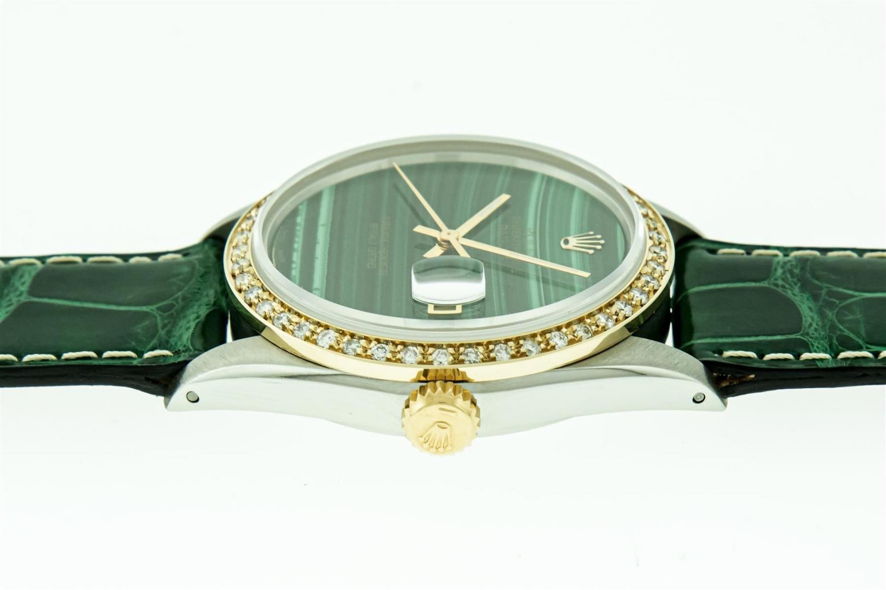 One Mens Yellow Gold Two Tone Rolex Datejust Polished, Serviced & Electronically Tested, Yellow Gold & Stainless Steel Case: 36mm, Yellow Gold Crown, Custom Bezel: 18K Yellow Gold Beadset Diamond Bezel, Diamond Count: 44 Diamonds In Bezel, Total Bezel Weight 1.00 Carat, Clarity: SI-VS, Color: G to H. Custom Crystal: New Scratch Resistant Synthetic Sapphire Cyclops Lens. Custom Hands: New Luminecent Hands. Movement: Automatic Winding Movement. Custom Dial: Green Malachite Dial. Date Window: 3 O'Clock Position Date Display, Quickset, Model: Datejust. Condition: G-6 Extra Fine. Custom Band: New Green Leather Band With White Stitching. 7.0 Inch Length. New Custom Pink Buckle Clasp. This Watch Has Been Serviced Time Tested And Is In Excellent Condition It Is Free Of All Scratches And Dents.