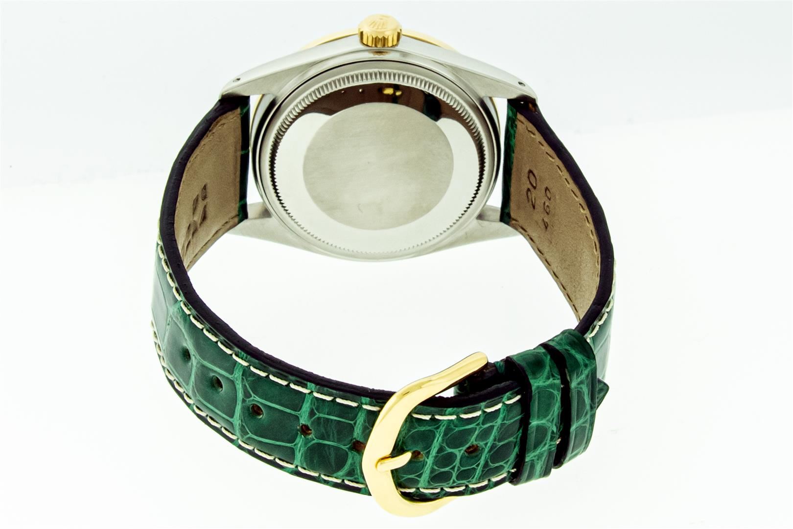 One Mens Yellow Gold Two Tone Rolex Datejust Polished, Serviced & Electronically Tested, Yellow Gold & Stainless Steel Case: 36mm, Yellow Gold Crown, Custom Bezel: 18K Yellow Gold Beadset Diamond Bezel, Diamond Count: 44 Diamonds In Bezel, Total Bezel Weight 1.00 Carat, Clarity: SI-VS, Color: G to H. Custom Crystal: New Scratch Resistant Synthetic Sapphire Cyclops Lens. Custom Hands: New Luminecent Hands. Movement: Automatic Winding Movement. Custom Dial: Green Malachite Dial. Date Window: 3 O'Clock Position Date Display, Quickset, Model: Datejust. Condition: G-6 Extra Fine. Custom Band: New Green Leather Band With White Stitching. 7.0 Inch Length. New Custom Pink Buckle Clasp. This Watch Has Been Serviced Time Tested And Is In Excellent Condition It Is Free Of All Scratches And Dents.