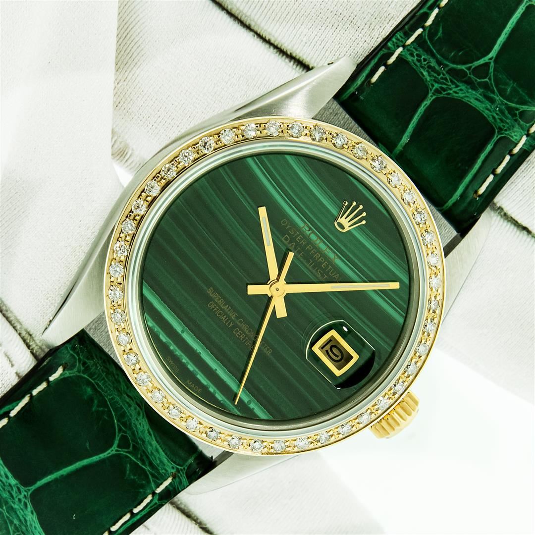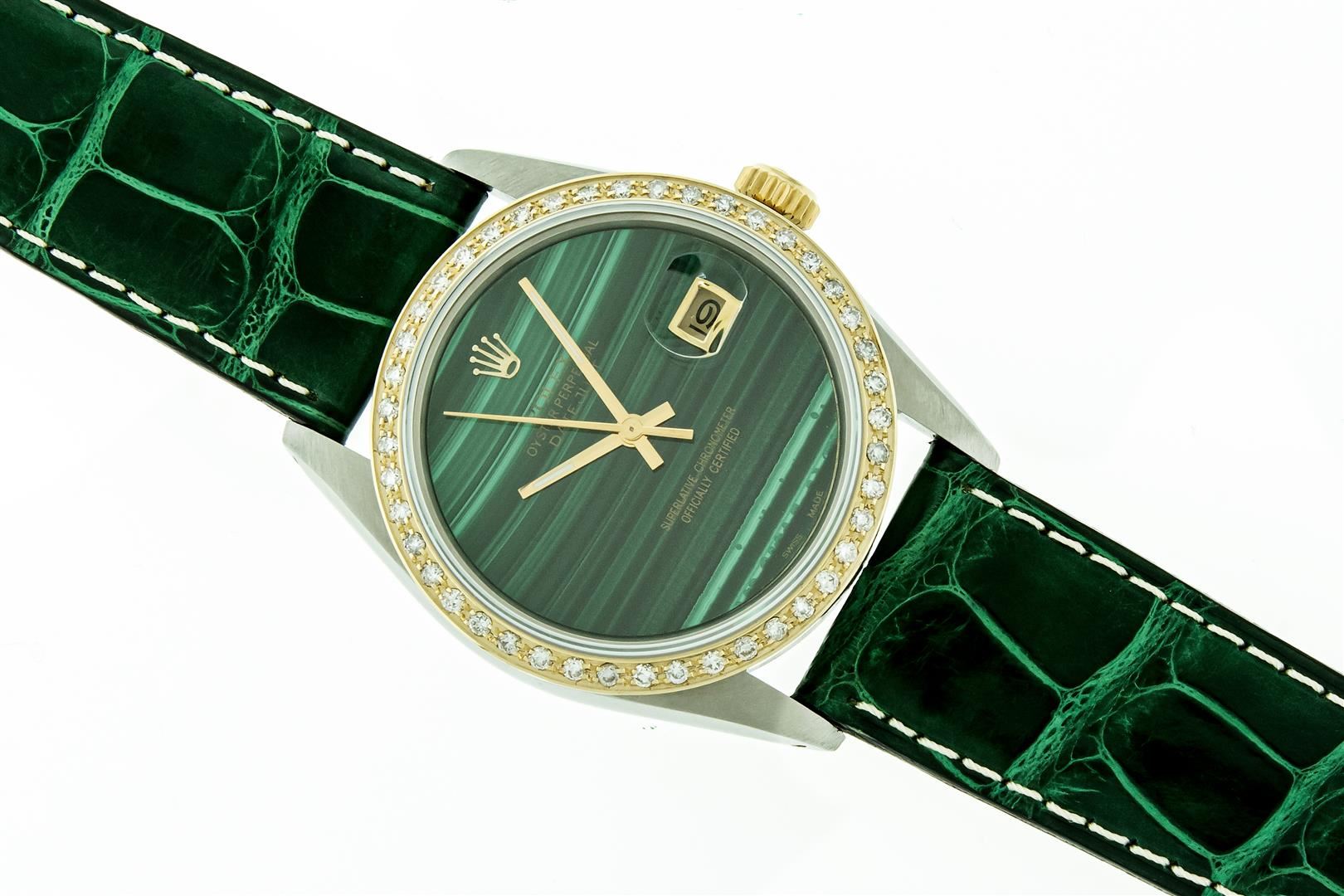 One Mens Yellow Gold Two Tone Rolex Datejust Polished, Serviced & Electronically Tested, Yellow Gold & Stainless Steel Case: 36mm, Yellow Gold Crown, Custom Bezel: 18K Yellow Gold Beadset Diamond Bezel, Diamond Count: 44 Diamonds In Bezel, Total Bezel Weight 1.00 Carat, Clarity: SI-VS, Color: G to H. Custom Crystal: New Scratch Resistant Synthetic Sapphire Cyclops Lens. Custom Hands: New Luminecent Hands. Movement: Automatic Winding Movement. Custom Dial: Green Malachite Dial. Date Window: 3 O'Clock Position Date Display, Quickset, Model: Datejust. Condition: G-6 Extra Fine. Custom Band: New Green Leather Band With White Stitching. 7.0 Inch Length. New Custom Pink Buckle Clasp. This Watch Has Been Serviced Time Tested And Is In Excellent Condition It Is Free Of All Scratches And Dents.