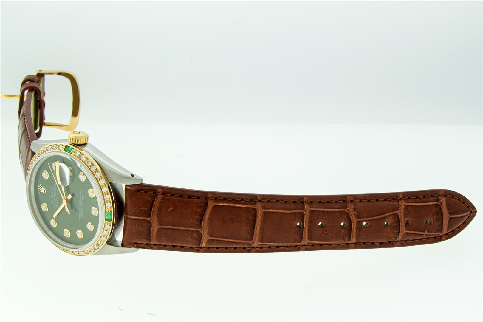 One Mens Yellow Gold Two Tone Rolex Datejust Polished, Serviced & Electronically Tested, Yellow Gold & Stainless Steel Case: 36mm, Yellow Gold Crown, Custom Bezel: 18K Yellow Gold Emerald Beadset Diamond Bezel, Diamond Count: 36 Diamonds + 4 Emeralds In Bezel, Total Bezel Weight 1.00 Carat, Clarity: SI-VS, Color: G to H. Custom Crystal: New Scratch Resistant Synthetic Sapphire Cyclops Lens. Custom Hands: New Luminecent Hands. Movement: Automatic Winding Movement. Custom Dial: Olive Green Diamond Dial. Date Window: 3 O'Clock Position Date Display, Quickset, Model: Datejust. Condition: G-6 Extra Fine. Custom Band: New Brown Leather Band 7.0 Inch Length. New Custom Pin Buckle Clasp. This Watch Has Been Serviced Time Tested And Is In Excellent Condition It Is Free Of All Scratches And Dents.