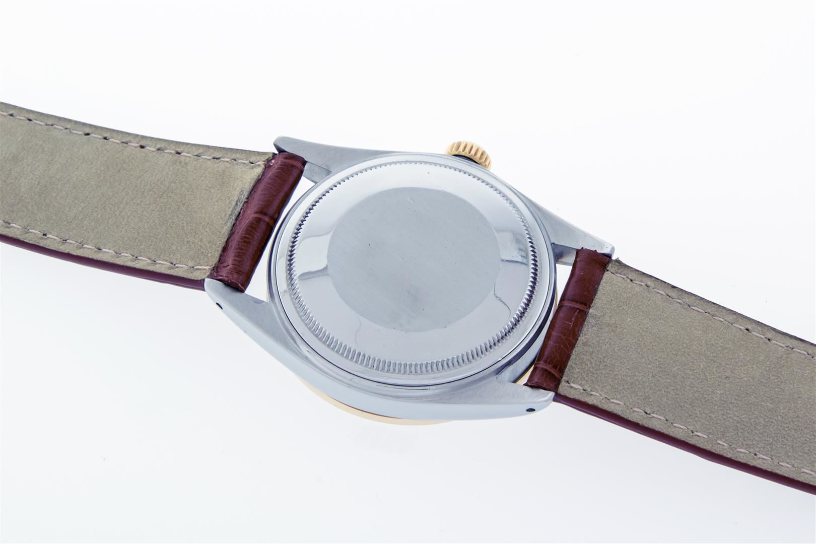 One Mens Yellow Gold Two Tone Rolex Datejust Polished, Serviced & Electronically Tested, Yellow Gold & Stainless Steel Case: 36mm, Yellow Gold Crown, Custom Bezel: 18K Yellow Gold Emerald Beadset Diamond Bezel, Diamond Count: 36 Diamonds + 4 Emeralds In Bezel, Total Bezel Weight 1.00 Carat, Clarity: SI-VS, Color: G to H. Custom Crystal: New Scratch Resistant Synthetic Sapphire Cyclops Lens. Custom Hands: New Luminecent Hands. Movement: Automatic Winding Movement. Custom Dial: Olive Green Diamond Dial. Date Window: 3 O'Clock Position Date Display, Quickset, Model: Datejust. Condition: G-6 Extra Fine. Custom Band: New Brown Leather Band 7.0 Inch Length. New Custom Pin Buckle Clasp. This Watch Has Been Serviced Time Tested And Is In Excellent Condition It Is Free Of All Scratches And Dents.
