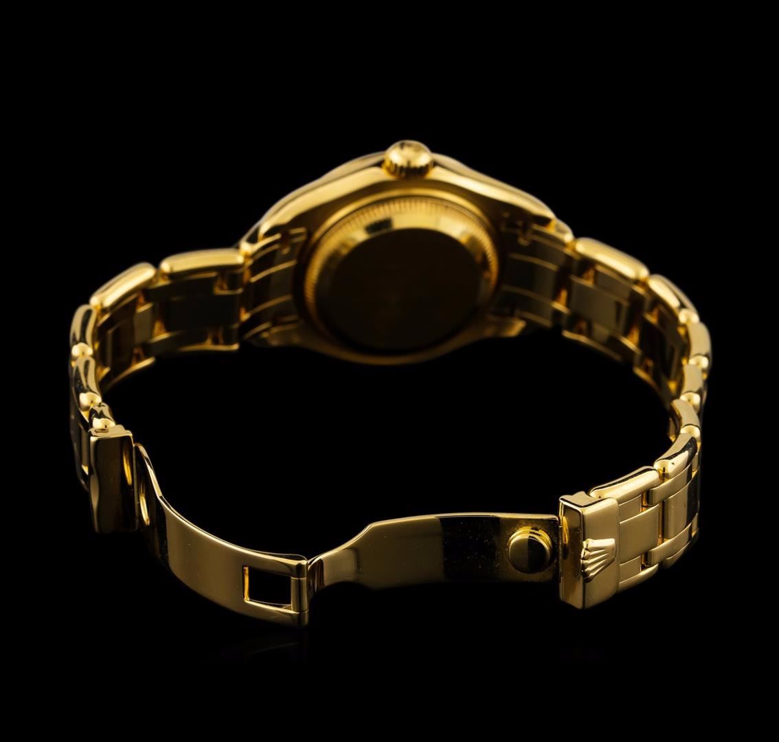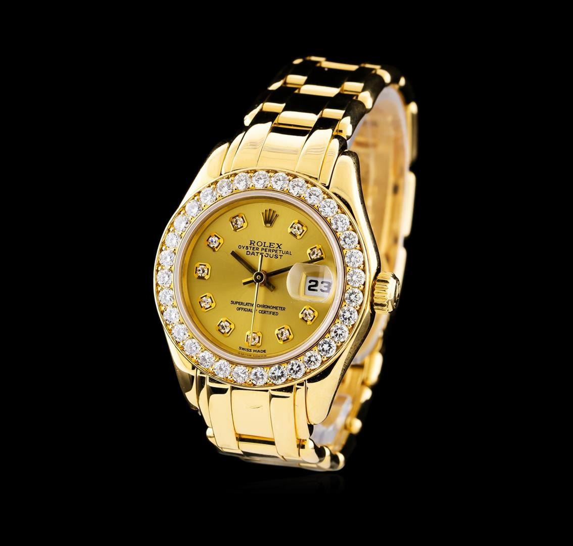 One Rolex Datejust Pearlmaster lady's watch featuring: Case: 29mm 18KT yellow gold. Case Shape: Round. Bezel: 18KT yellow gold set with diamonds. Movement: Automatic. Crystal: Sapphire. Dial: Gold with diamond markers and baton-type hands. Bracelet: 18KT yellow gold Rolex band. Condition: light wear on bracelet and small scratch on crystal near 12 o'clock, but otherwise in great condition.