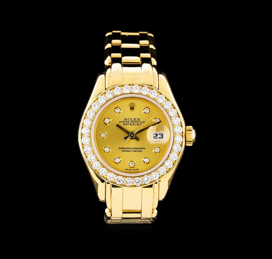 One Rolex Datejust Pearlmaster lady's watch featuring: Case: 29mm 18KT yellow gold. Case Shape: Round. Bezel: 18KT yellow gold set with diamonds. Movement: Automatic. Crystal: Sapphire. Dial: Gold with diamond markers and baton-type hands. Bracelet: 18KT yellow gold Rolex band. Condition: light wear on bracelet and small scratch on crystal near 12 o'clock, but otherwise in great condition.