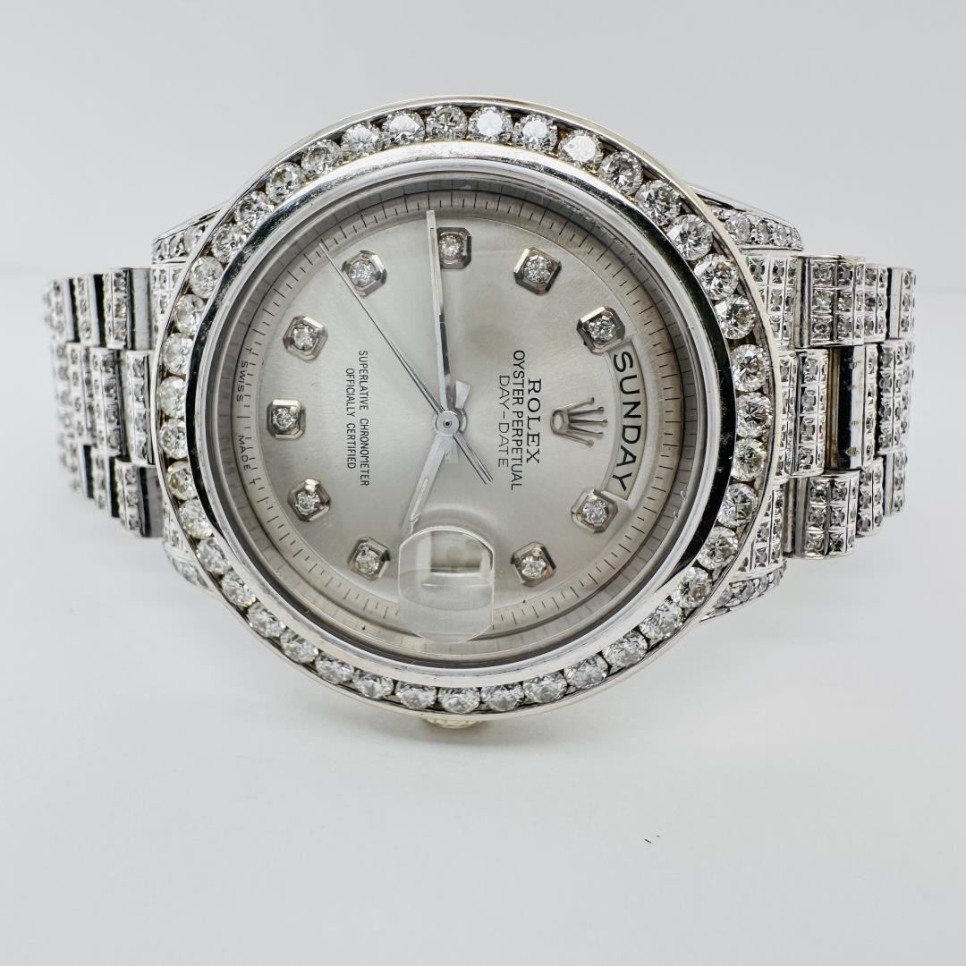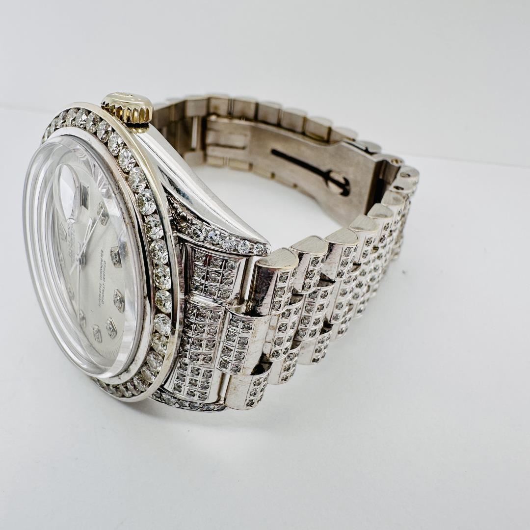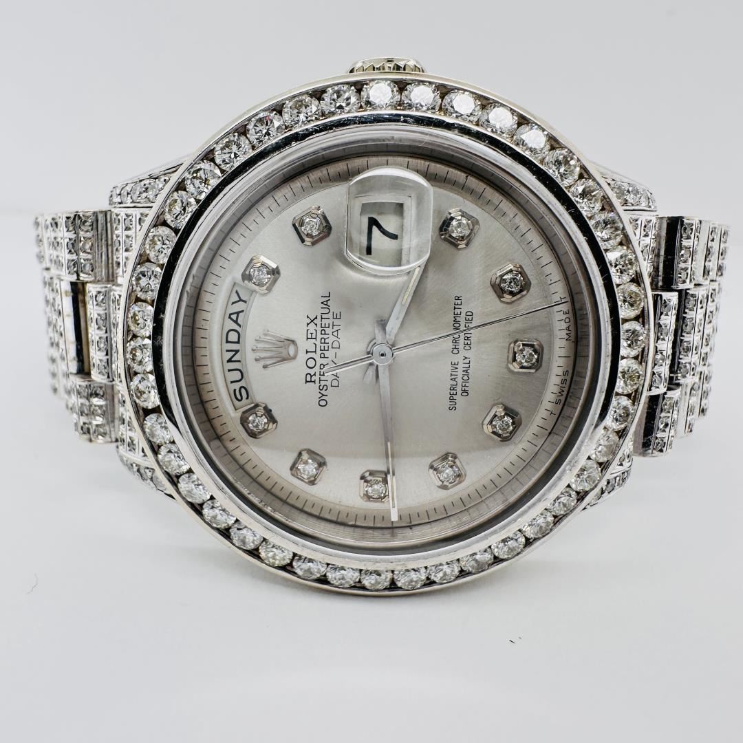 This Rolex Day-Date President (36mm) is crafted in solid 18k white gold, delivering timeless sophistication and luxury. It features a custom diamond bezel, diamond-set lugs, diamond dial markers, and a fully diamond-adorned President bracelet. With its iconic Day-Date display and striking brilliance, this watch is a statement piece designed for discerning collectors who demand both prestige and presence.
