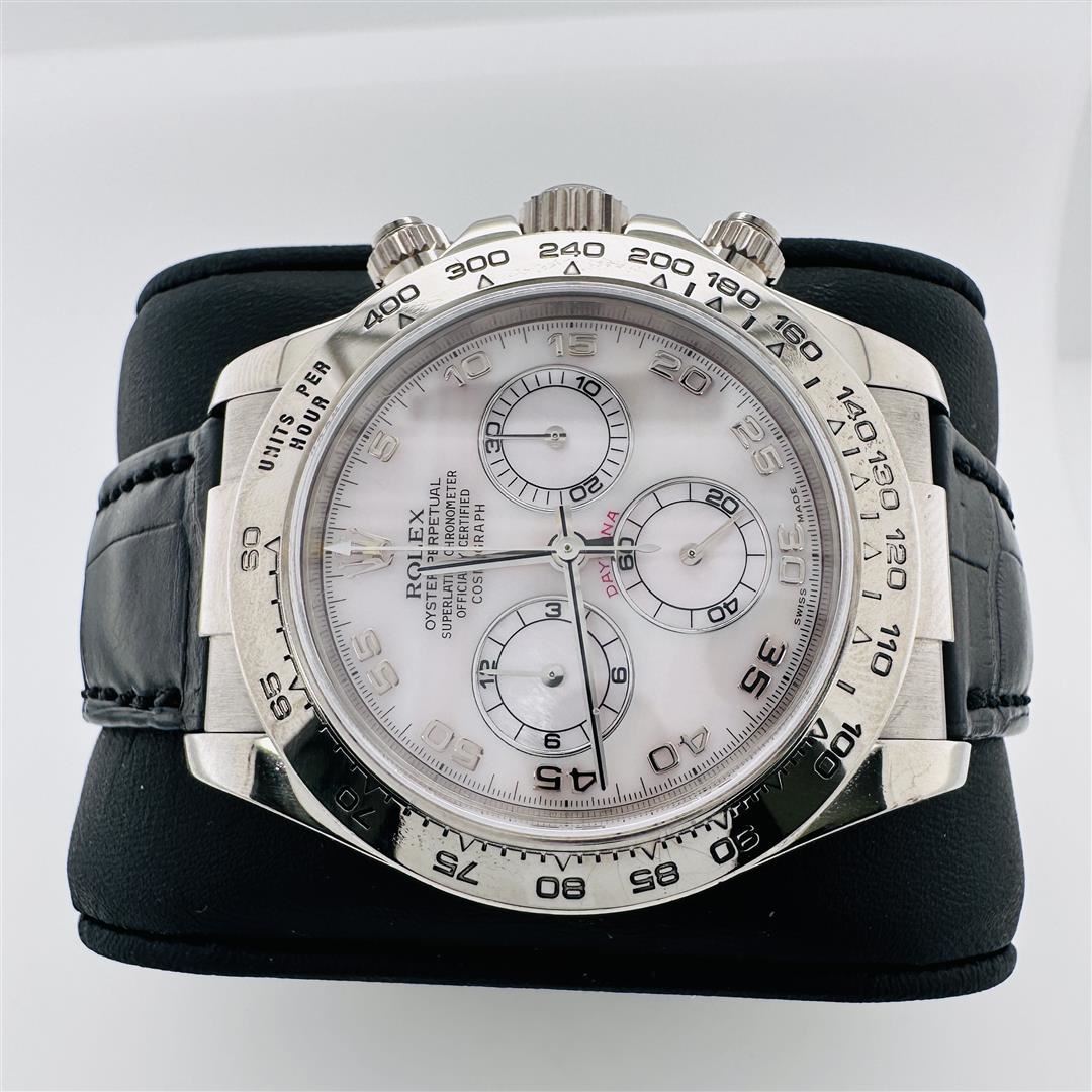 One Rolex Daytona 18k White Gold MoP Dial with Leather Strap Wristwatch (Very Rare). This watch is in excellent condition. The watch photographed is the actual watch.