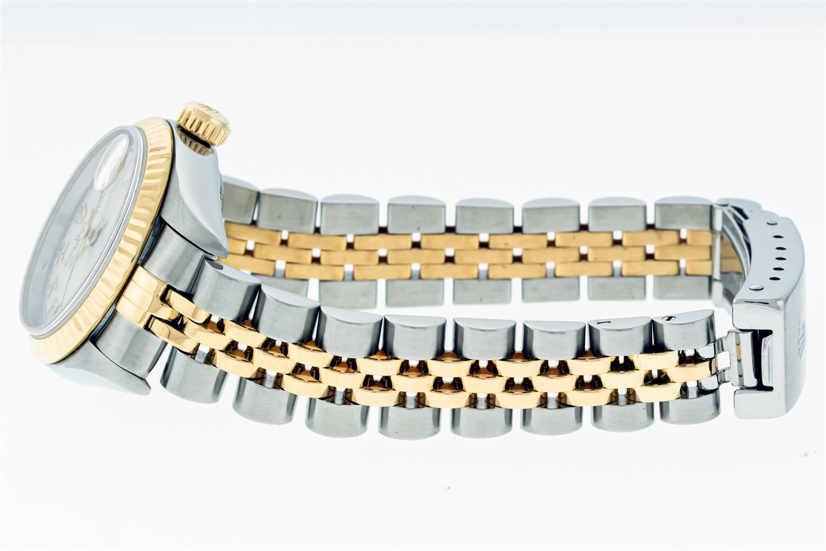 Rolex Ladies Pre Owned Sapphire Quickset 18K Yellow Gold and Stainless Steel Two Tone Oyster Perpetual Datejust Polished Bright with Satin Finish, Serviced & Electronically Tested, Rolex Stainless Steel Case: 26mm, Rolex 18K Yellow Gold Crown, Rolex Bezel: Rolex 18K Yellow Gold Fluted Bezel. Crystal: Sapphire With Magnified Date Window. Custom Hands: New Hands. Rolex Movement: Automatic Winding Movement 2235. Rolex Dial: Rolex Silver Pyramid Roman Dial. Date Window: 3 O'Clock Position Date Display, Model: Quickset Datejust, Condition: G-6 Extra Fine. Rolex Bracelet: 18K Yellow Gold & Stainless Steel Jubilee Band. Bright Polish & Satin Finish. 6.0 Inch Length, Adjustable. Standard Clasp, With Rolex Logo. This Watch Has Been Serviced Time Tested And Is In Excellent Condition It Is Free Of All Scratches And Dents. This Watch Comes With A Rolex Box.