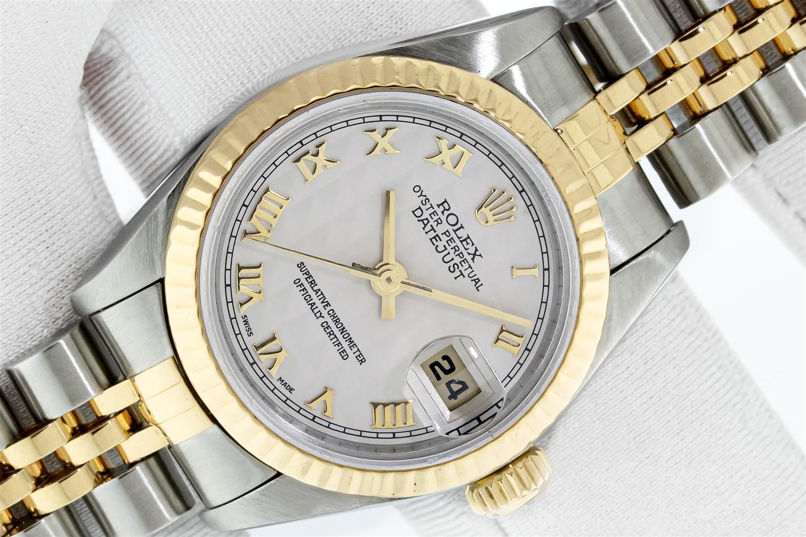 Rolex Ladies Pre Owned Sapphire Quickset 18K Yellow Gold and Stainless Steel Two Tone Oyster Perpetual Datejust Polished Bright with Satin Finish, Serviced & Electronically Tested, Rolex Stainless Steel Case: 26mm, Rolex 18K Yellow Gold Crown, Rolex Bezel: Rolex 18K Yellow Gold Fluted Bezel. Crystal: Sapphire With Magnified Date Window. Custom Hands: New Hands. Rolex Movement: Automatic Winding Movement 2235. Rolex Dial: Rolex Silver Pyramid Roman Dial. Date Window: 3 O'Clock Position Date Display, Model: Quickset Datejust, Condition: G-6 Extra Fine. Rolex Bracelet: 18K Yellow Gold & Stainless Steel Jubilee Band. Bright Polish & Satin Finish. 6.0 Inch Length, Adjustable. Standard Clasp, With Rolex Logo. This Watch Has Been Serviced Time Tested And Is In Excellent Condition It Is Free Of All Scratches And Dents. This Watch Comes With A Rolex Box.
