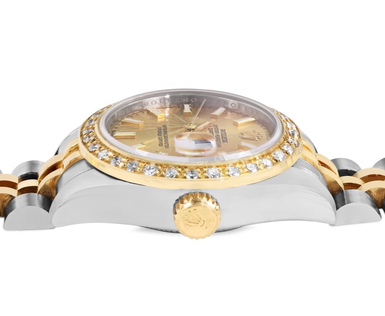 One Rolex Ladies Pre Owned Two Tone 18K Yellow Gold And Stainless Steel Rolex Datejust Polished, Serviced & Electronically Tested, Rolex Yellow Gold And Stainless Steel Case: 26mm, Rolex Yellow Gold Crown. Custom Bezel: New 18K Yellow Gold Beadset Diamond Bezel, Diamond Count: 32 Diamonds On Bezel. Crystal: Sapphire Crystal With Date Window. Hands: Luminescent Hands. Rolex Movement: 2235 Automatic Winding Movement. Rolex Dial: Factory Champagne Index Dial. Date Window: 3 O'Clock Position Date Display, Condition: G-6 Extra Fine. Rolex Bracelet: Two Tone 18K Yellow Gold And Stainless Steel Jubilee Band. Bright Polish And Satin Finish. 6.0 Inch Length, Adjustable. Hidden Clasp, With Rolex Logo. This Watch Has Been Serviced Time Tested And Is In Excellent Condition It Is Free Of All Scratches And Dents. This Watch Comes With A Rolex Box.